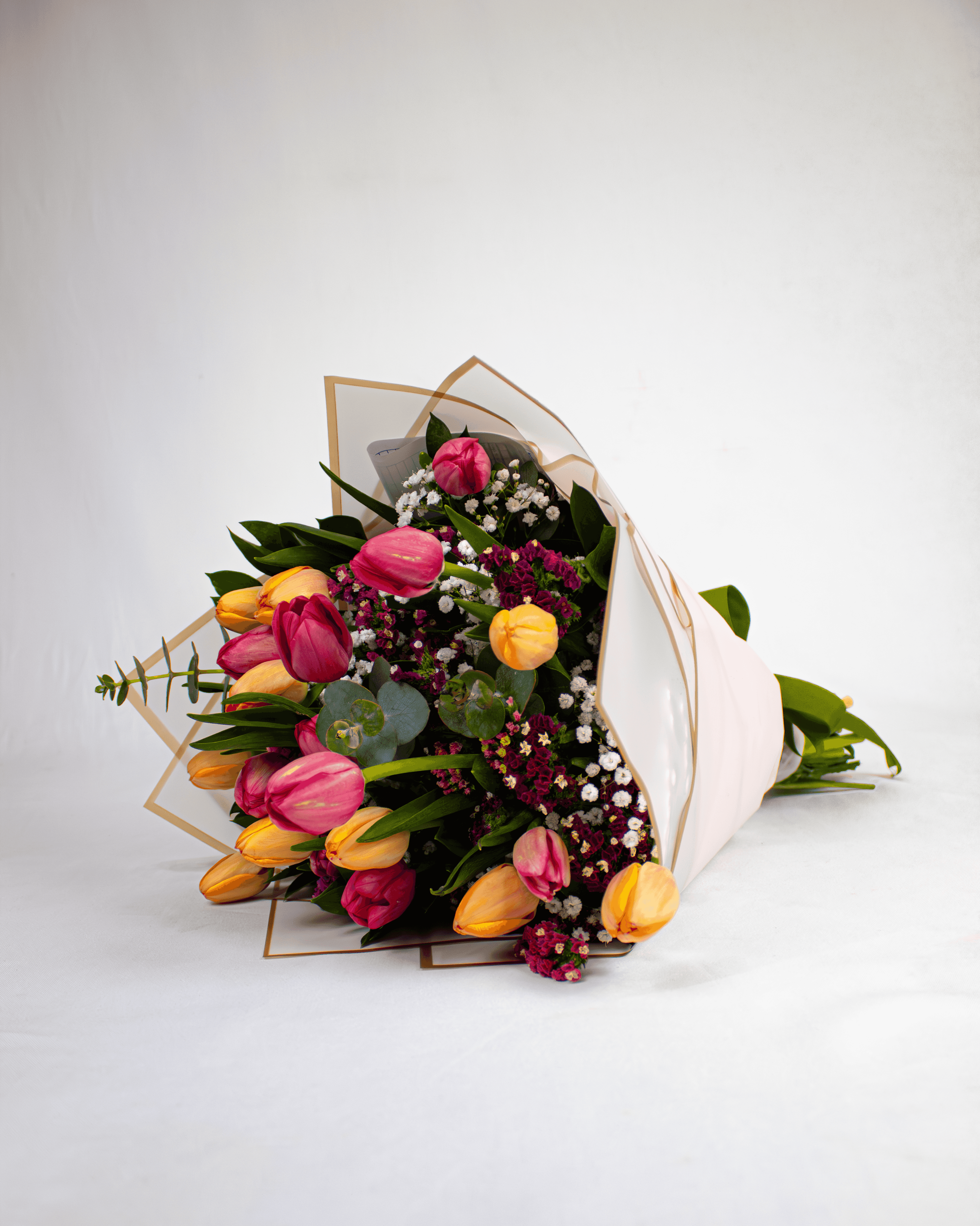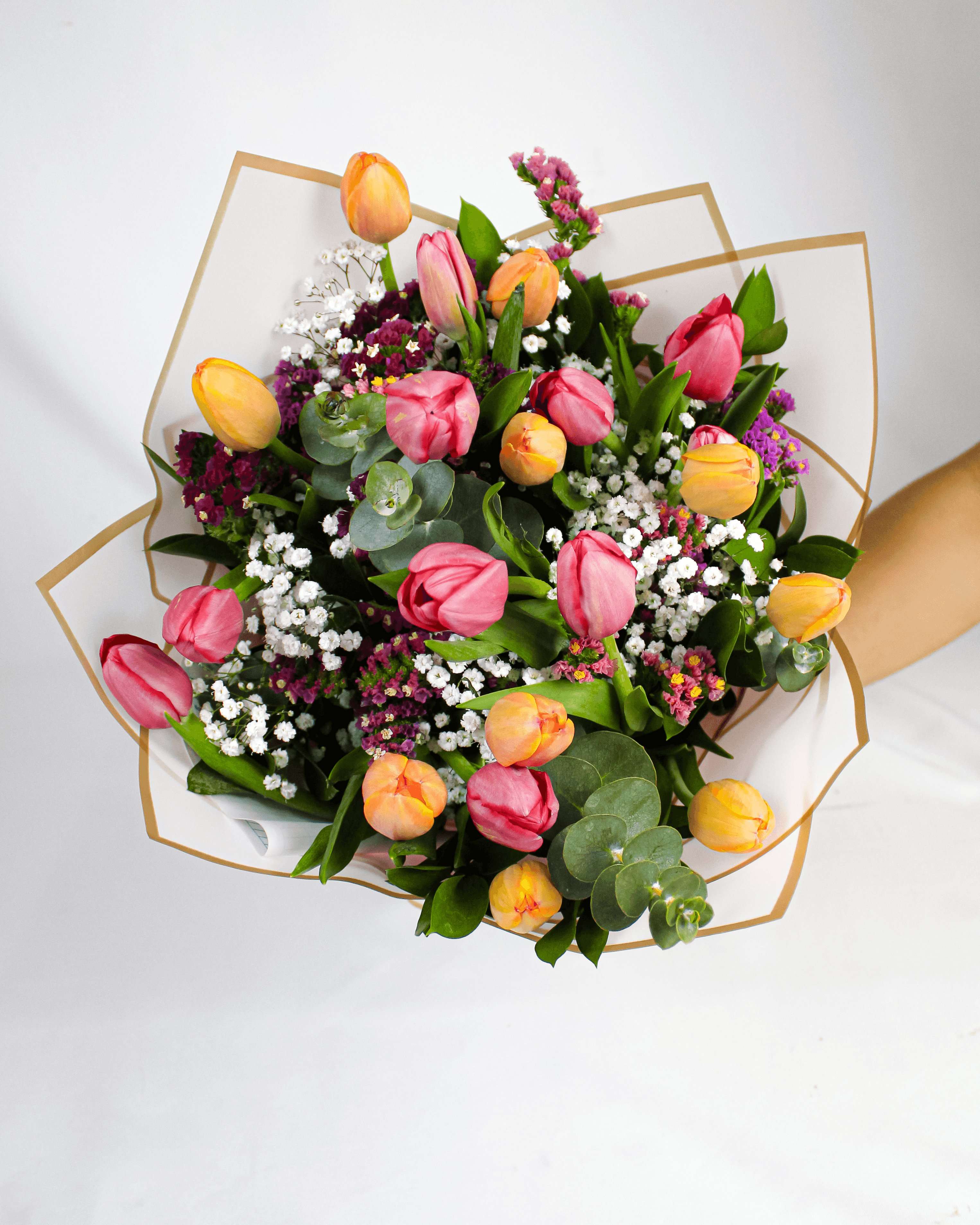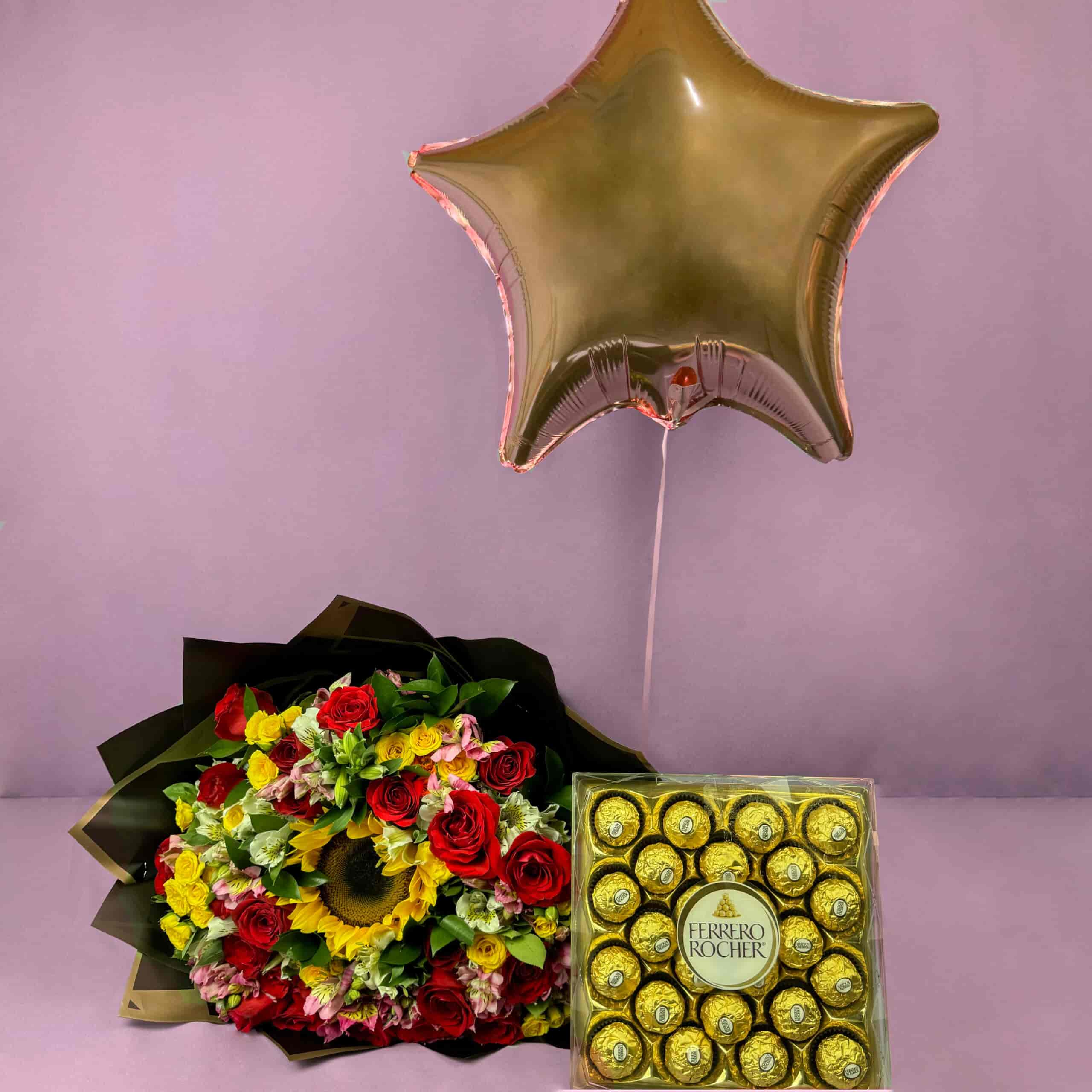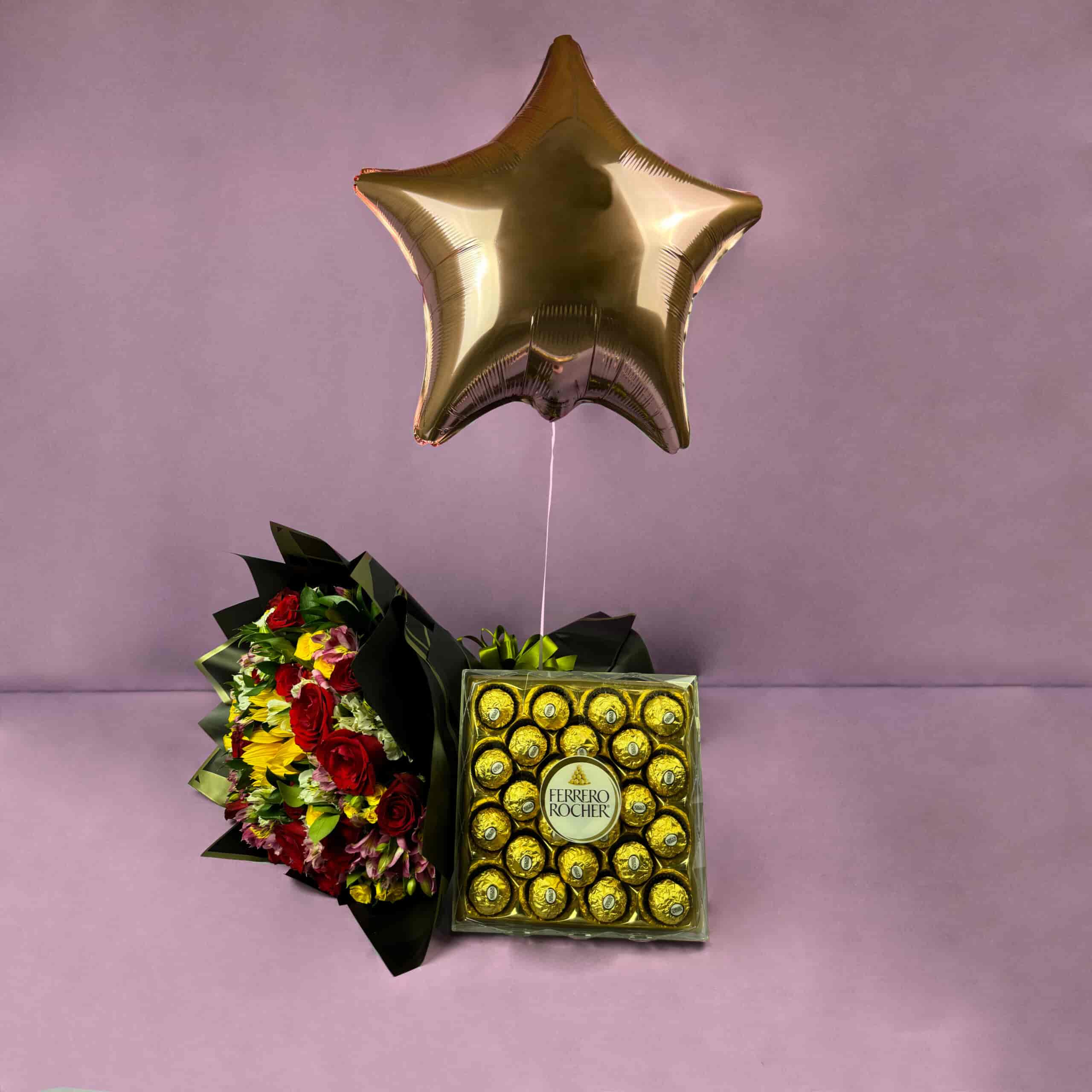 Bouquet 24 Rosas con Follaje, Peluche Panda y Globo Corazón