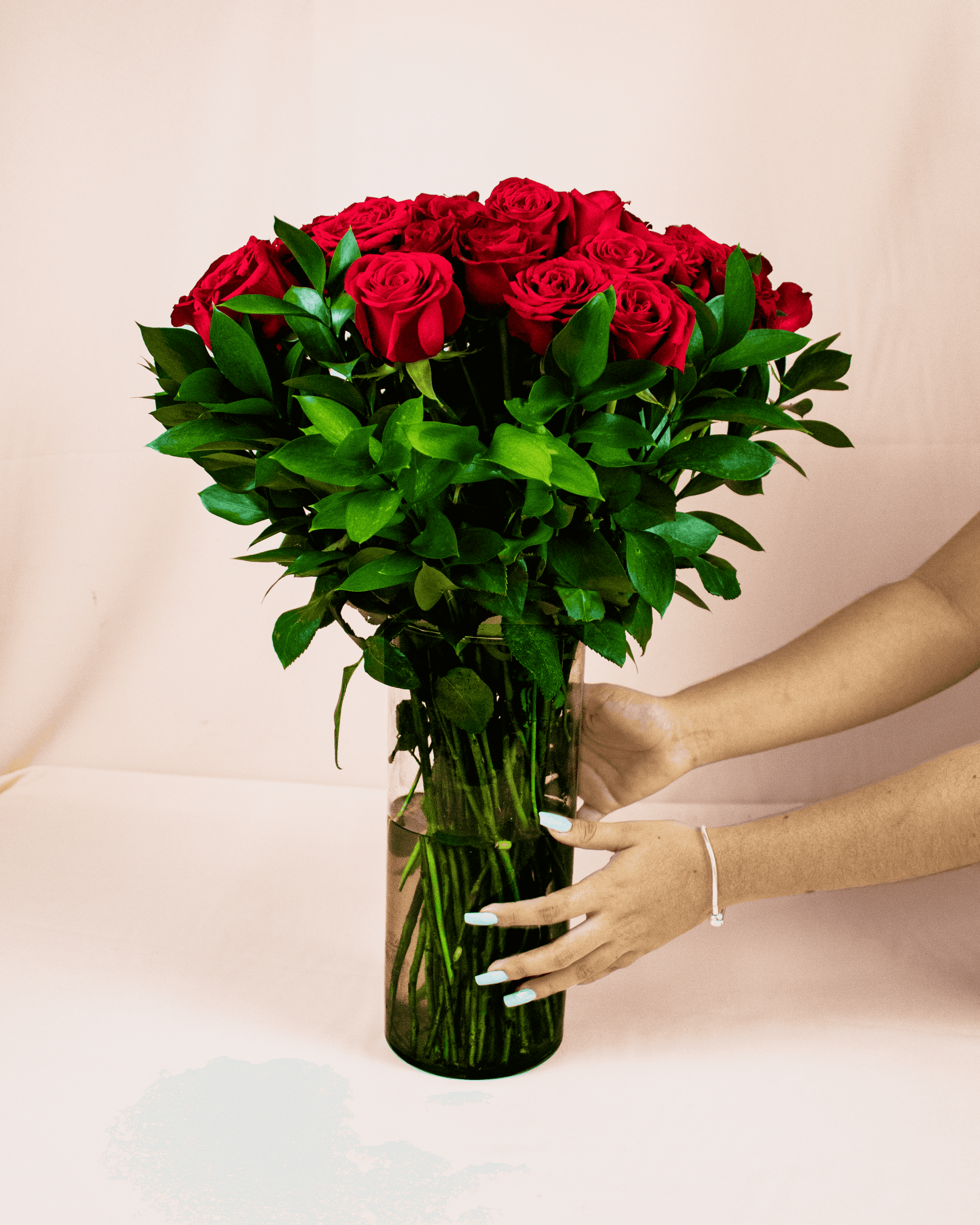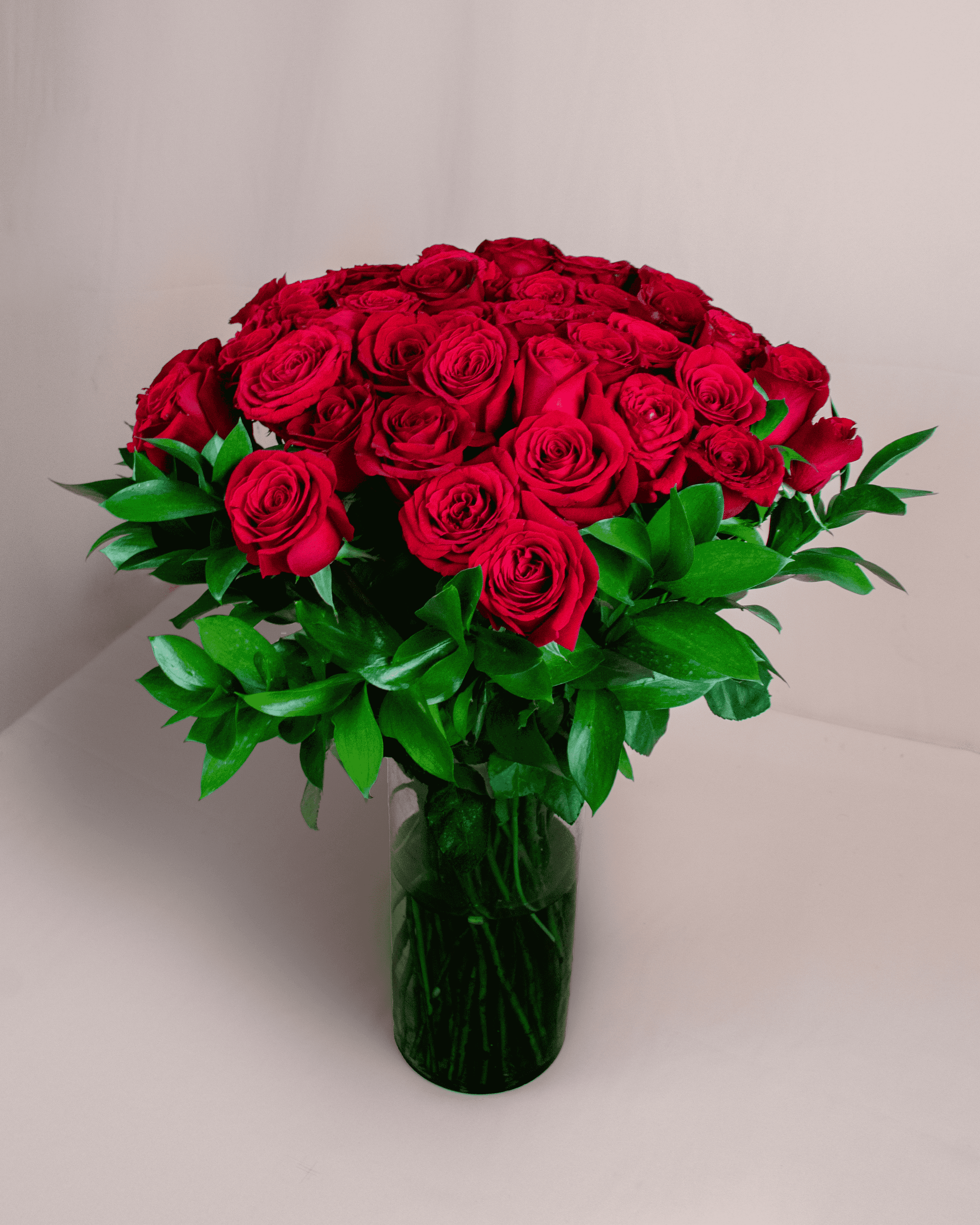 Clásico regalo floral que incluye un jarrón de vidrio con 50 rosas rojas.