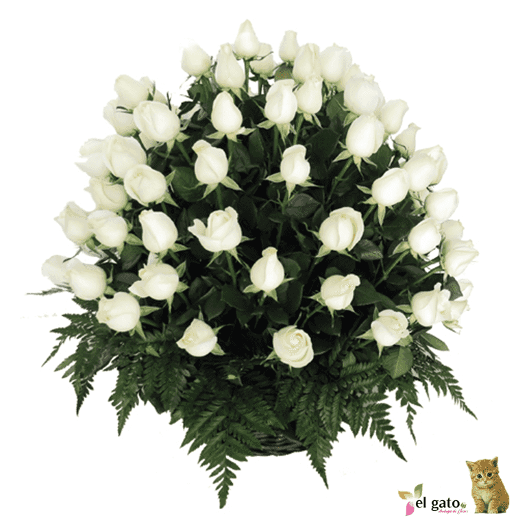 Arreglo en canasta de carrizo con 60 rosas blancas y leather.