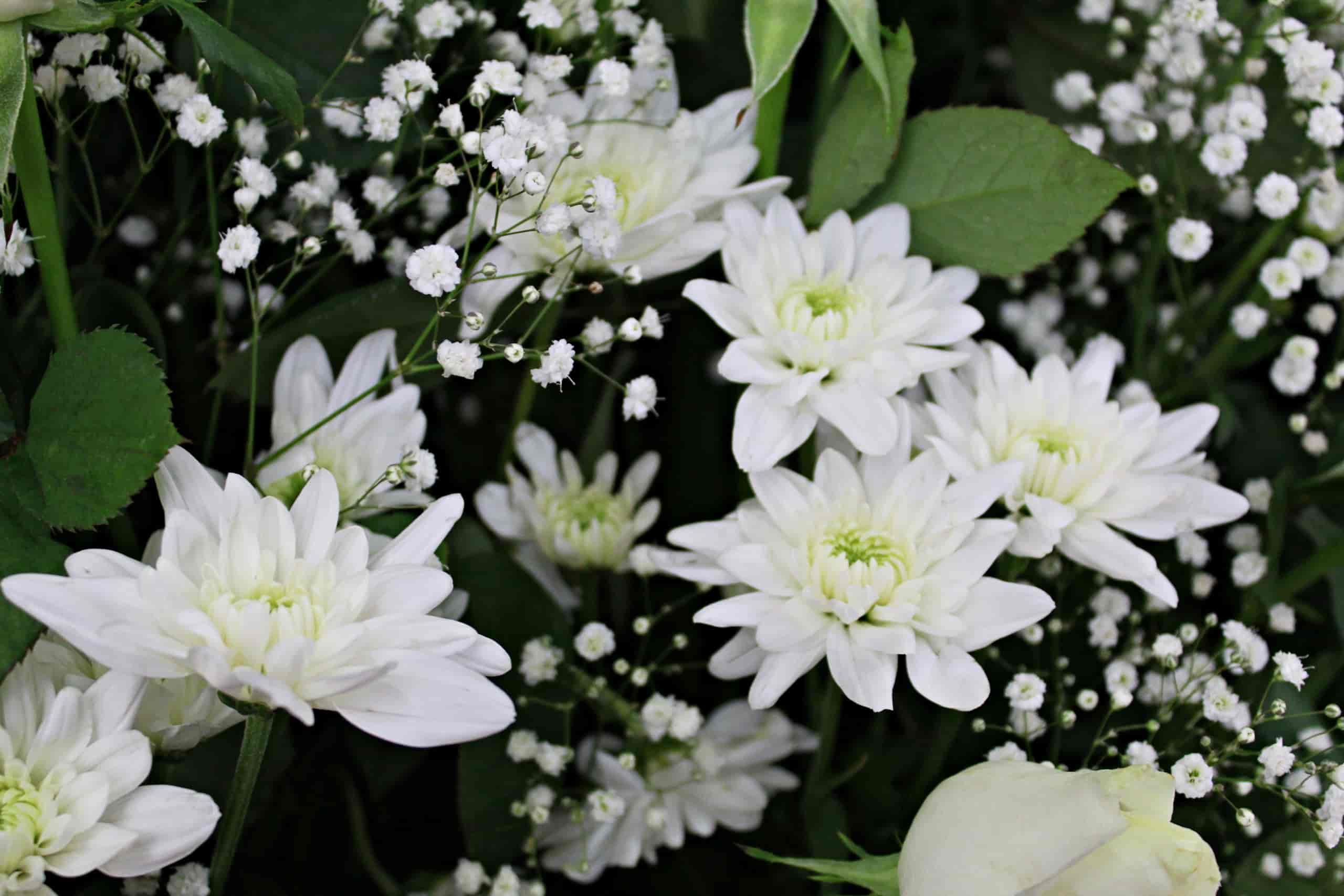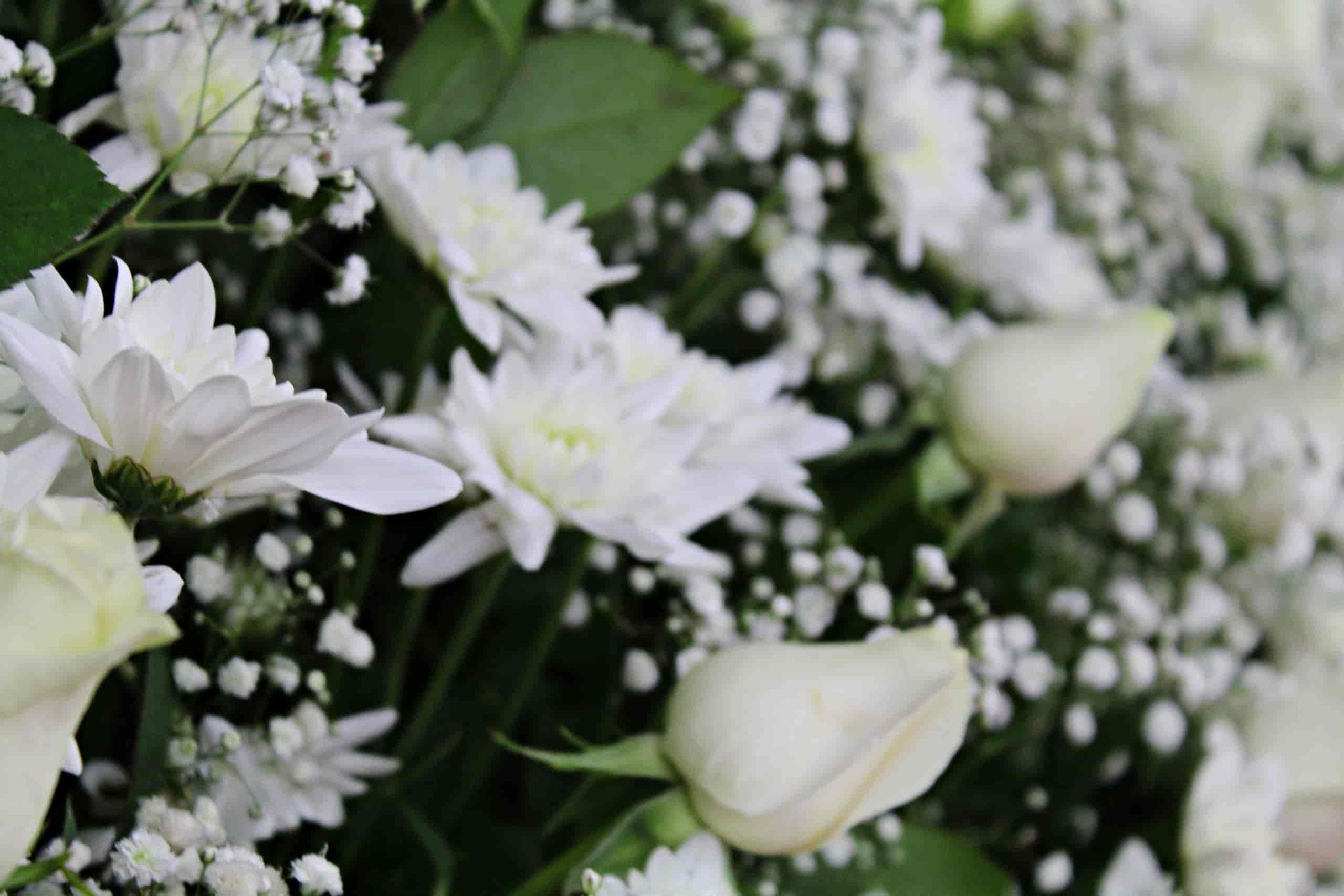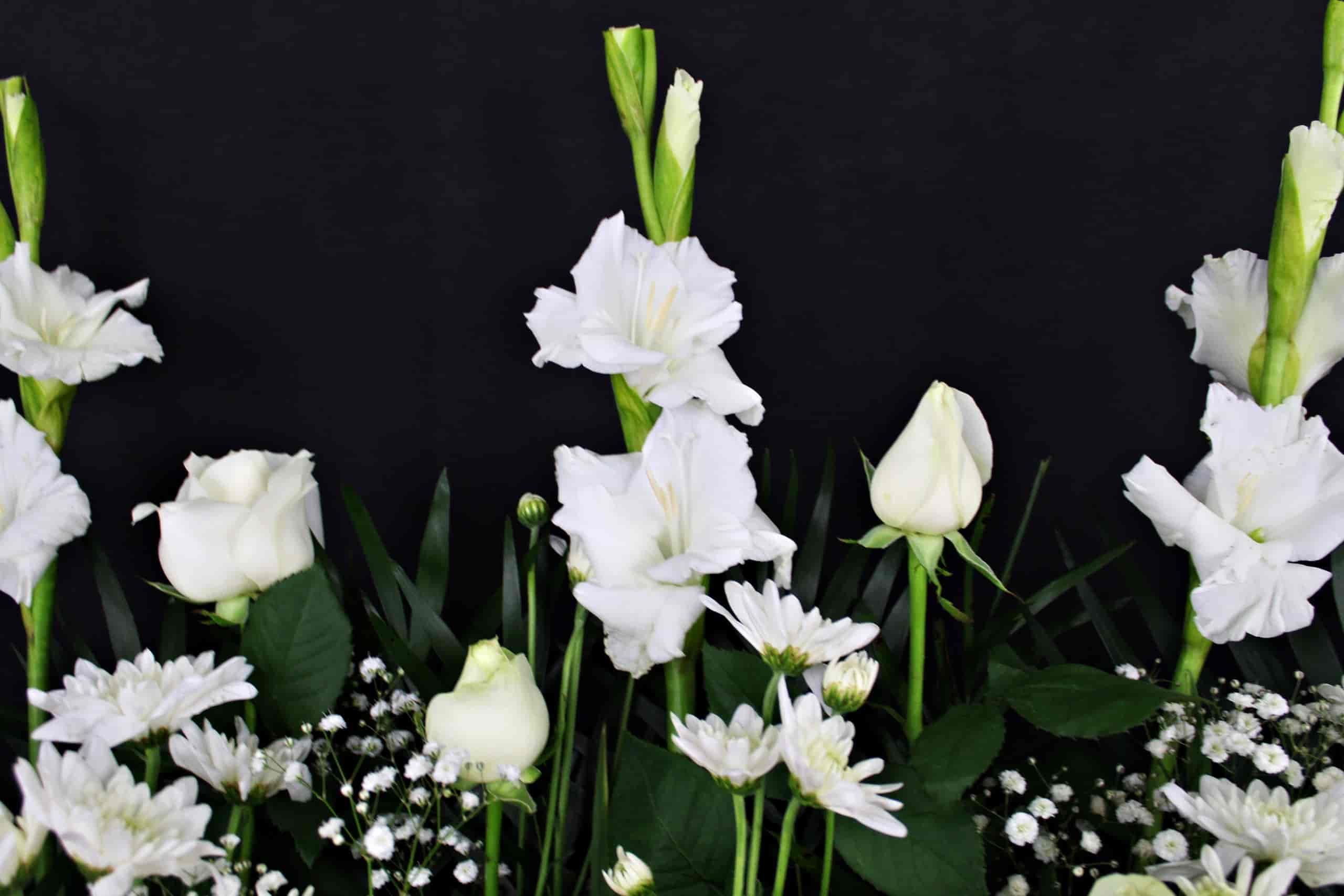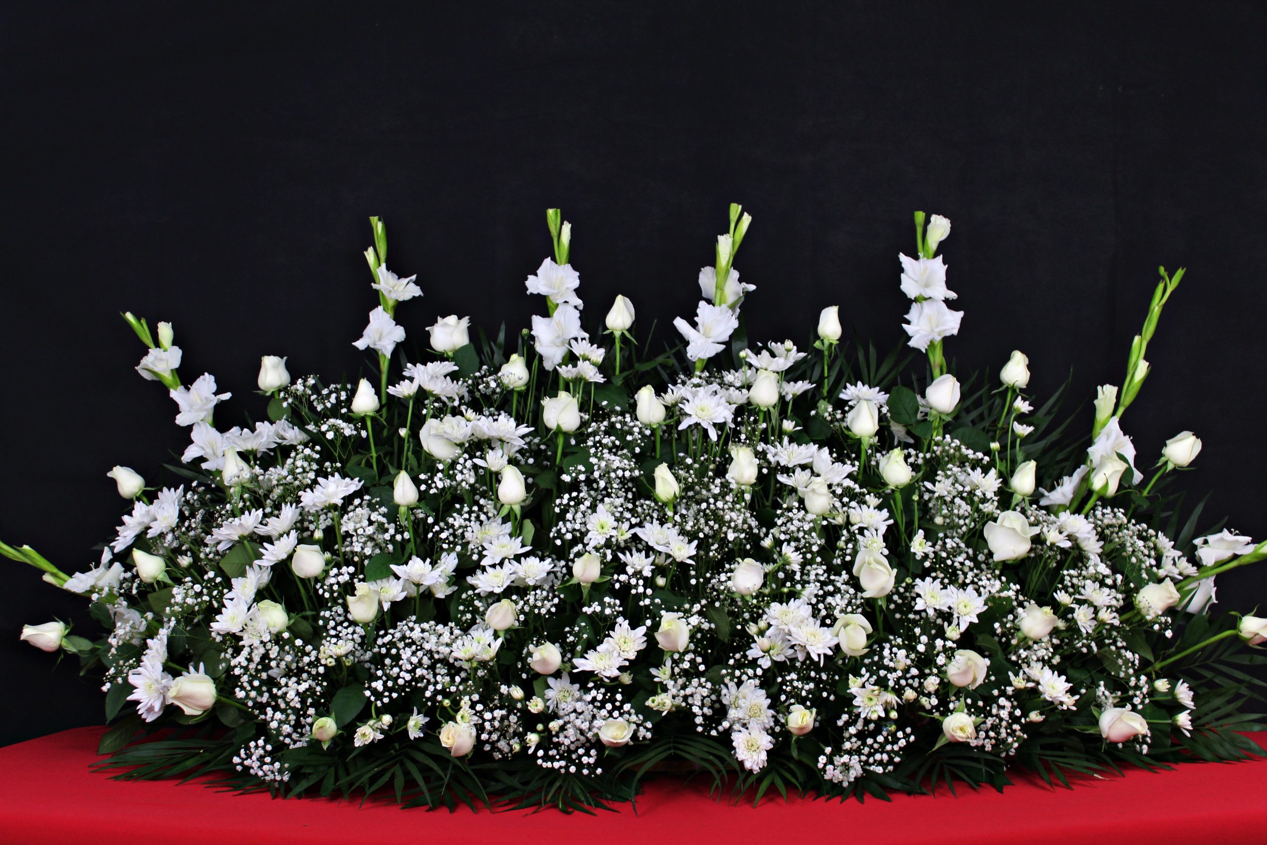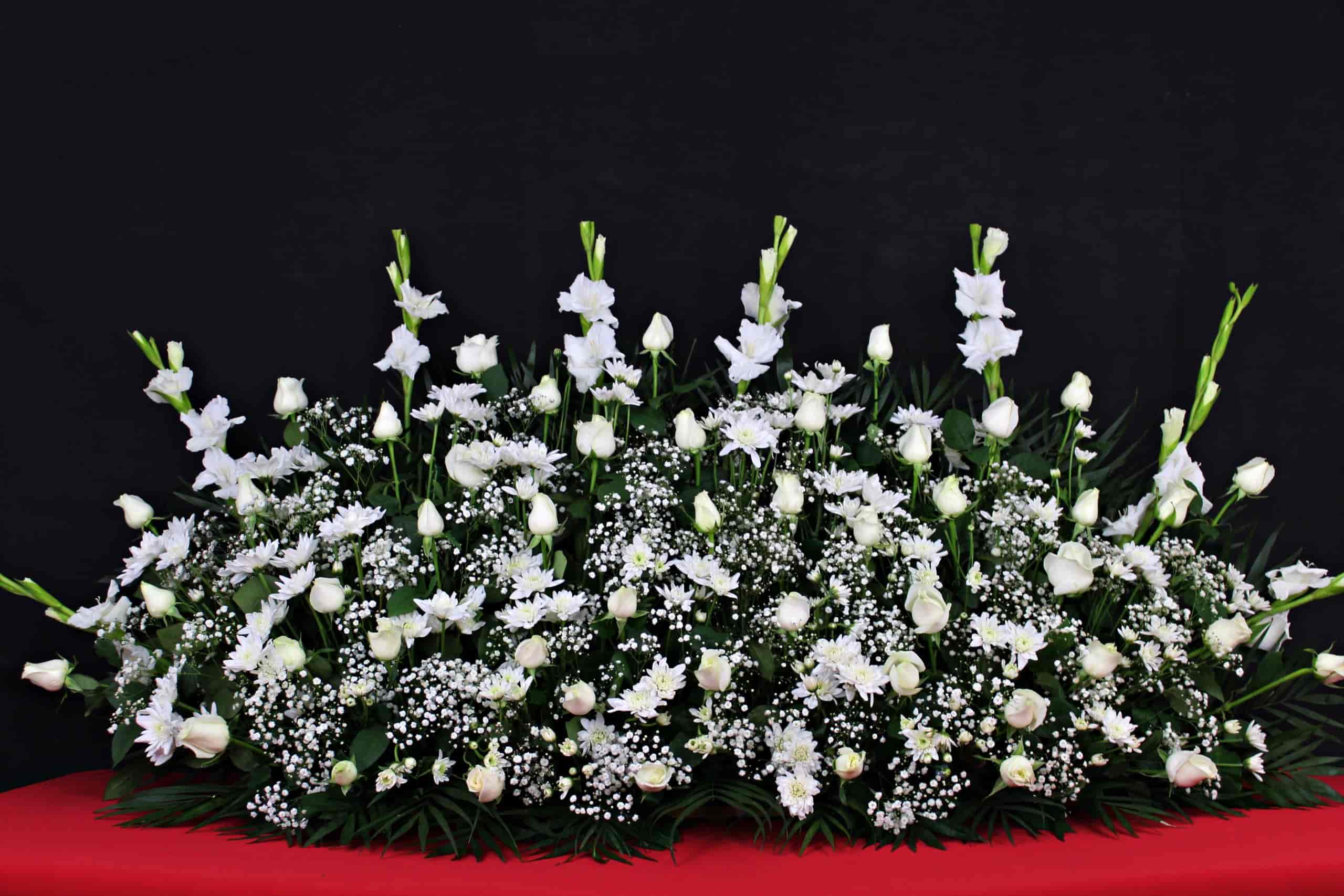 Adorno con flores blancas para iglesia, en su composición tiene gladiolas y rosas que hacen resaltar su belleza. Para alguna ceremonia importante este regalo es el adecuado.