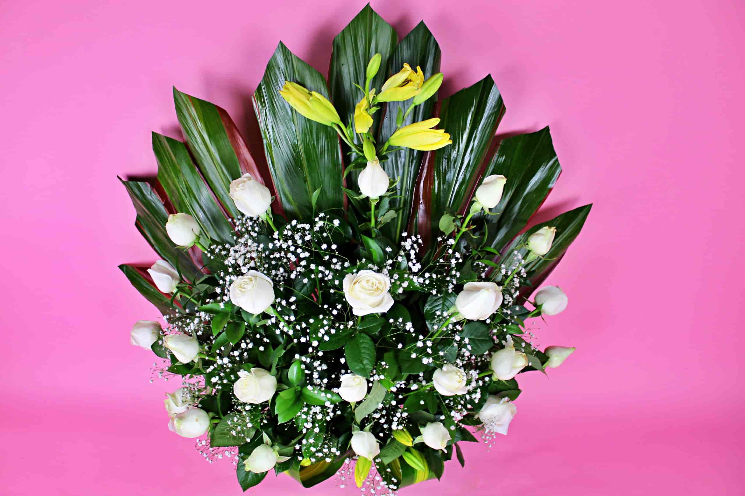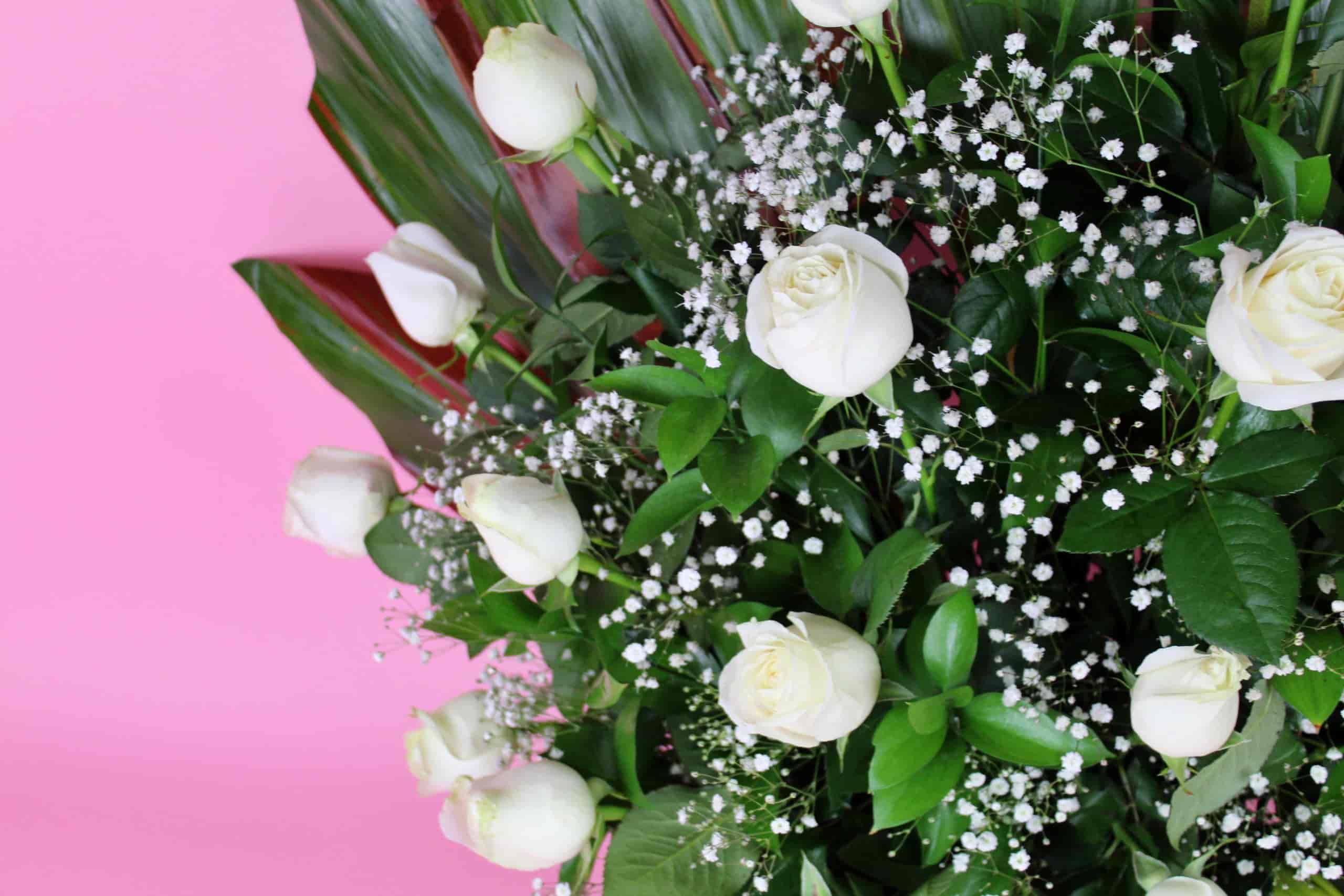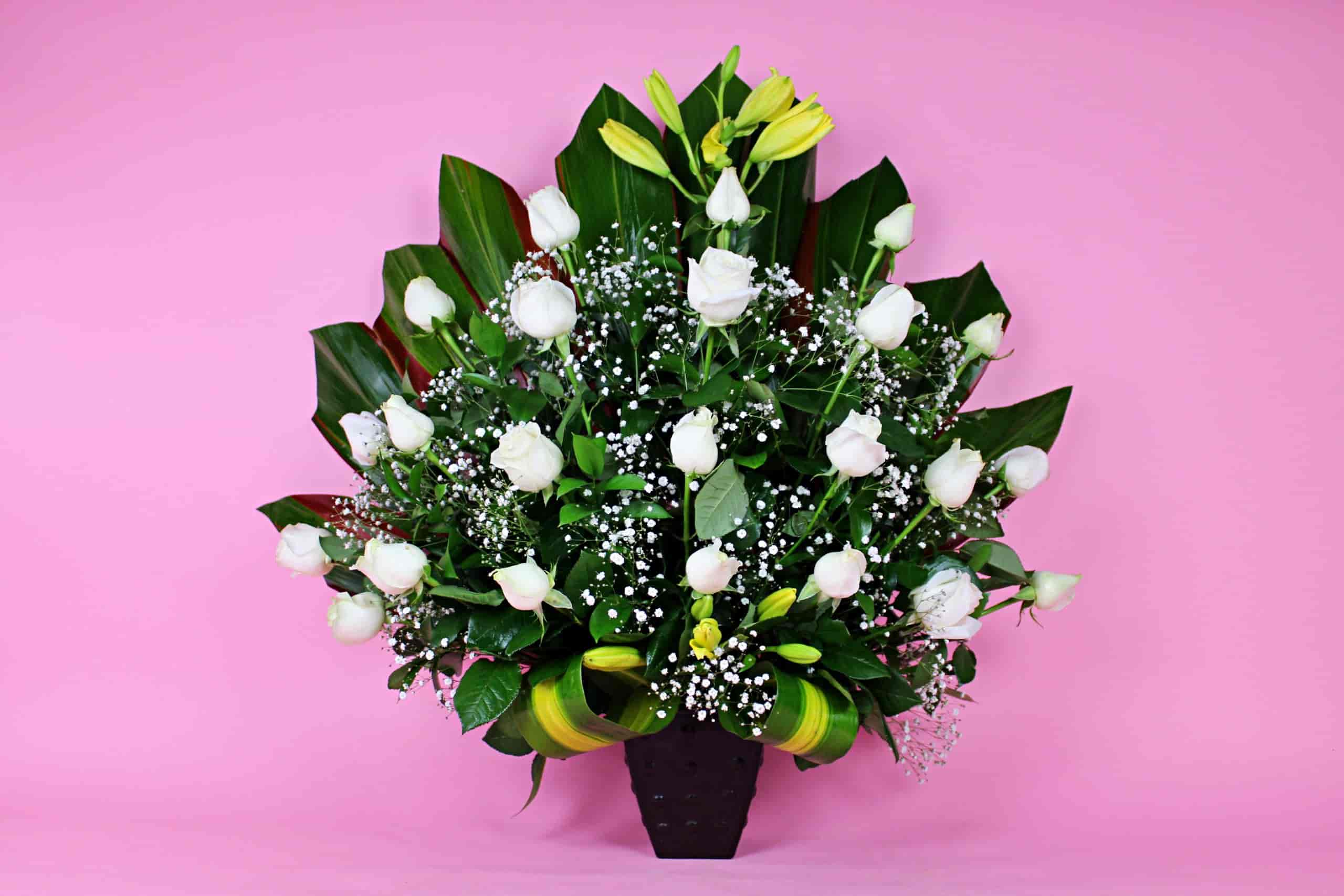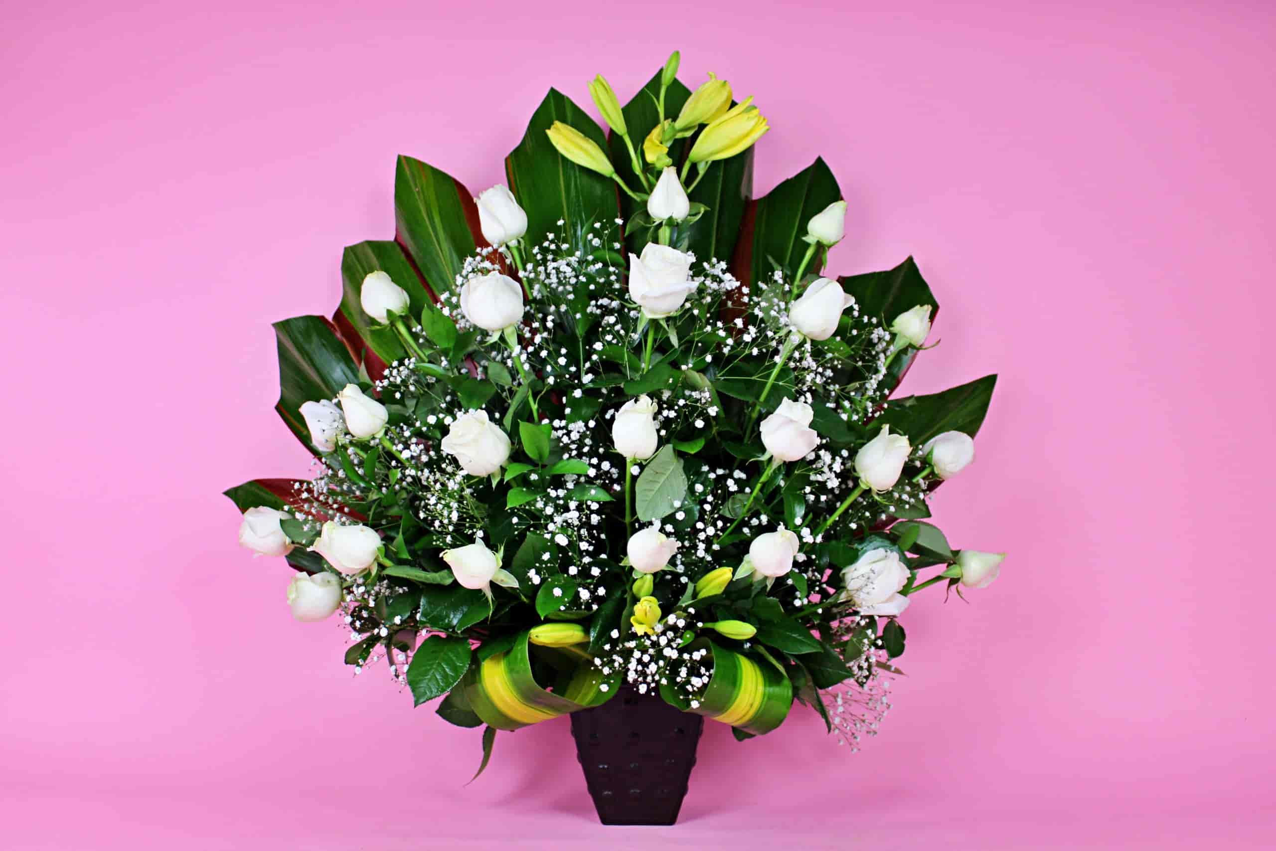 Regalo floral elaborado con rosas en color blanco, con un diseño único y elegante.