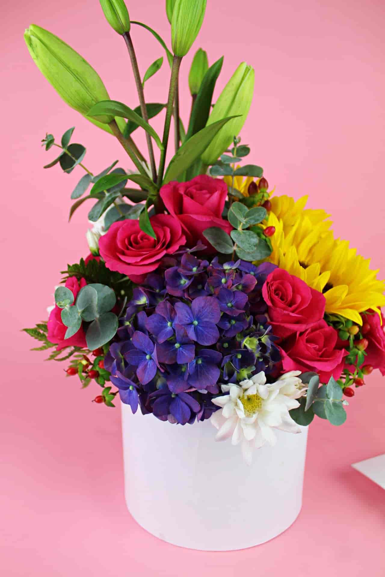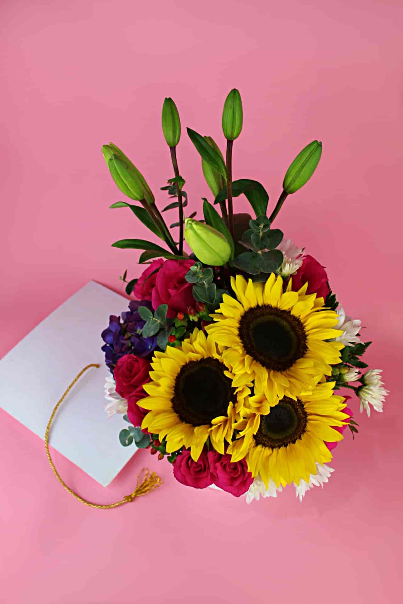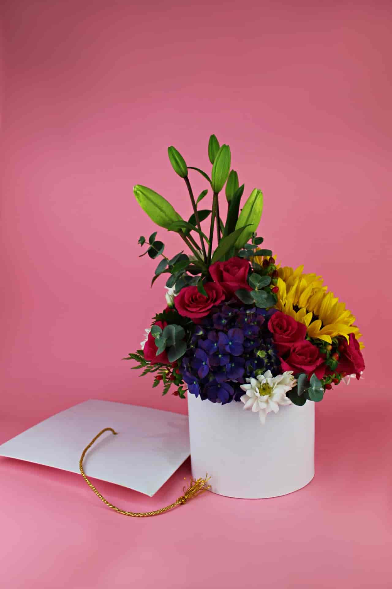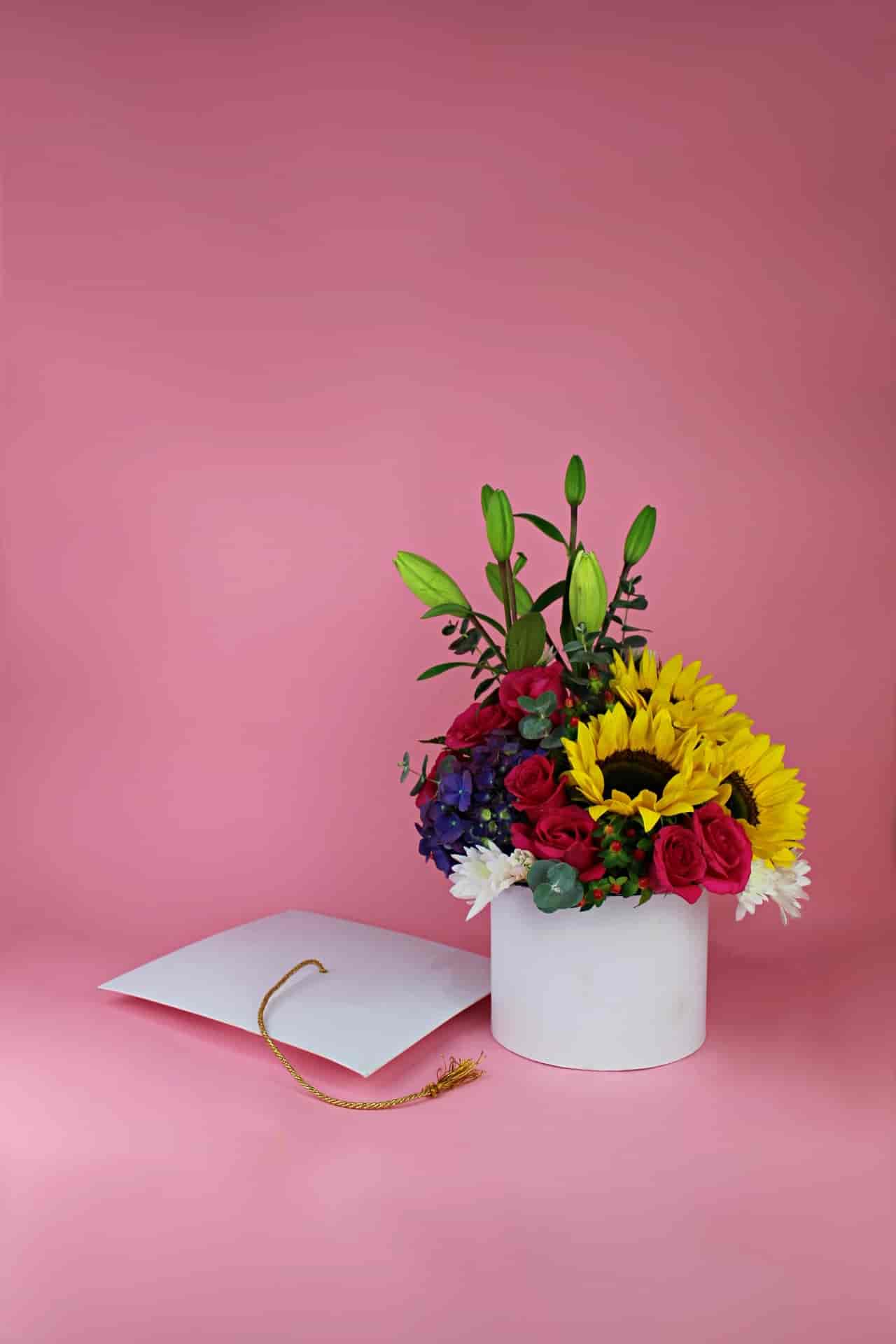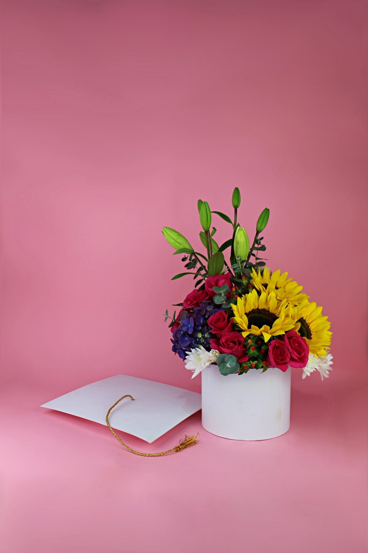 Arreglo de graduación en forma de birrete elaborado con lili, rosa fucsia, margarita blanca, girasol, hortensia de color y follajes.