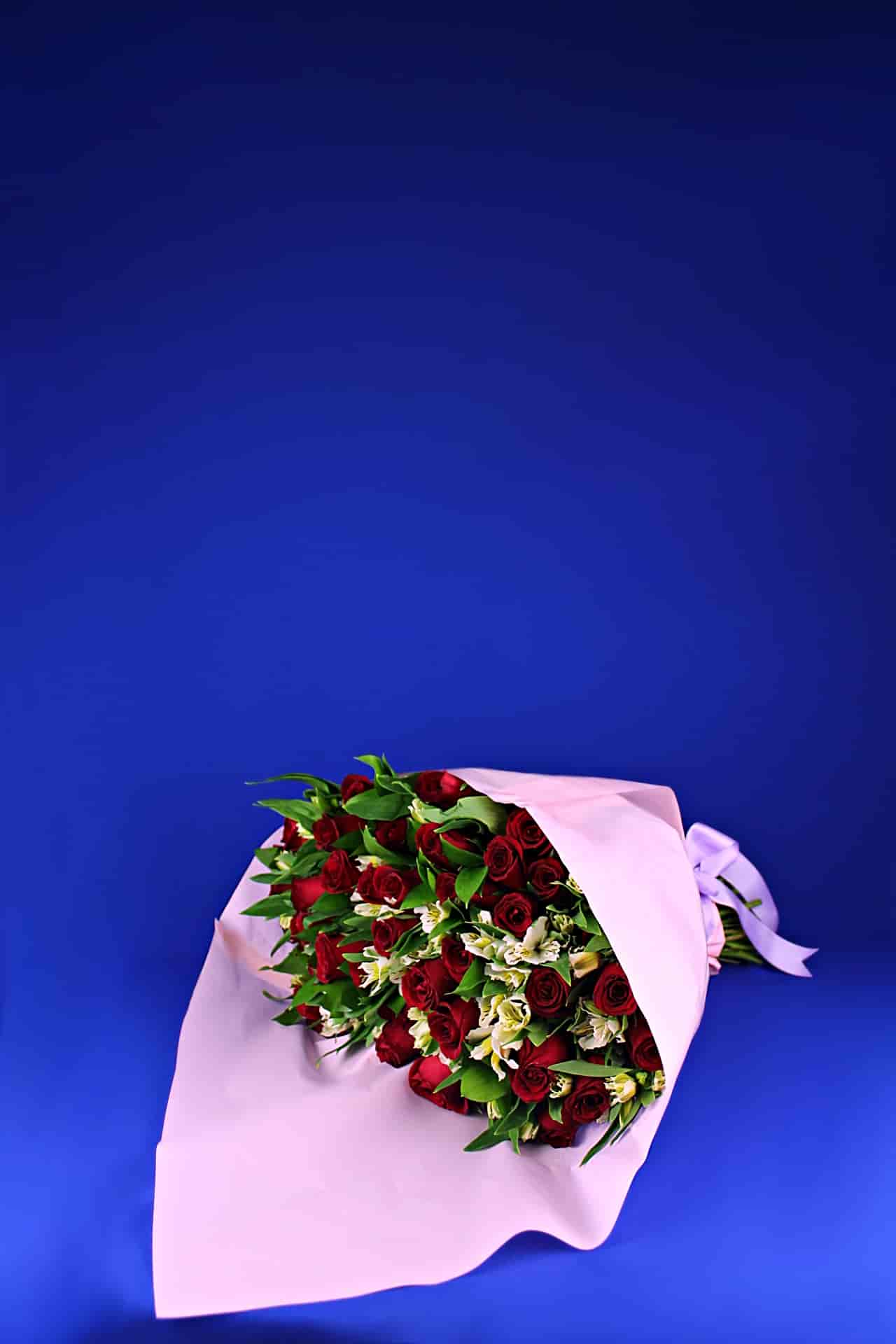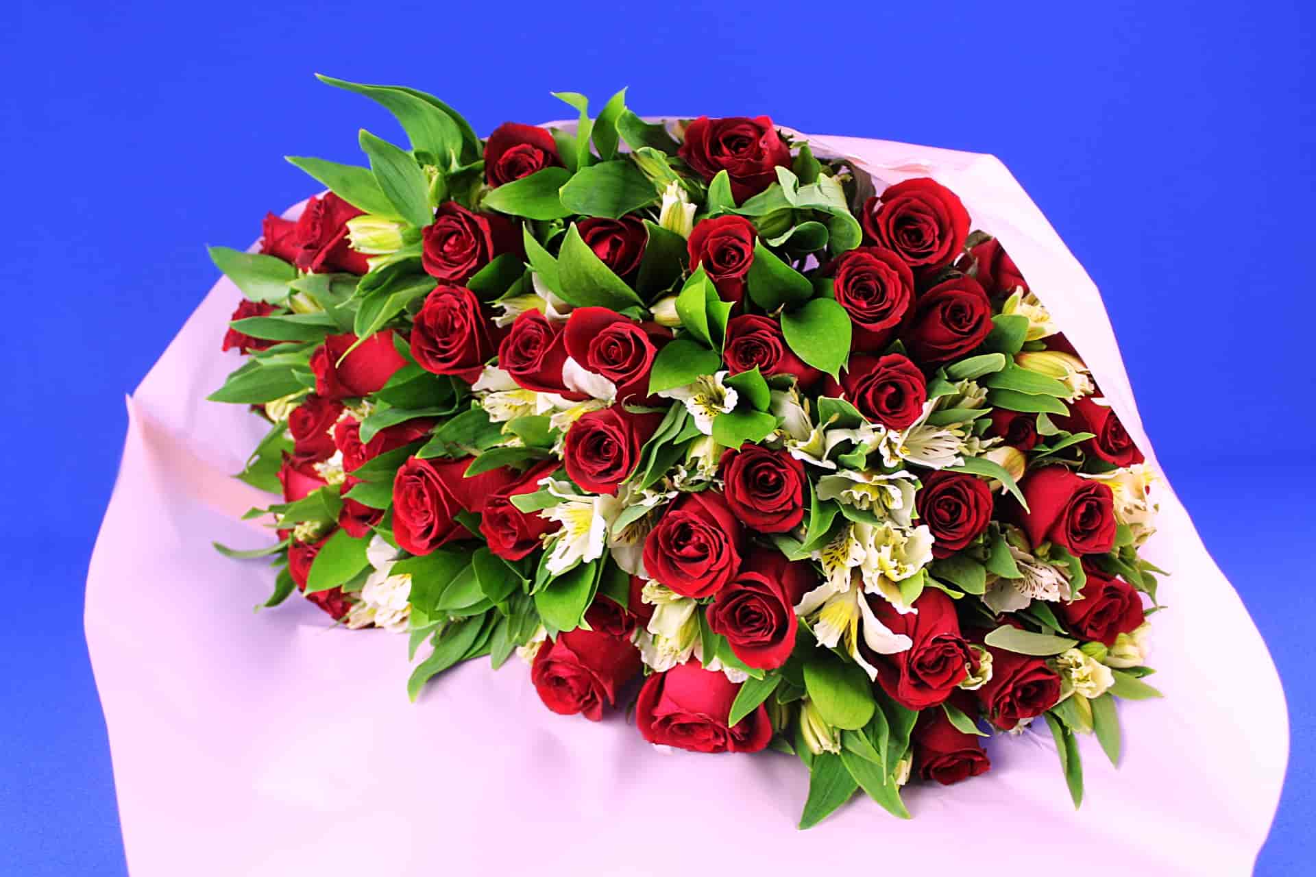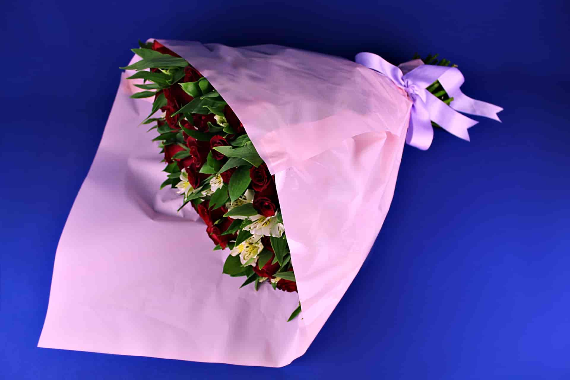 Ramo de 48 rosas rojas con alstroemeria y envoltura plastificada color rosa pastel.