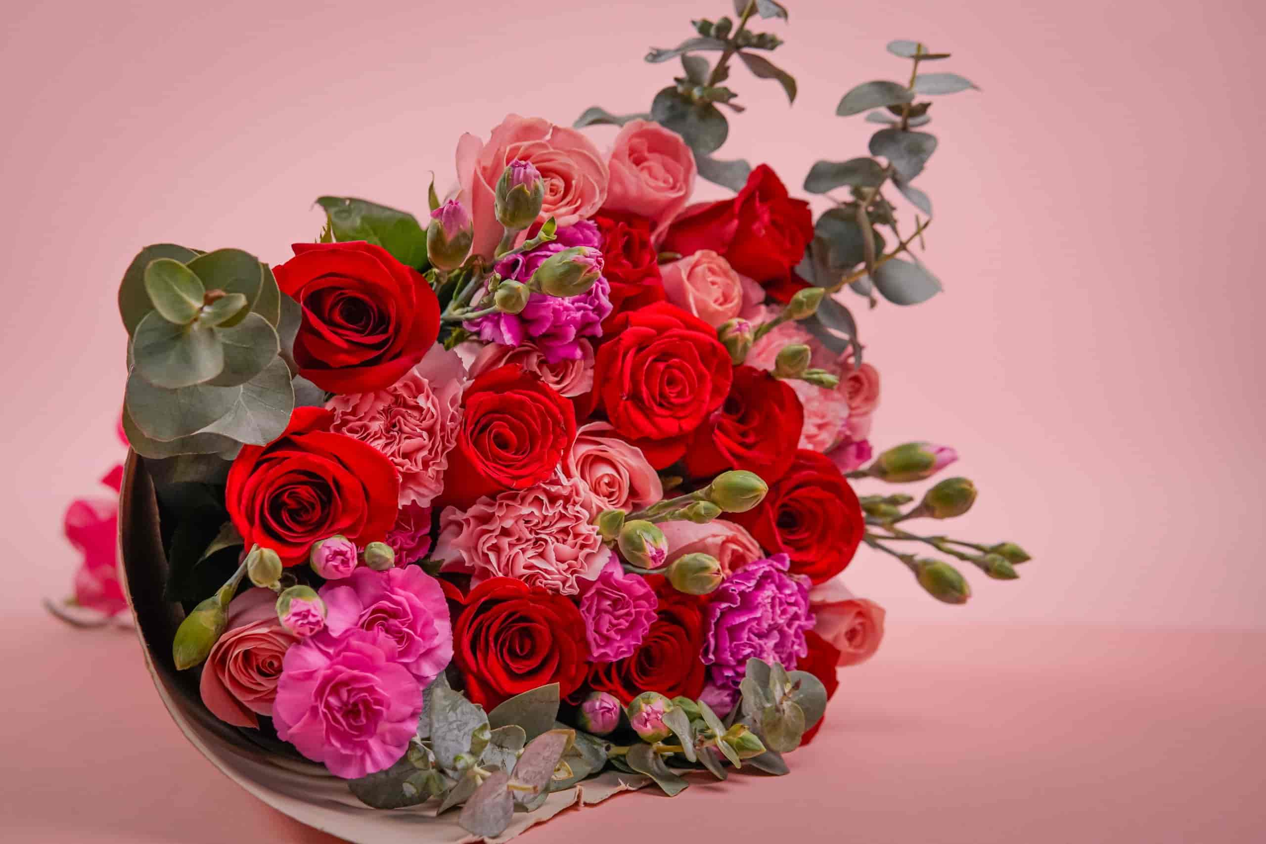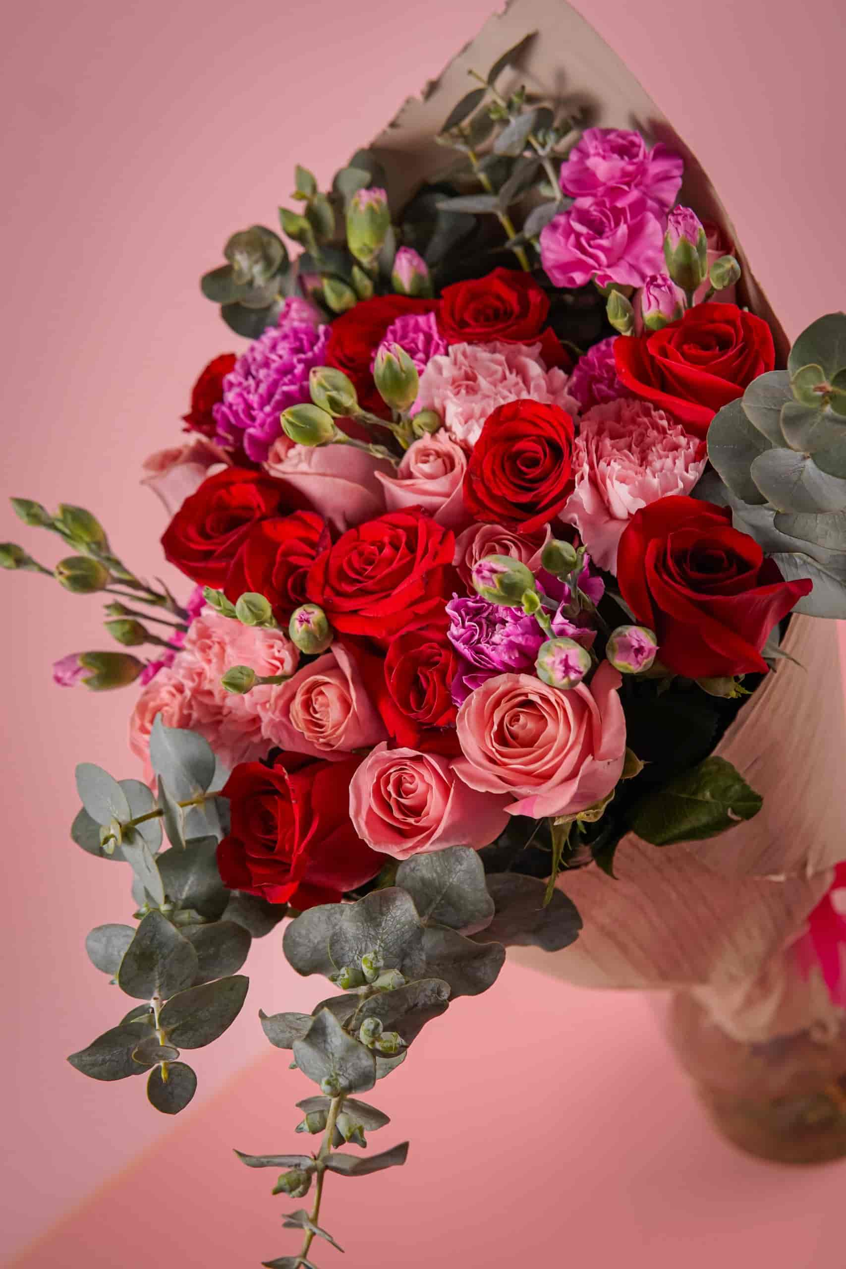 Bouquet de 12 rosas y 12 claveles surtidos en colores con follaje (dolar, clavellina)