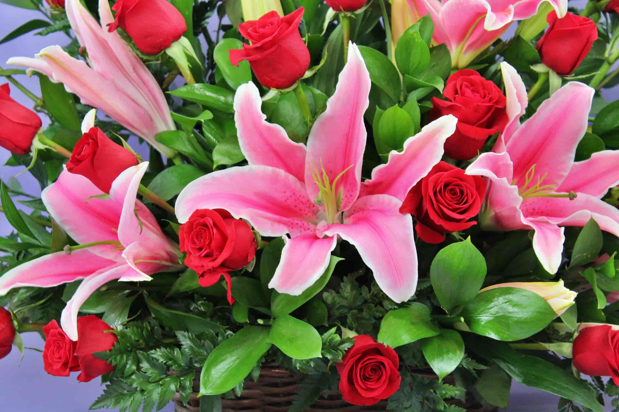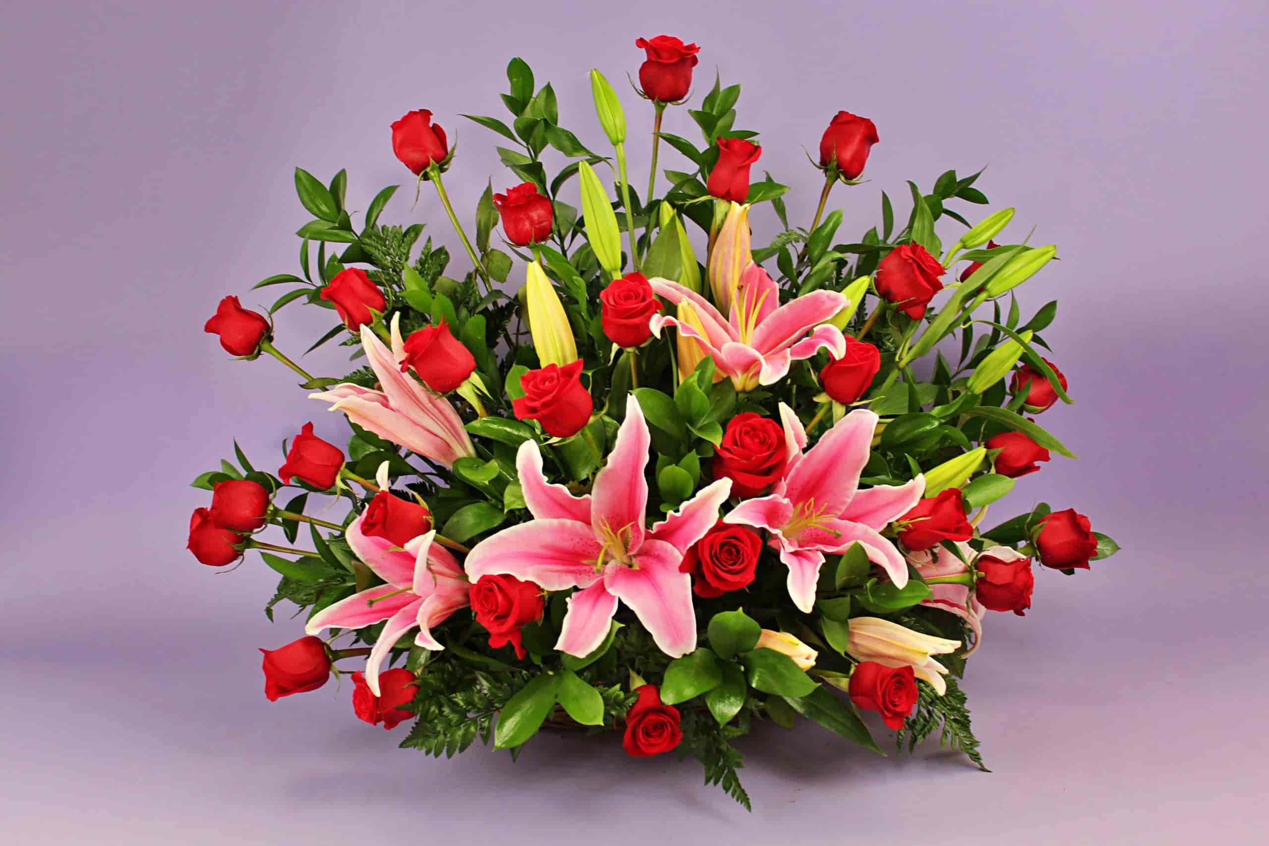 Canasta de madera decorada con rosas rojas y flores de lilium stargazer en plena antesis. Su fragancia sin duda conquistará tu corazón.