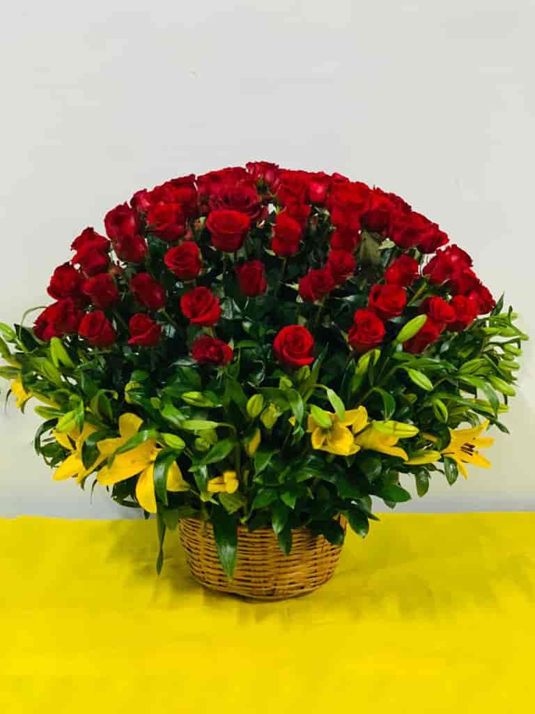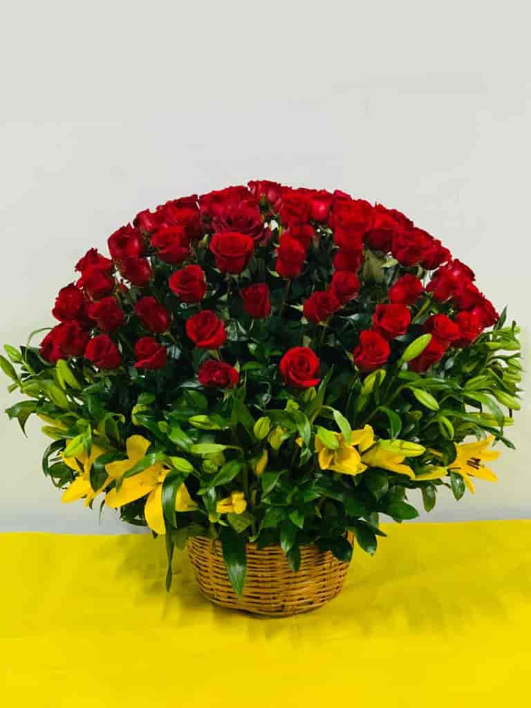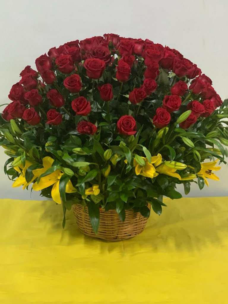 Canasta carrizo de 100 rosas y lilis, acompañado de follaje ruscus.