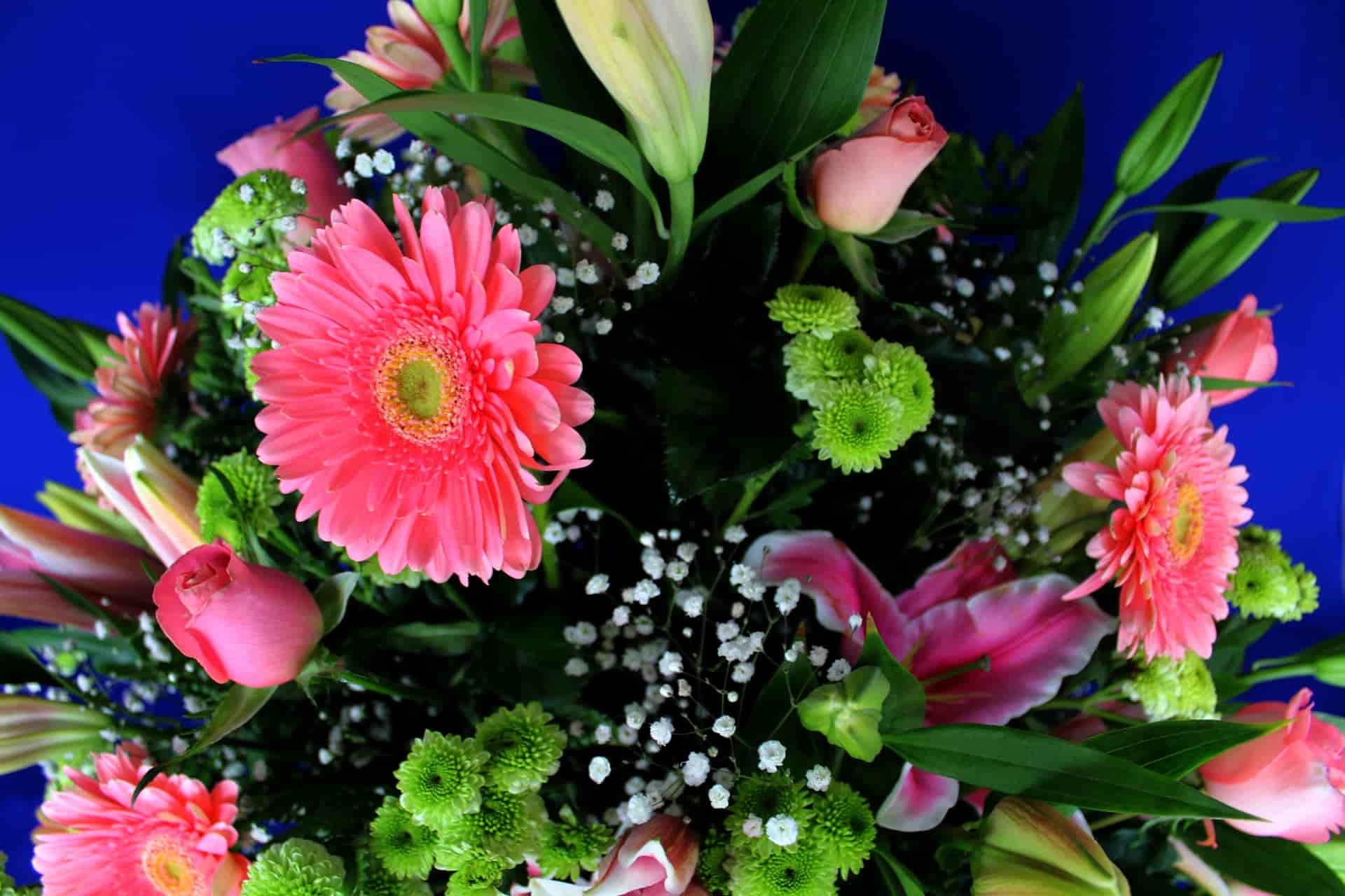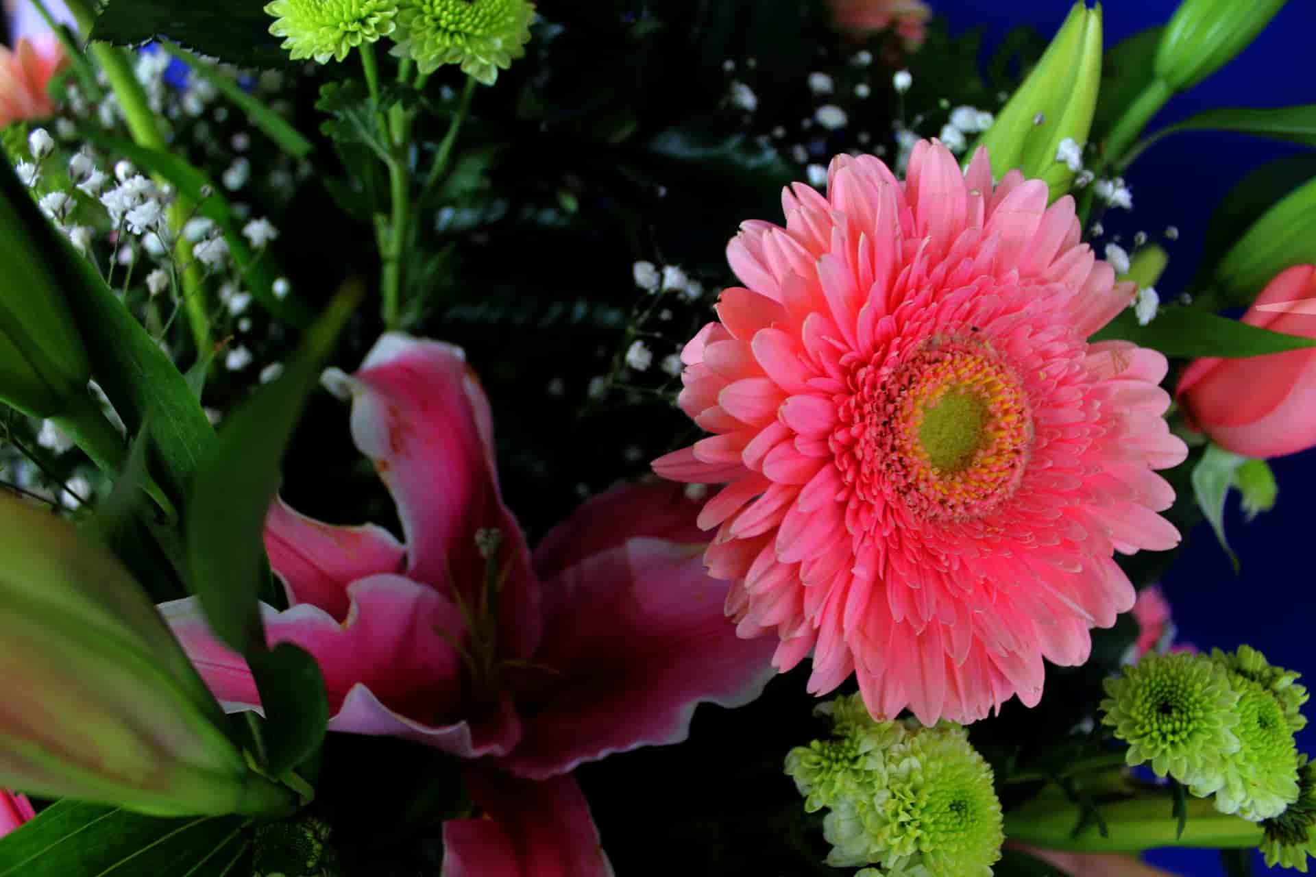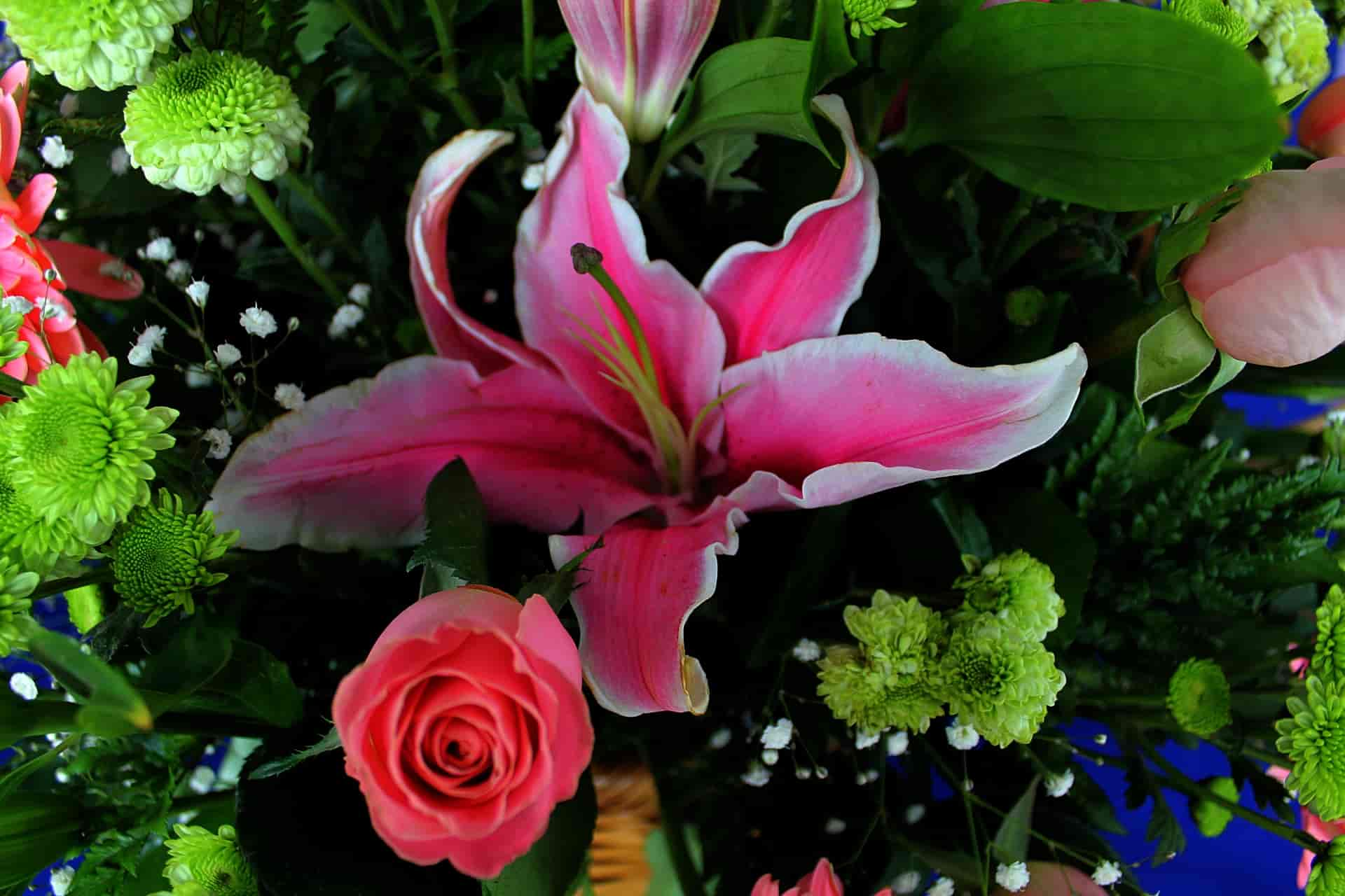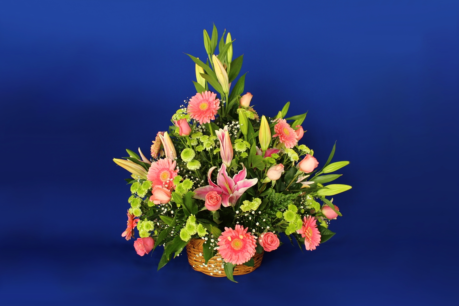 Hermosa canasta de carrizo con 12 gerberas rosas, stargazer, yokos verdes y baby.