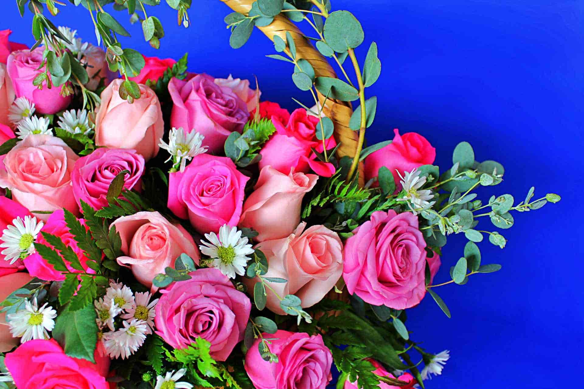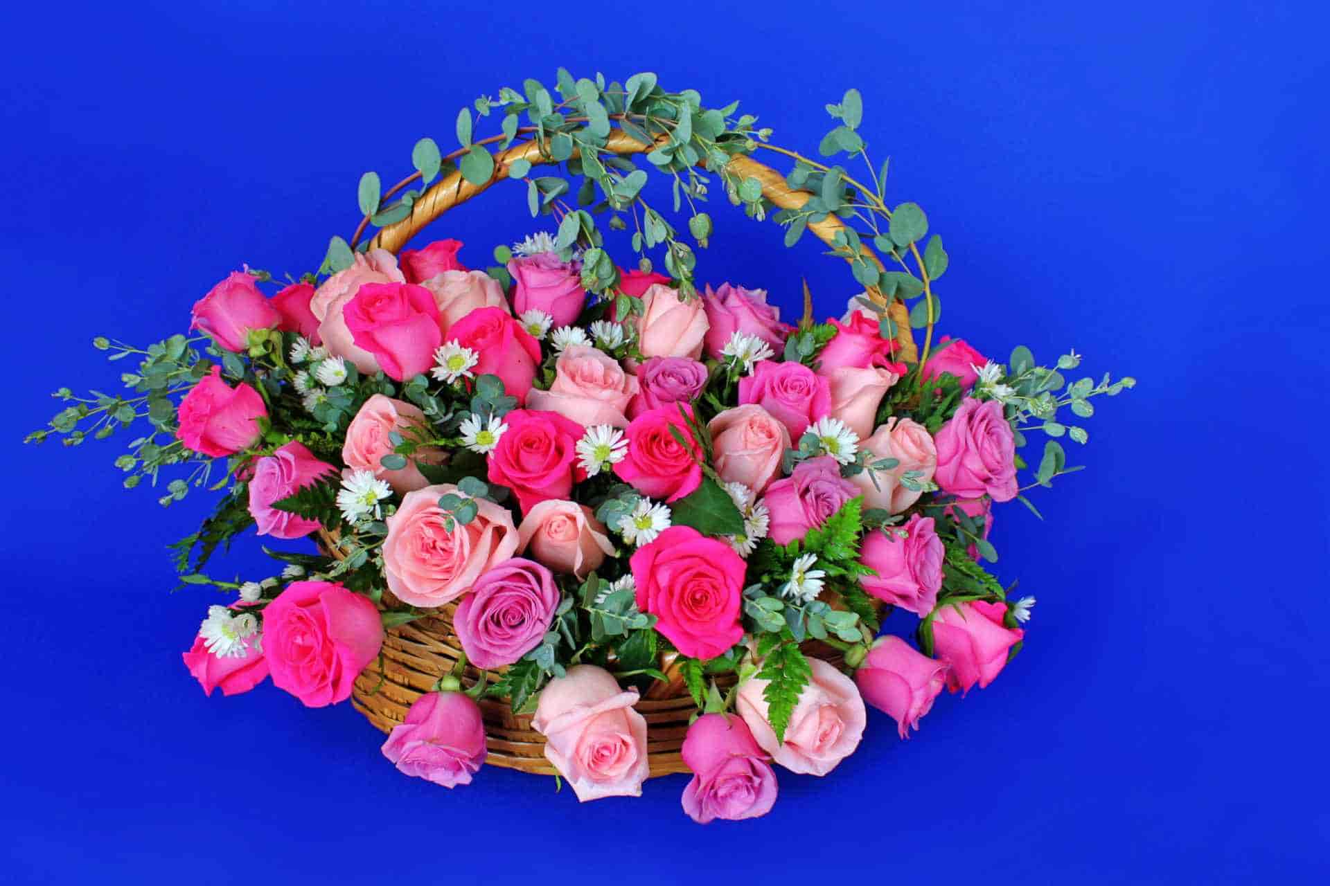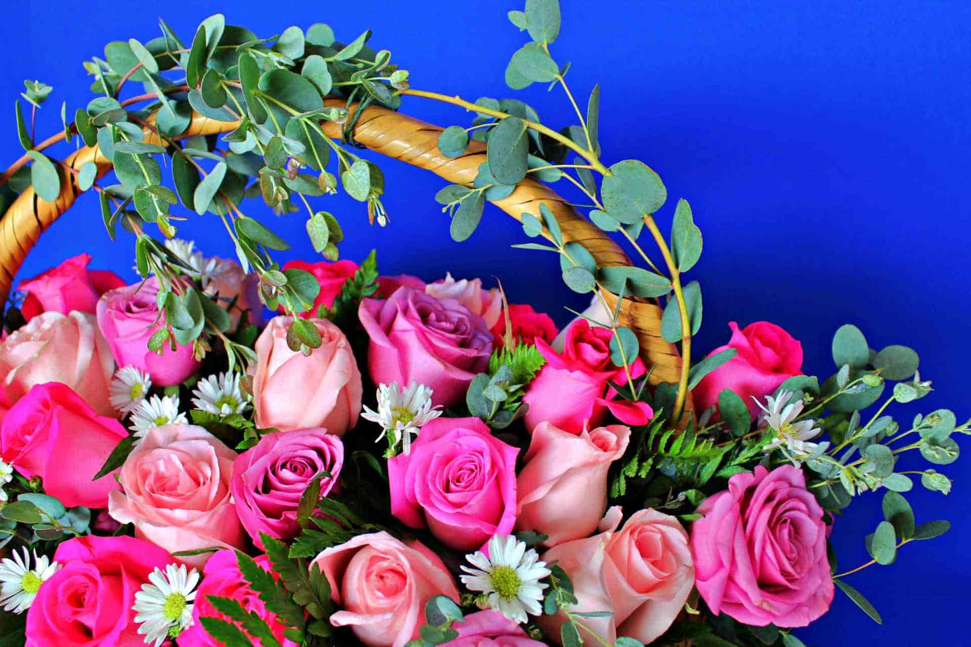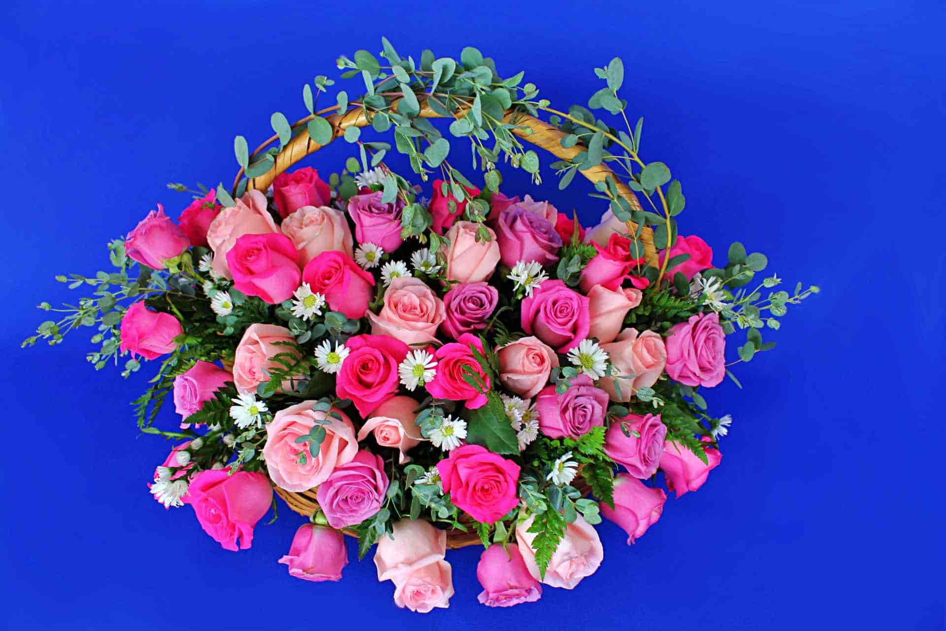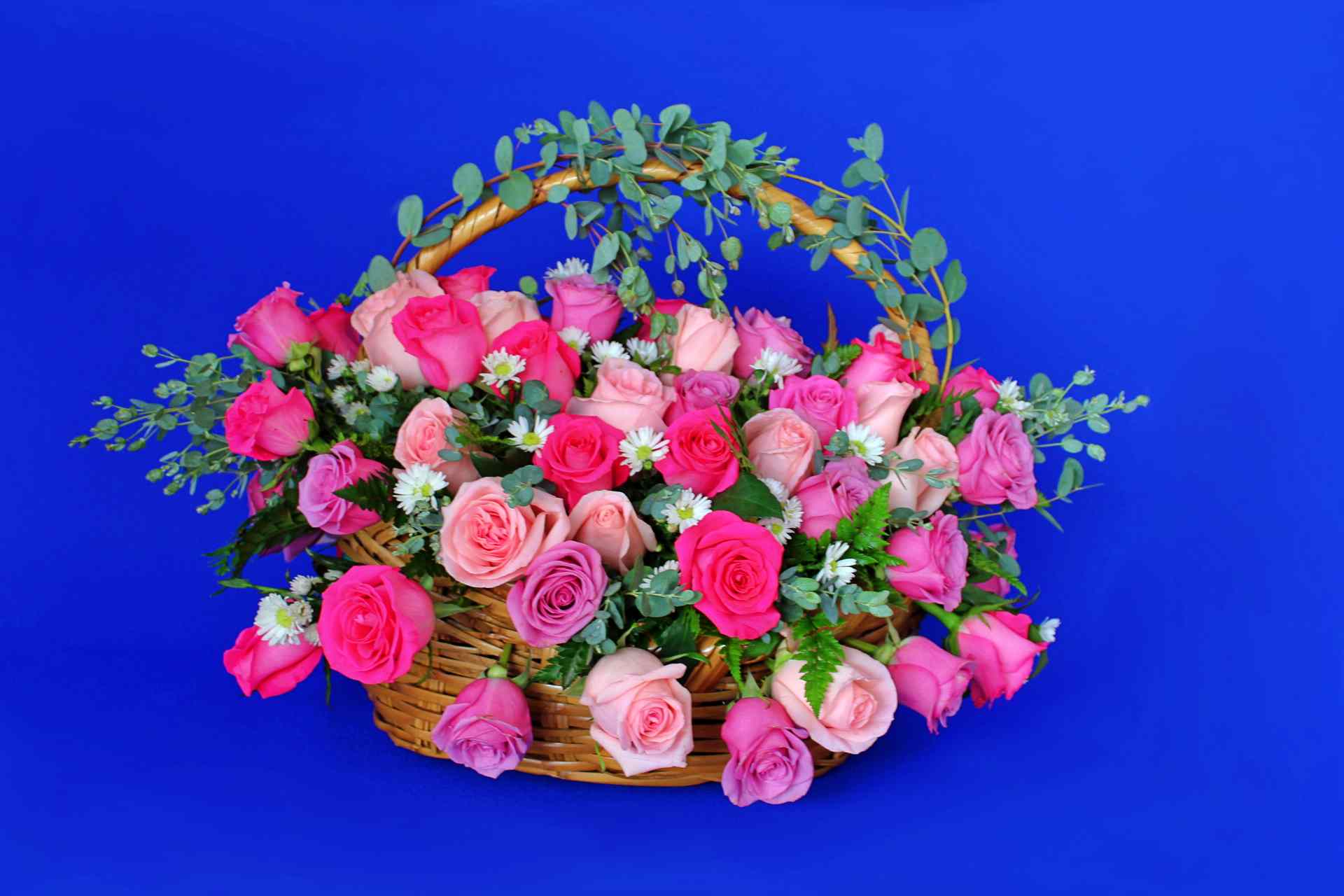 Canasta adornada con tres tonalidades de rosas de la mejor calidad acompañadas de eucalipto y pequeñas flores de áster blanco.