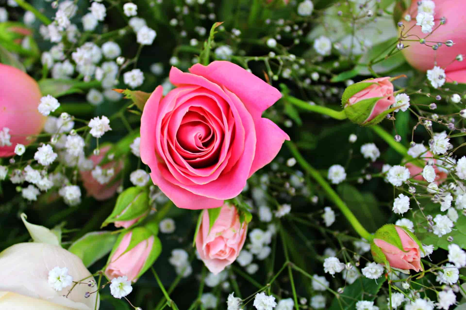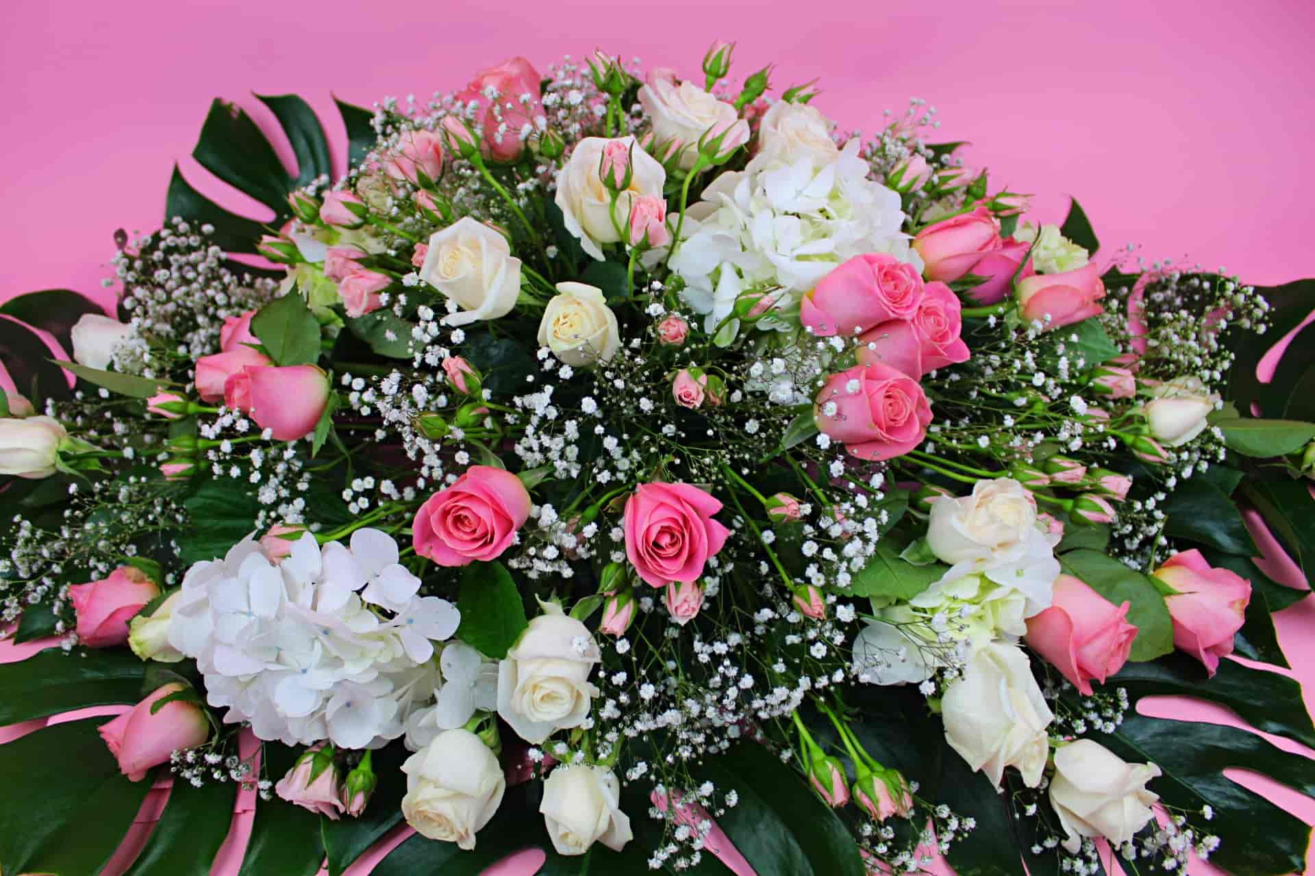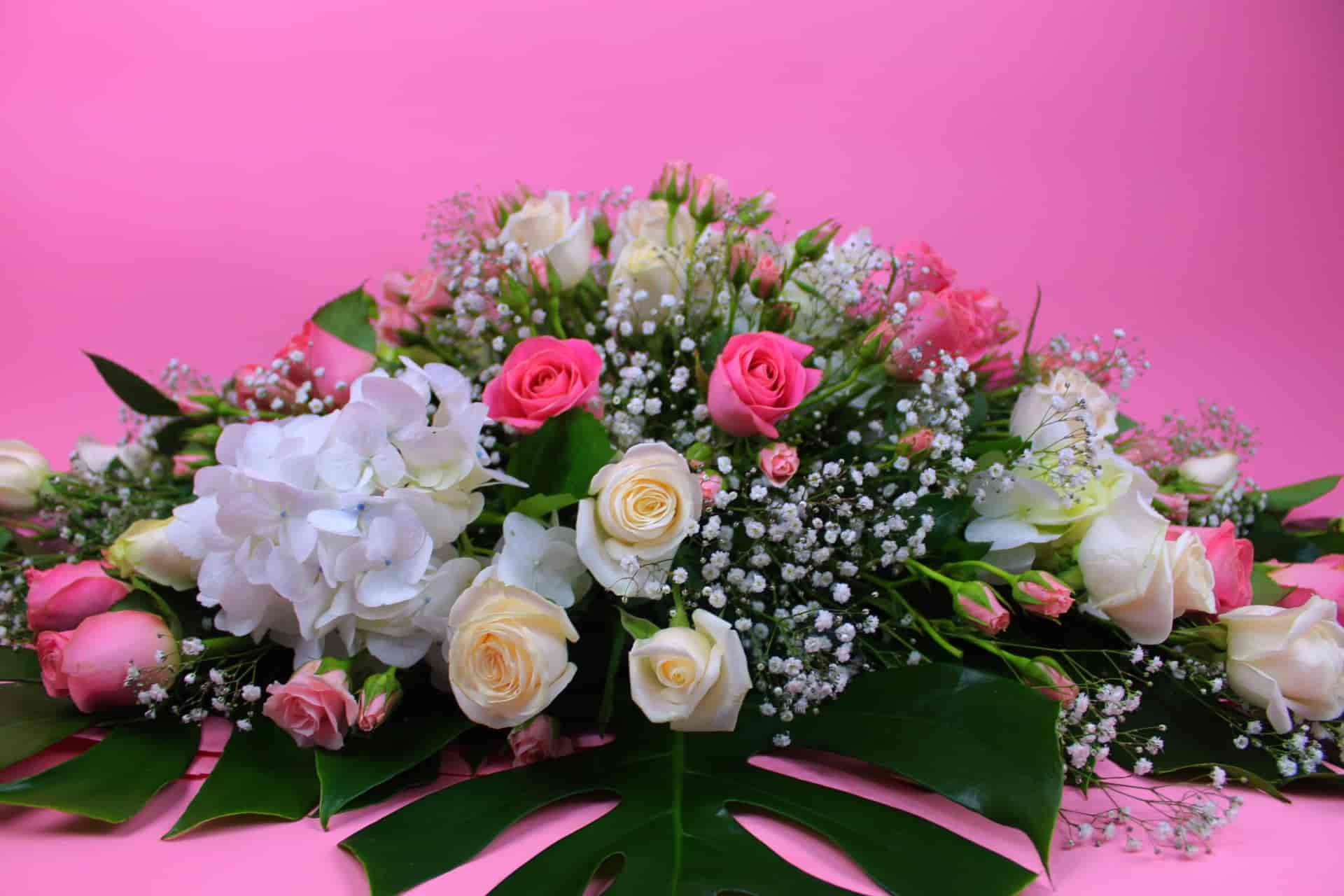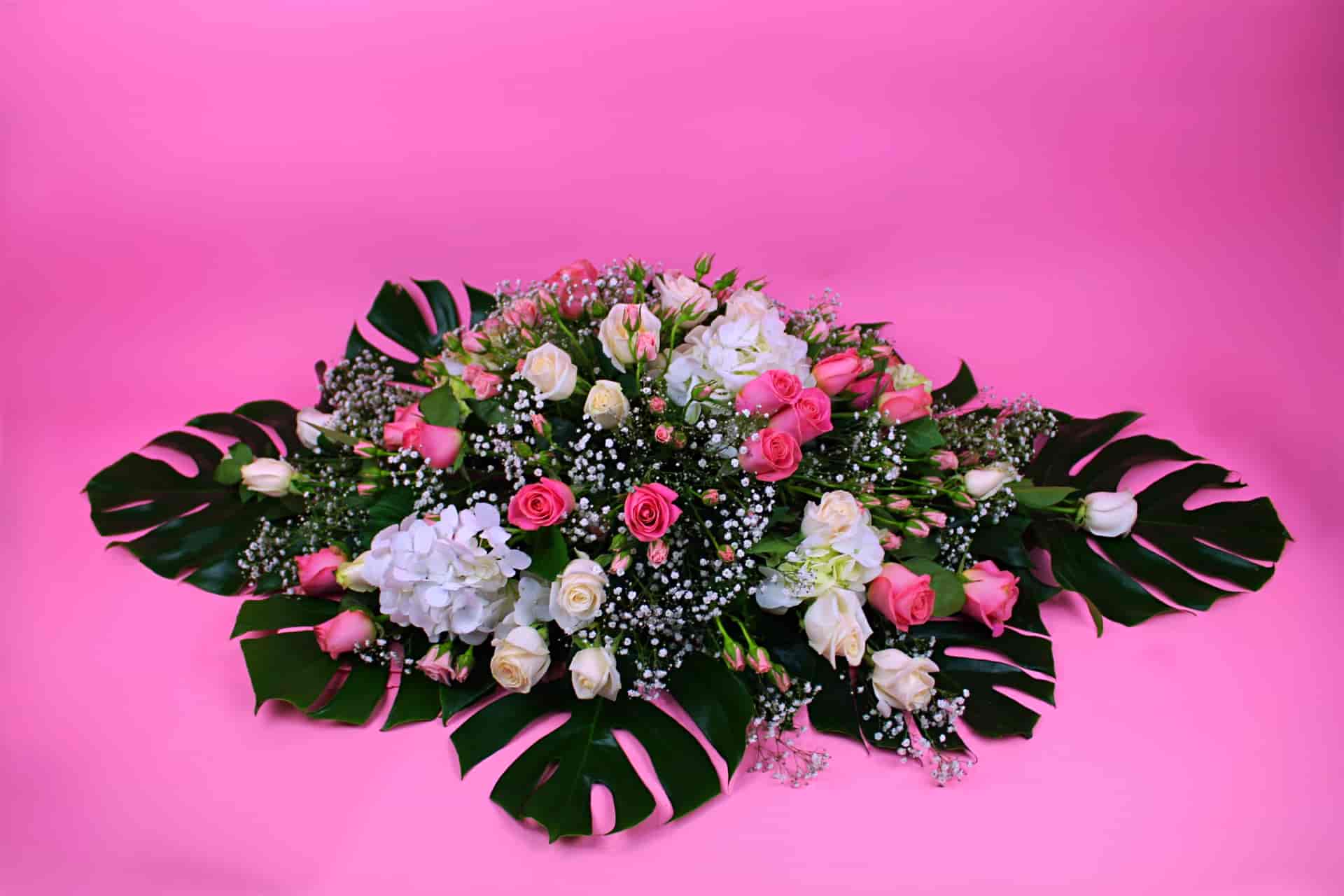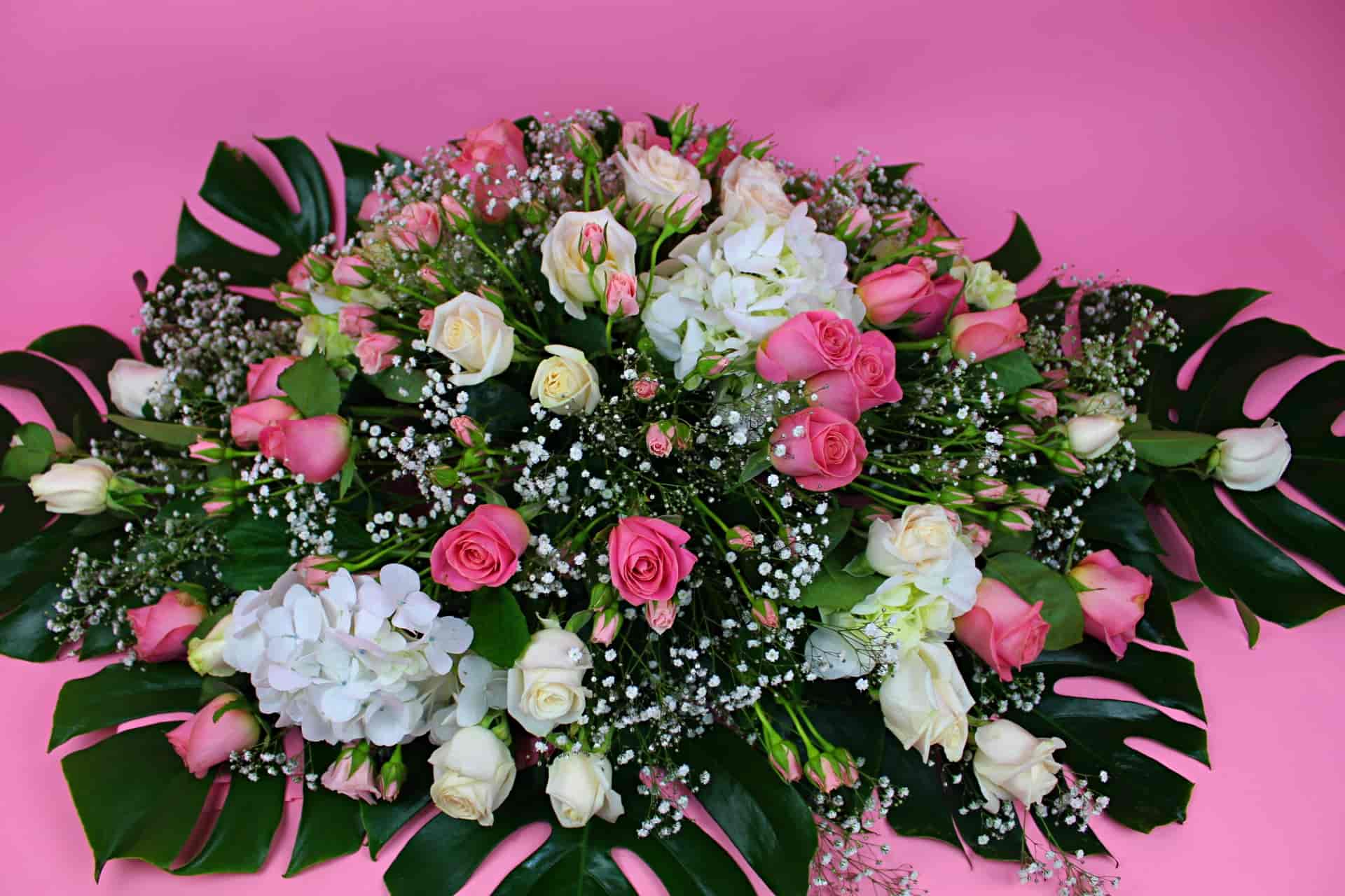 Centro de mesa desmontable para colocar como adorno de auto para cofre delantero, incluye piña nona, mini rosa color rosa, rosa hermosa, gypsophila, rosa caricia, hortencia y follajes.
