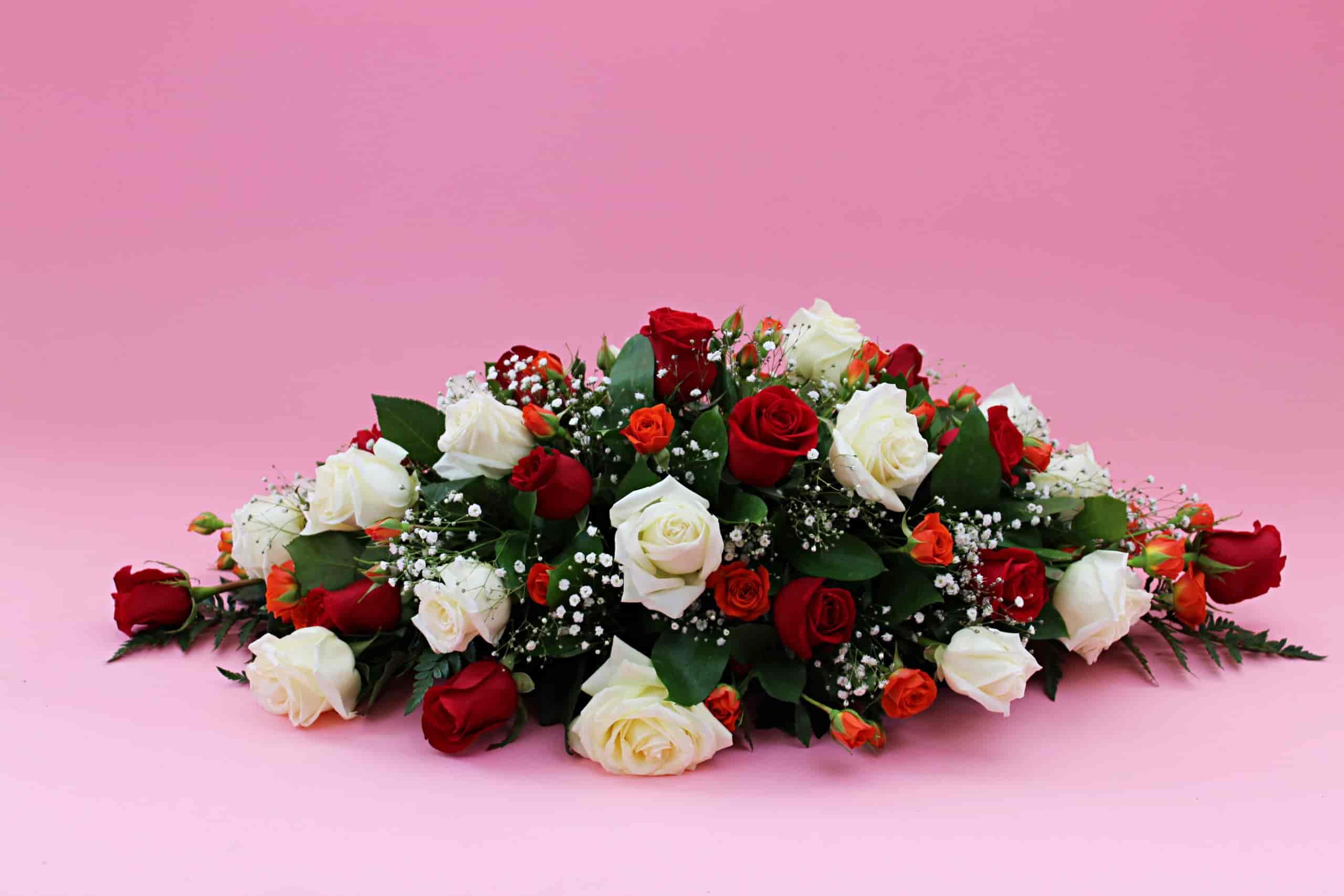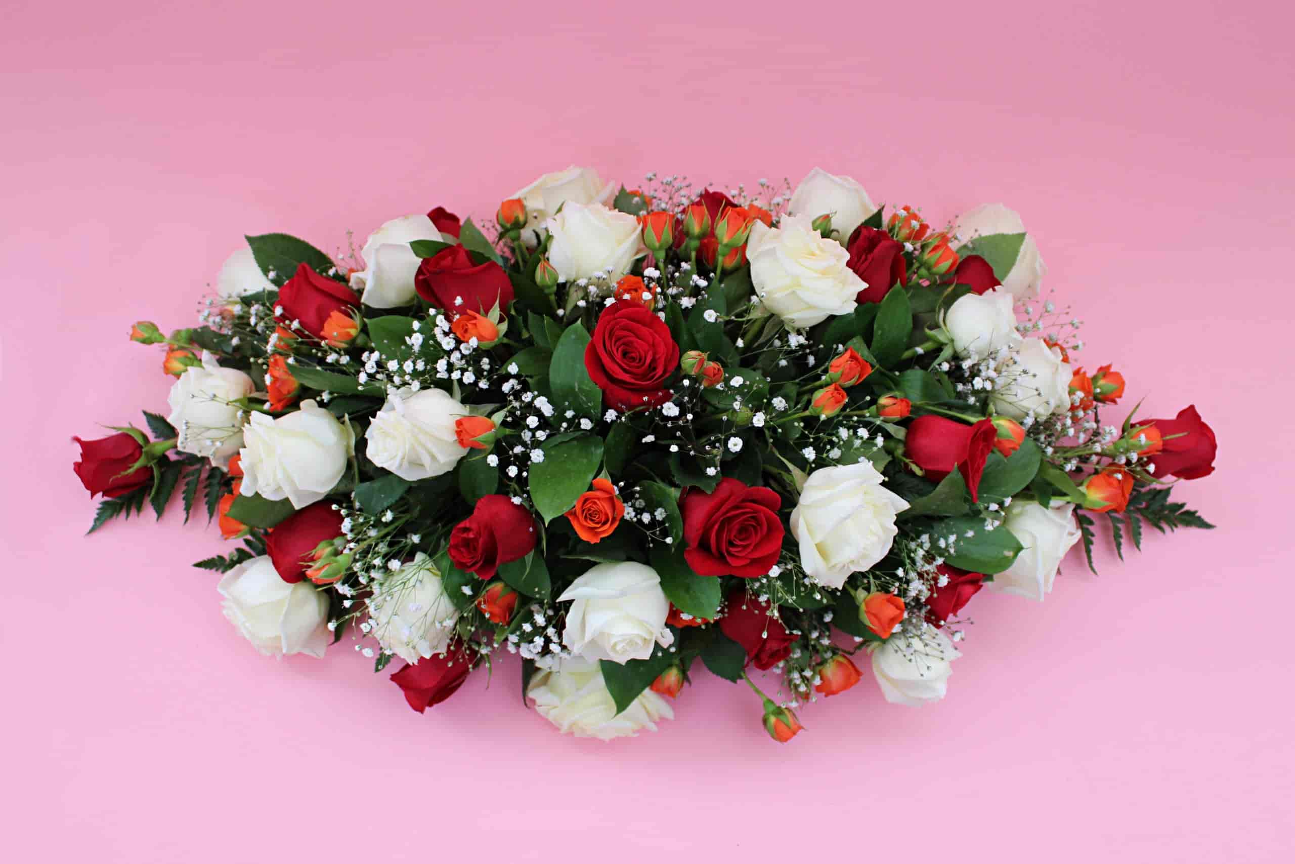 Arreglo floral con rosas blancas y unas variedades de rosas pequeñas. Sus dimensiones y colorido diseño lo convierten en el mejor regalo.