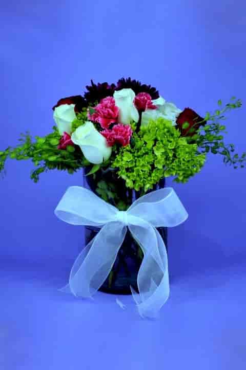 Bonito centro de mesa, incluye 5 rosas, claveles y Hortensias Verdes para despedida de soltera/o.