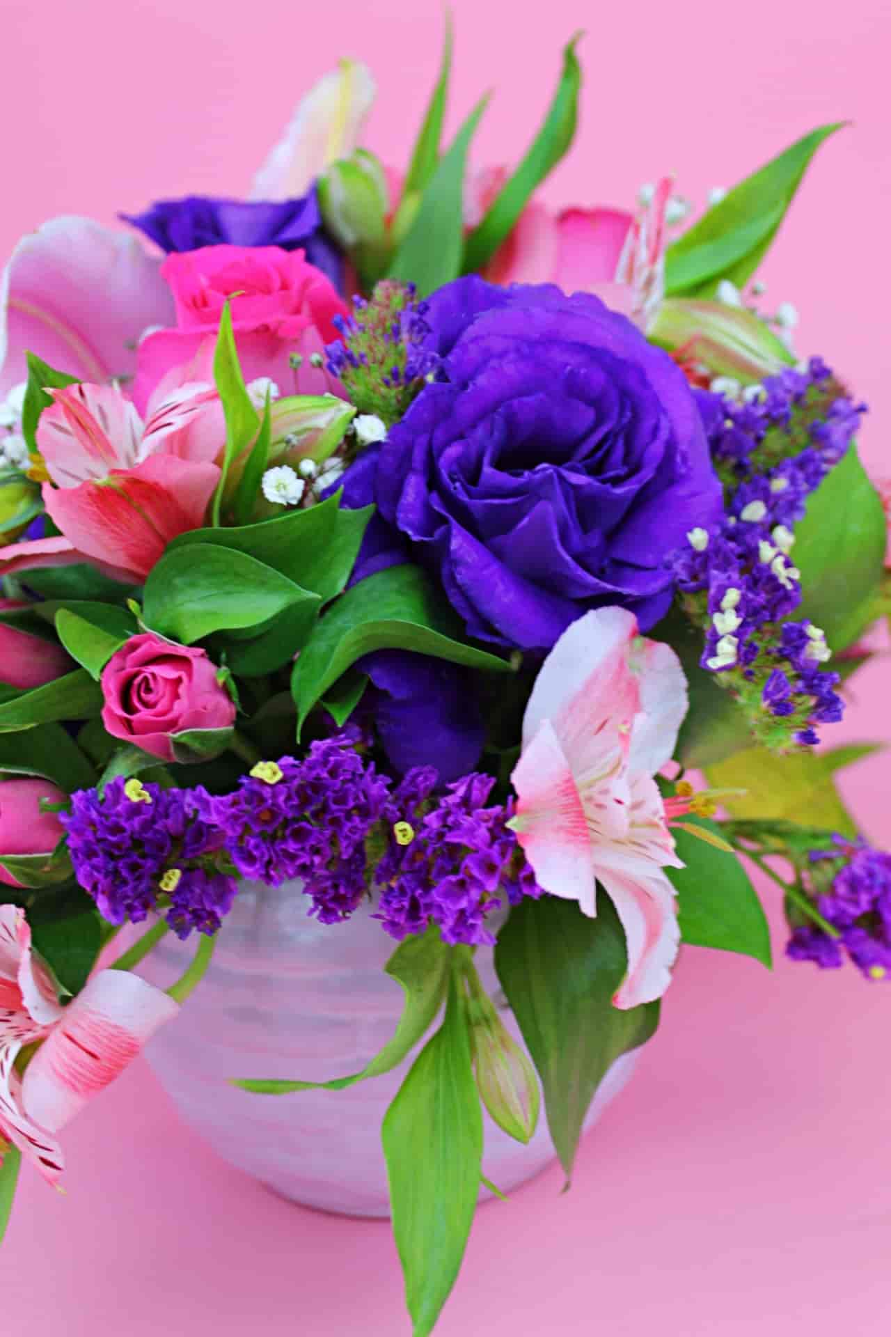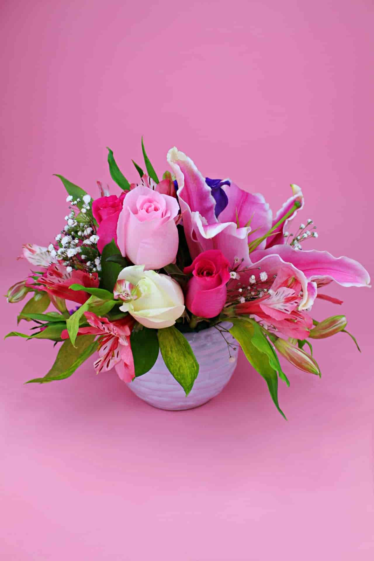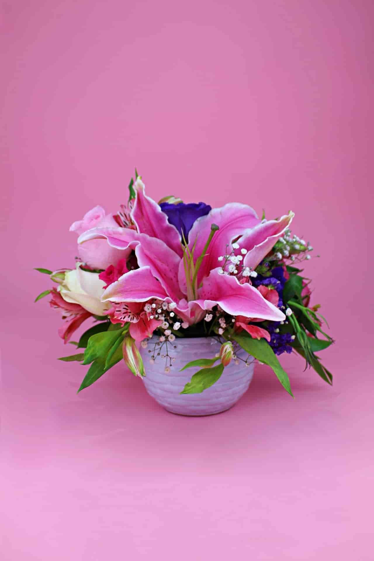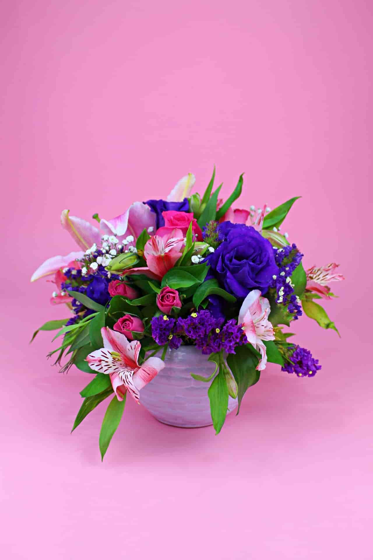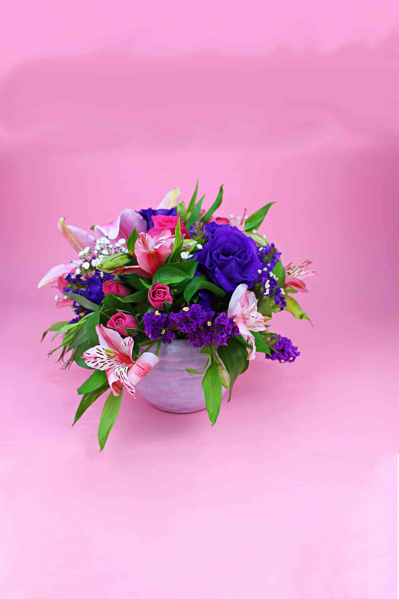 Centro de mesa en base cerámica mini elaborado con stargacer, alstroemeria, licianthus, rosa caricia y statil.