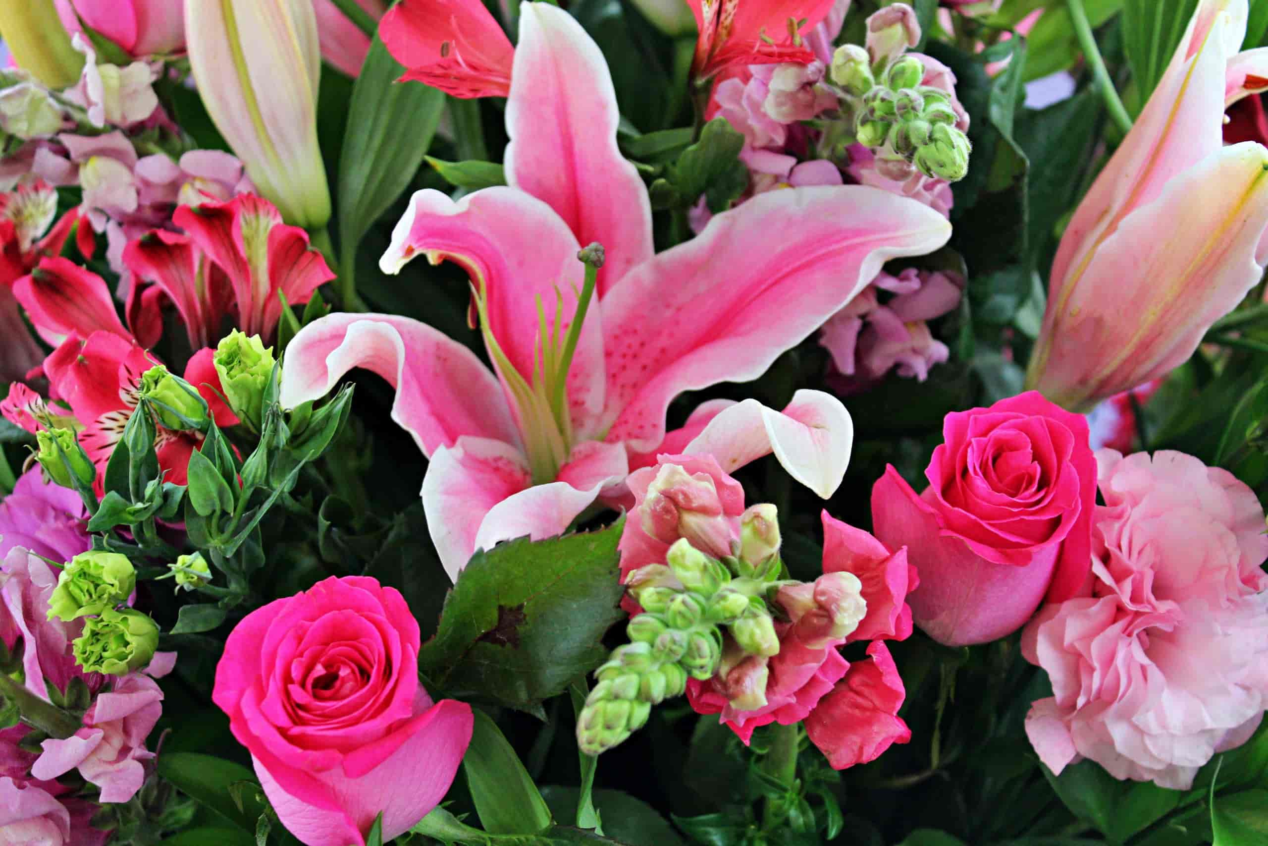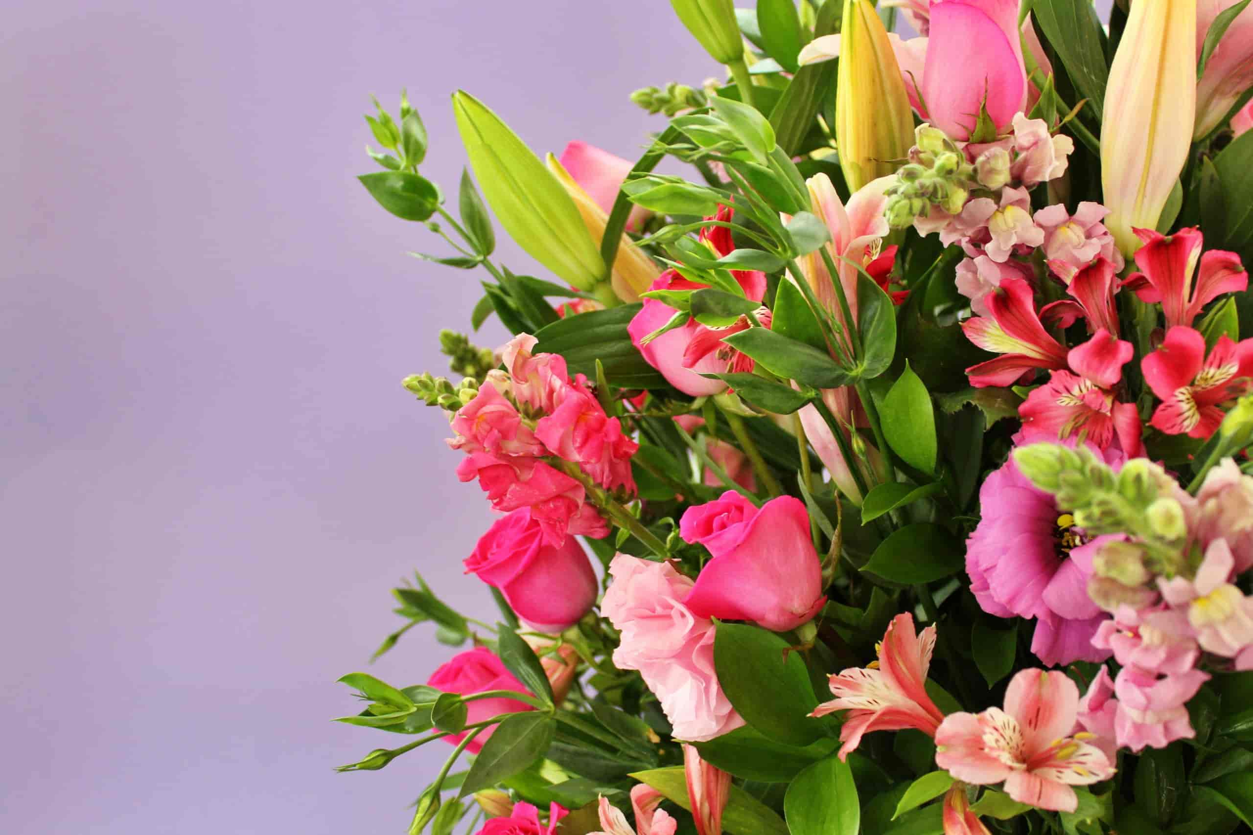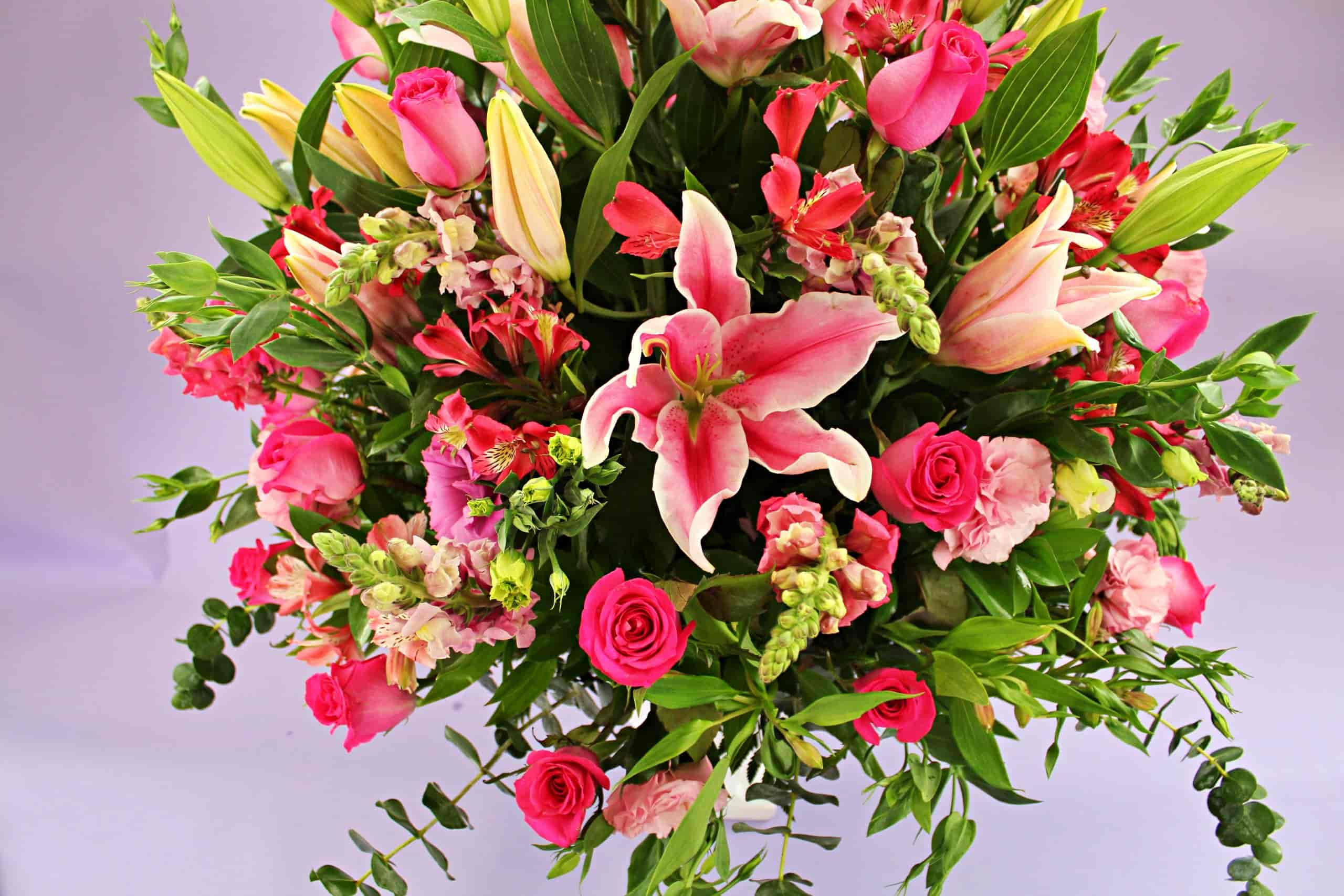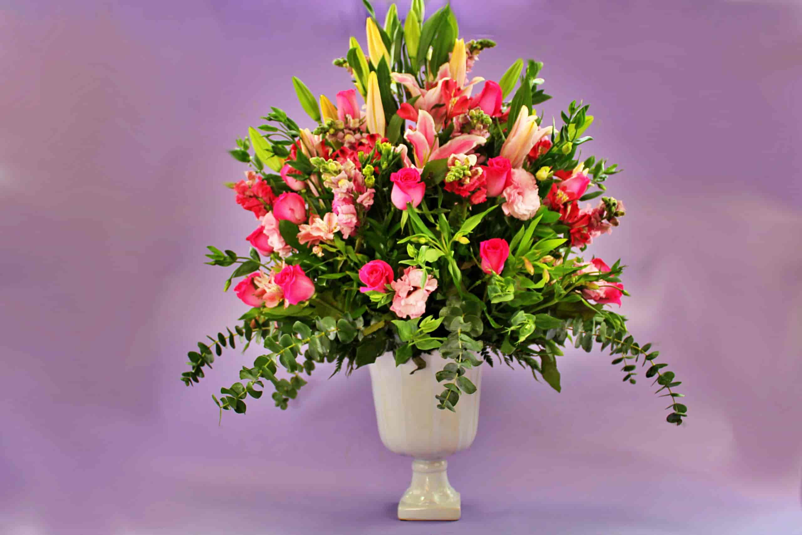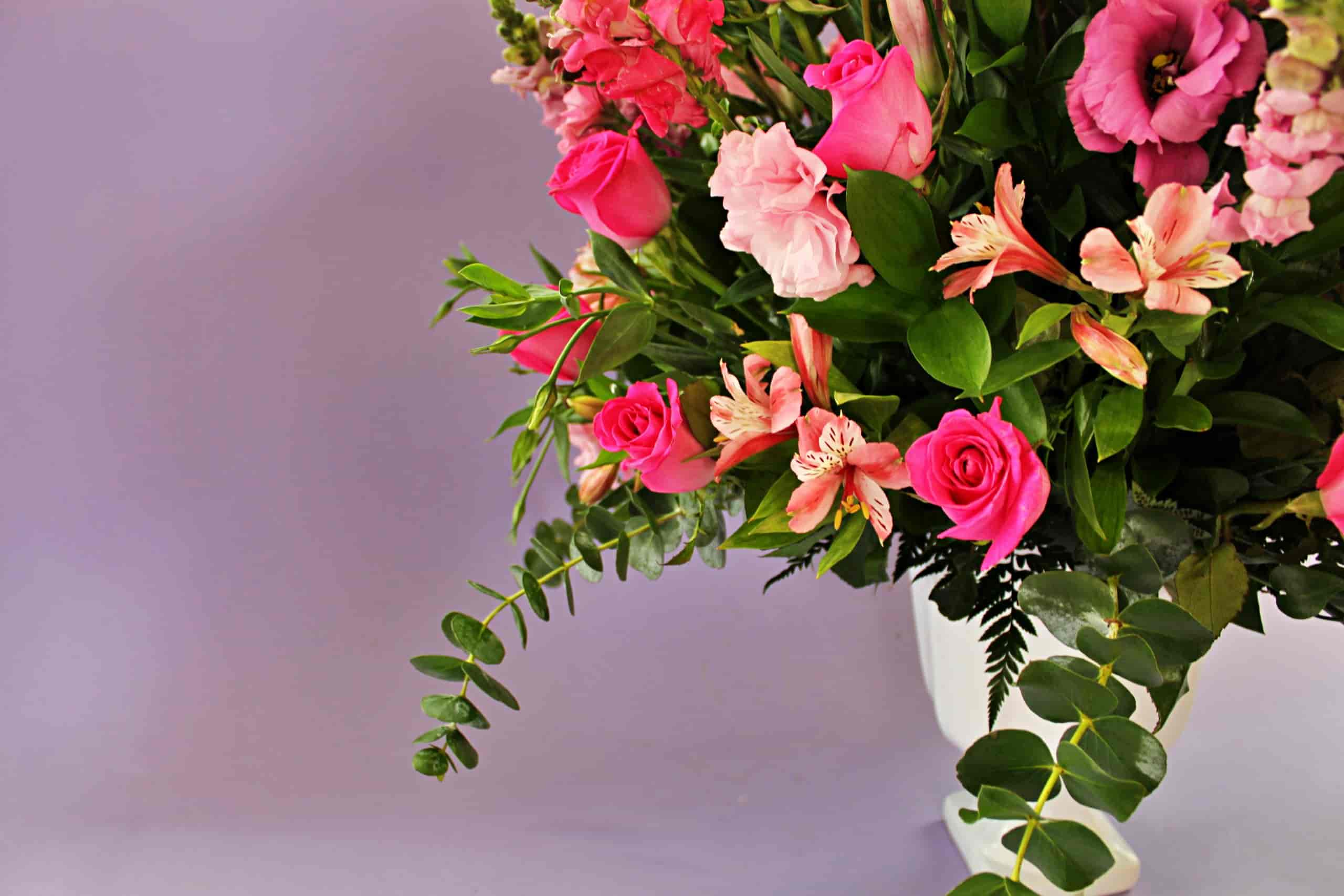 Base de cerámica blanca con rosas fucsia y tallos de stargazer. El estilo de la base y la belleza de las flores dan como resultado un regalo grande pero hermoso para sorprender.