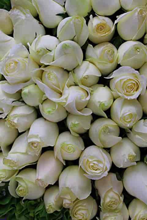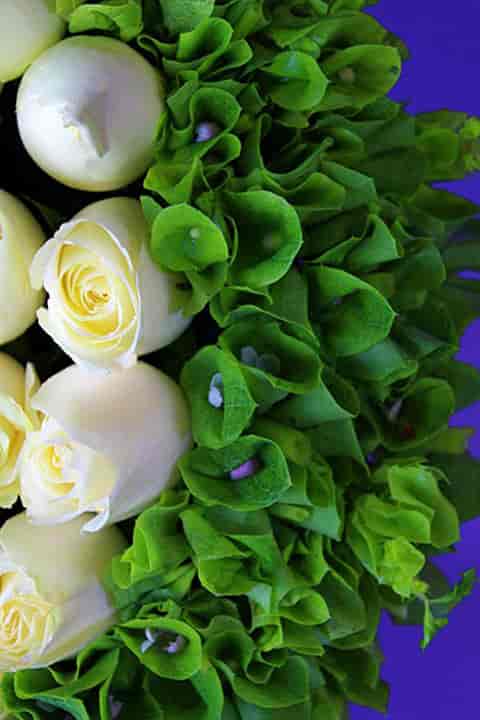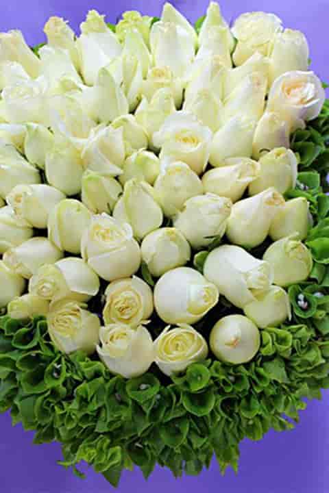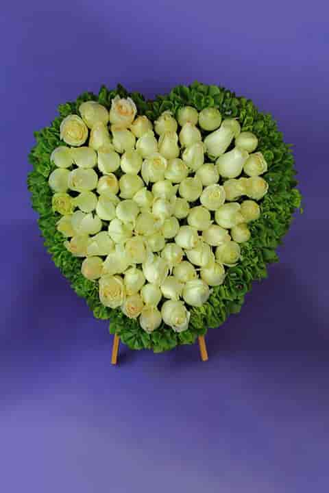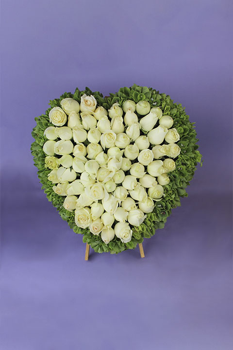 Arreglo en forma de corazón con rosas blancas y perritos. Incluye base.