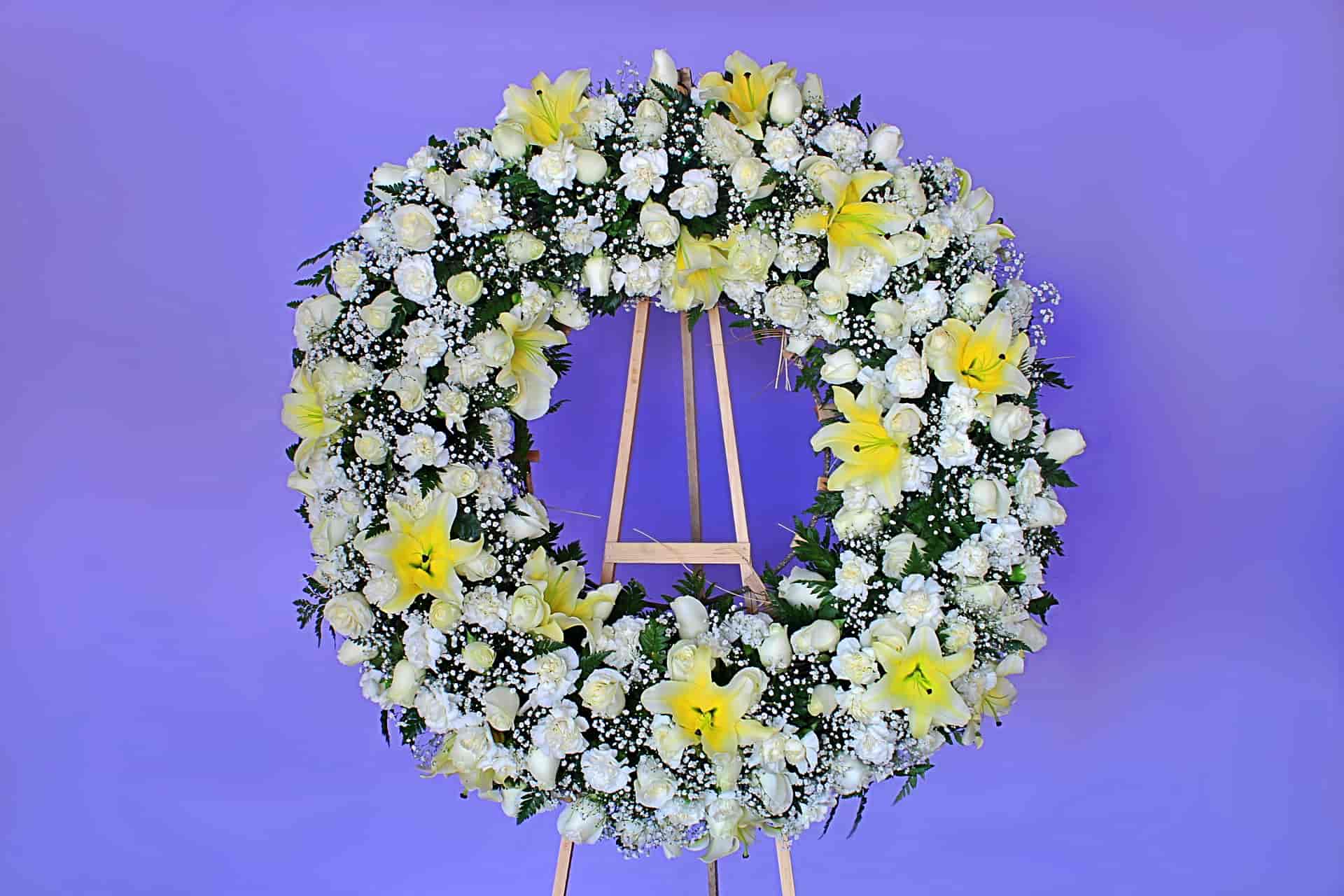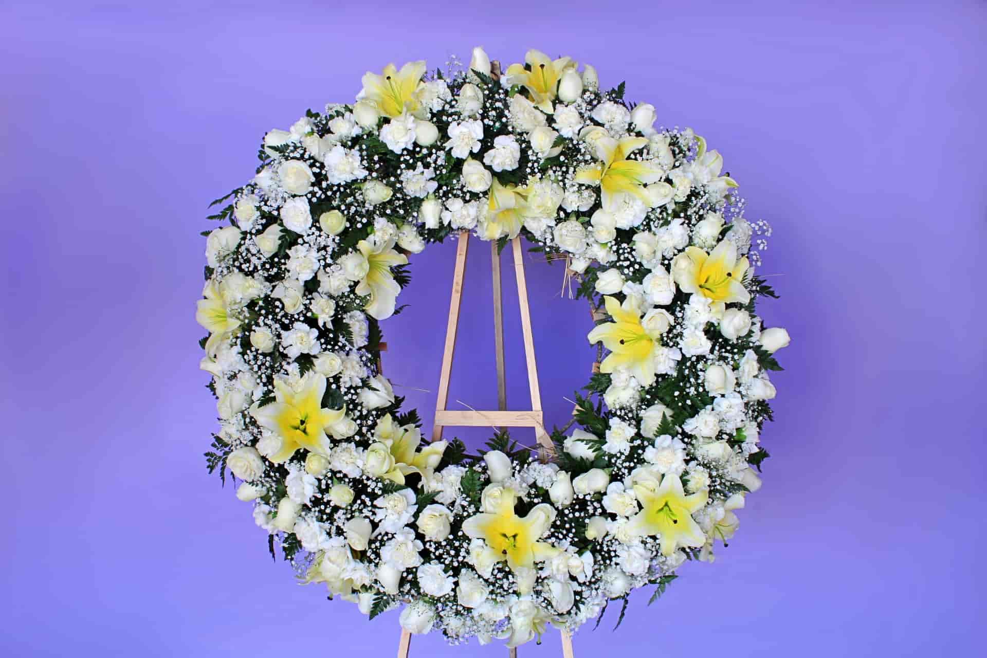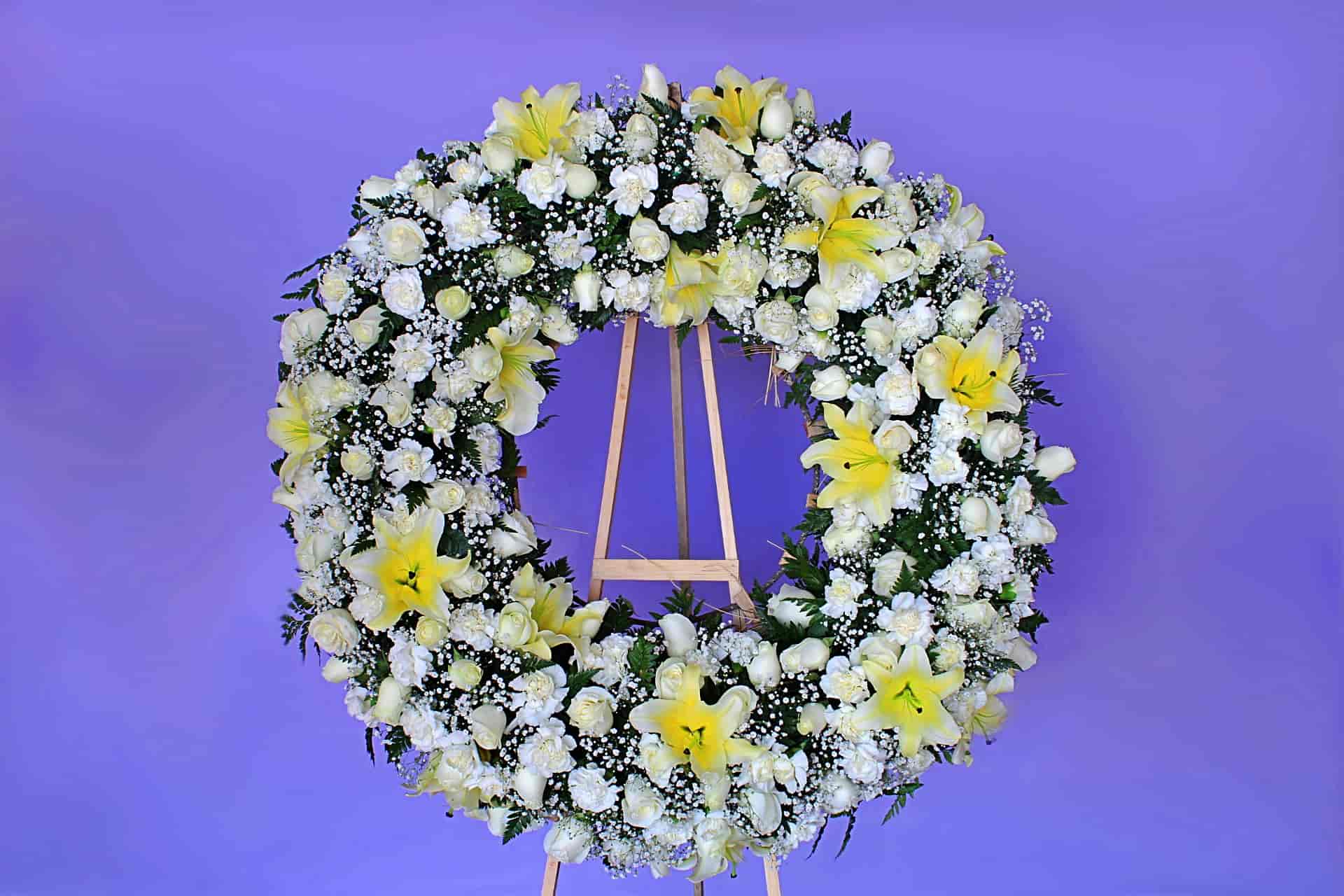 Corona funeraria elaborada con rosas blancas y retoques de lilium.