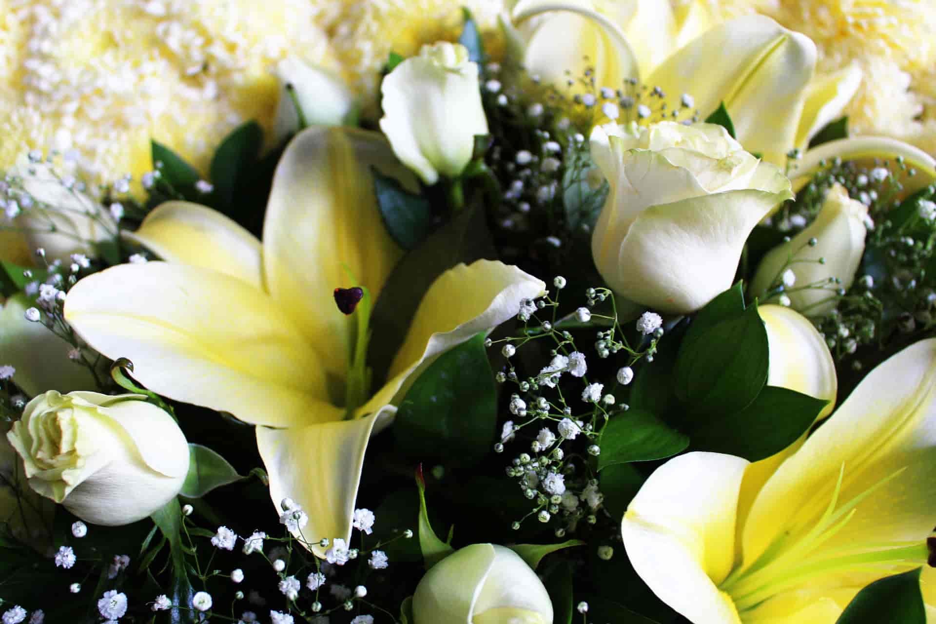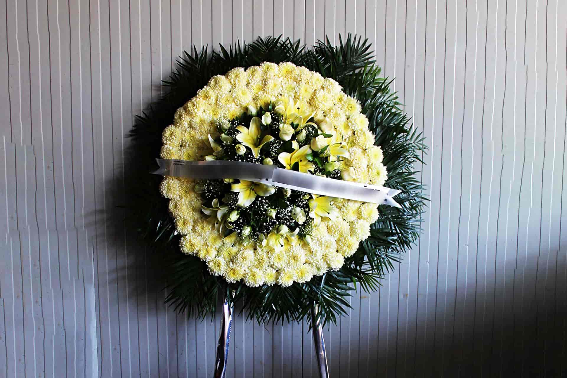 Corona funeraria con concador, gypsophila, polar y rosas. Una manera de expresar tu mas sentido pésame.