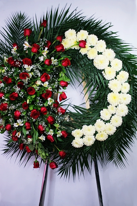 Bonita corona funeraria, con rosa roja, baby, alstroemeria.