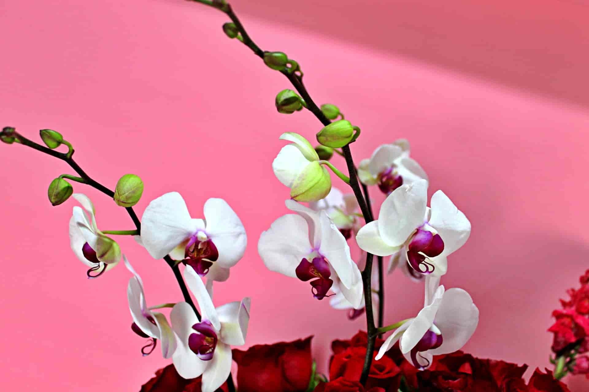 Hermosa esfera floral montada en una base de cerámica compuesta por 200 rosas rojas, 2 varas de orquídea y lisianthus.