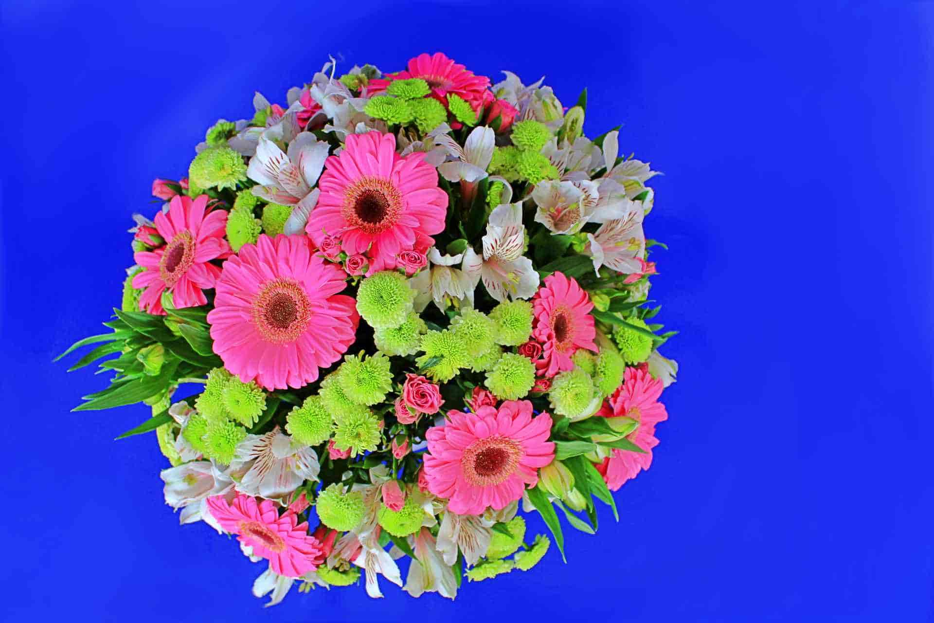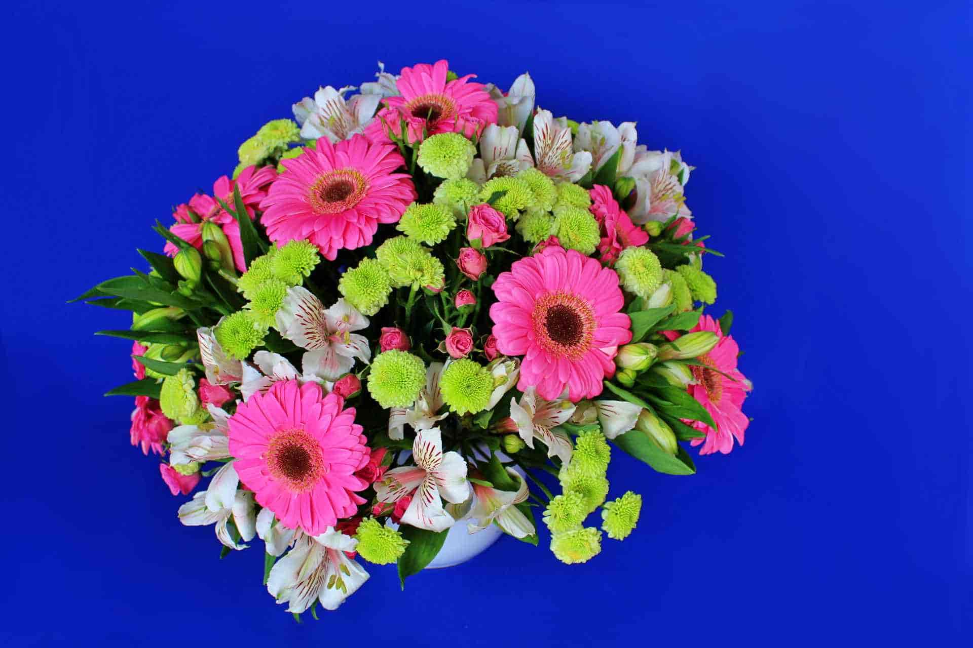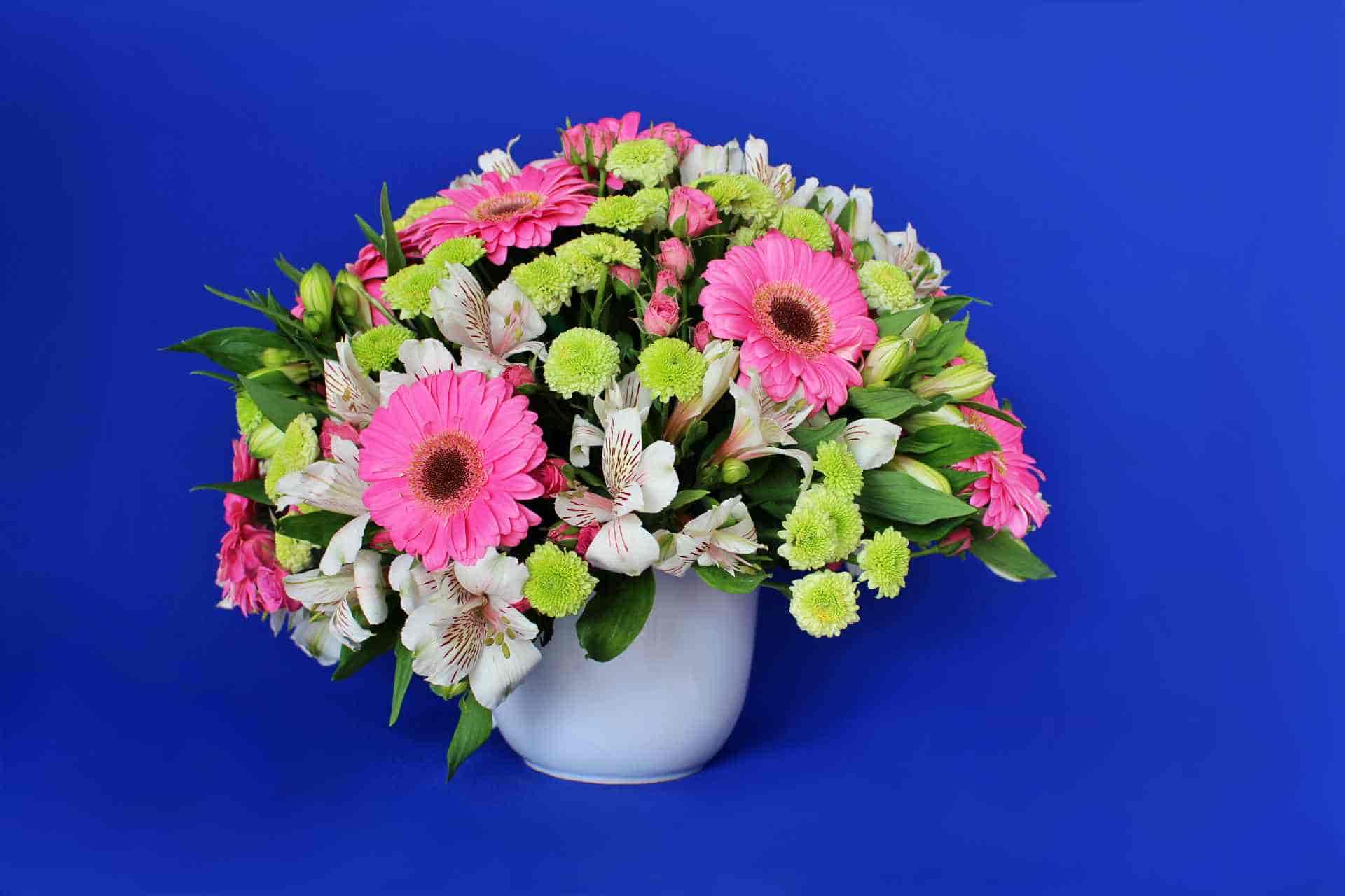 Taza grande de cerámica blanca adornada con gerberas rosas, alstroemeria blanca, yocos verdes y mini rosa. Los colores verdes y rosados dan una combinación espectacular.