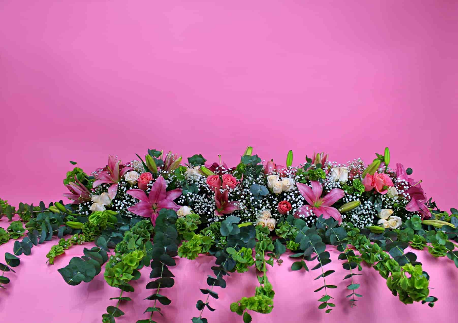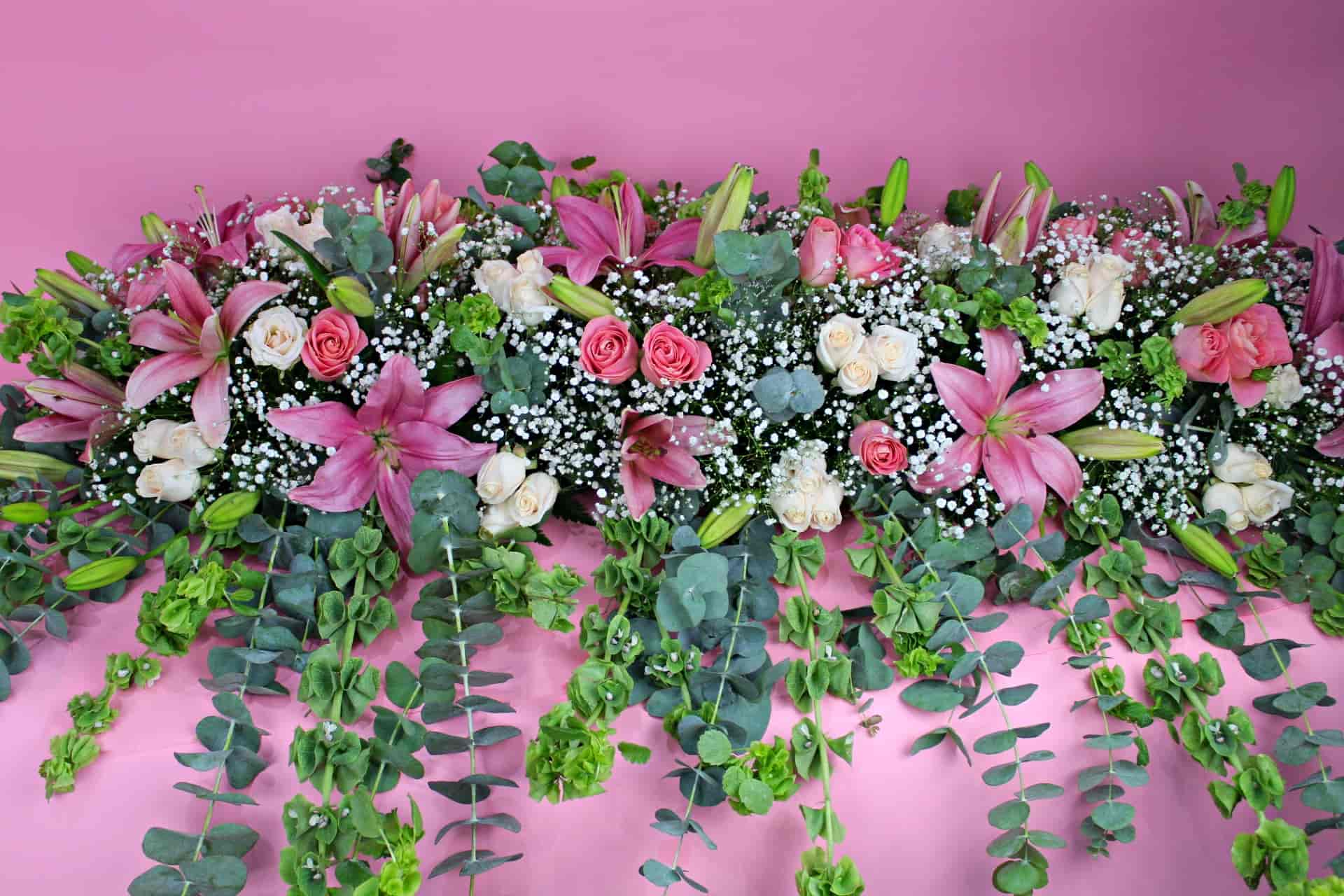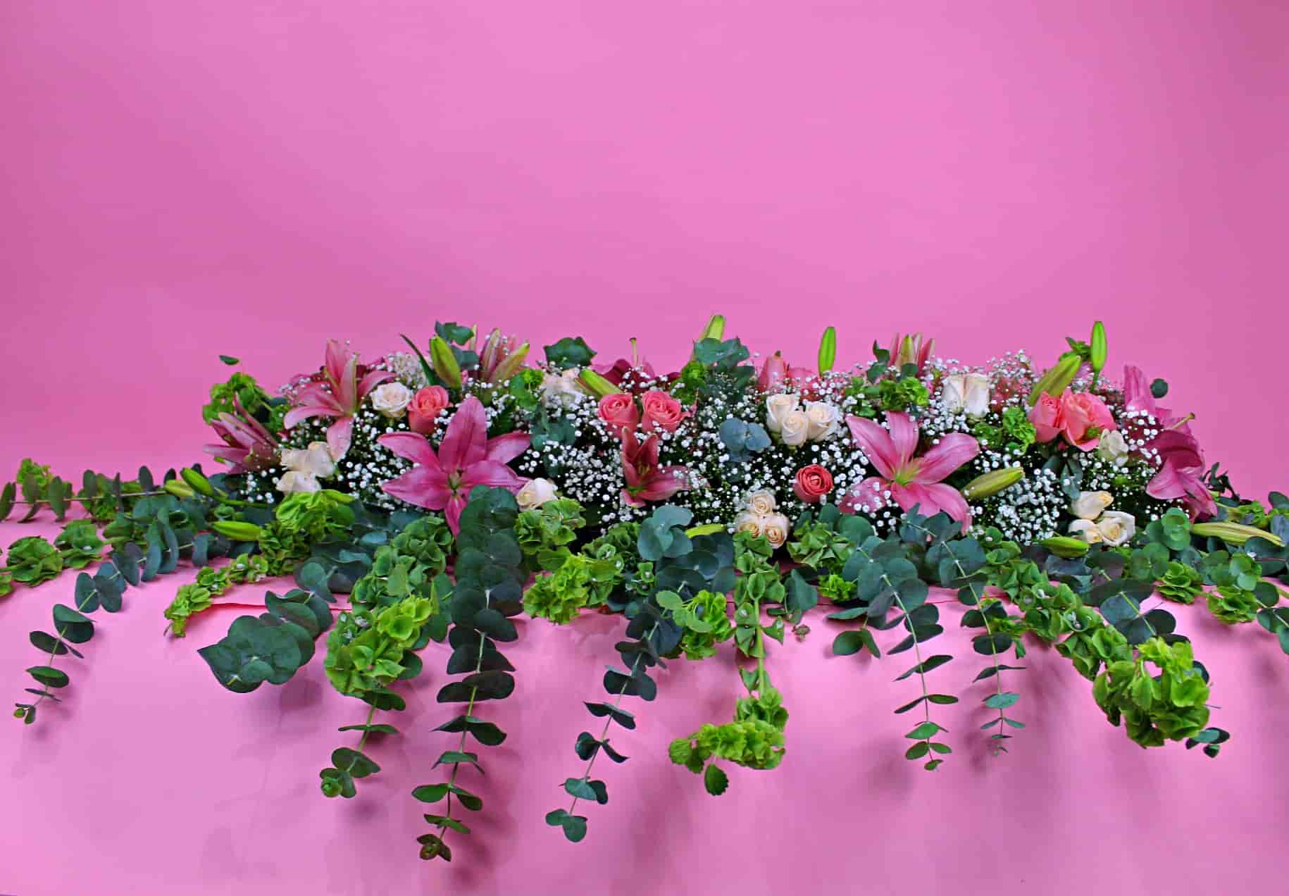 Hermosa jardinera de 1 metro con 24 rosas hermosas y 48 rosas blancas, dollar, lilis, campana y gypsophila, ideal para mesa principal.