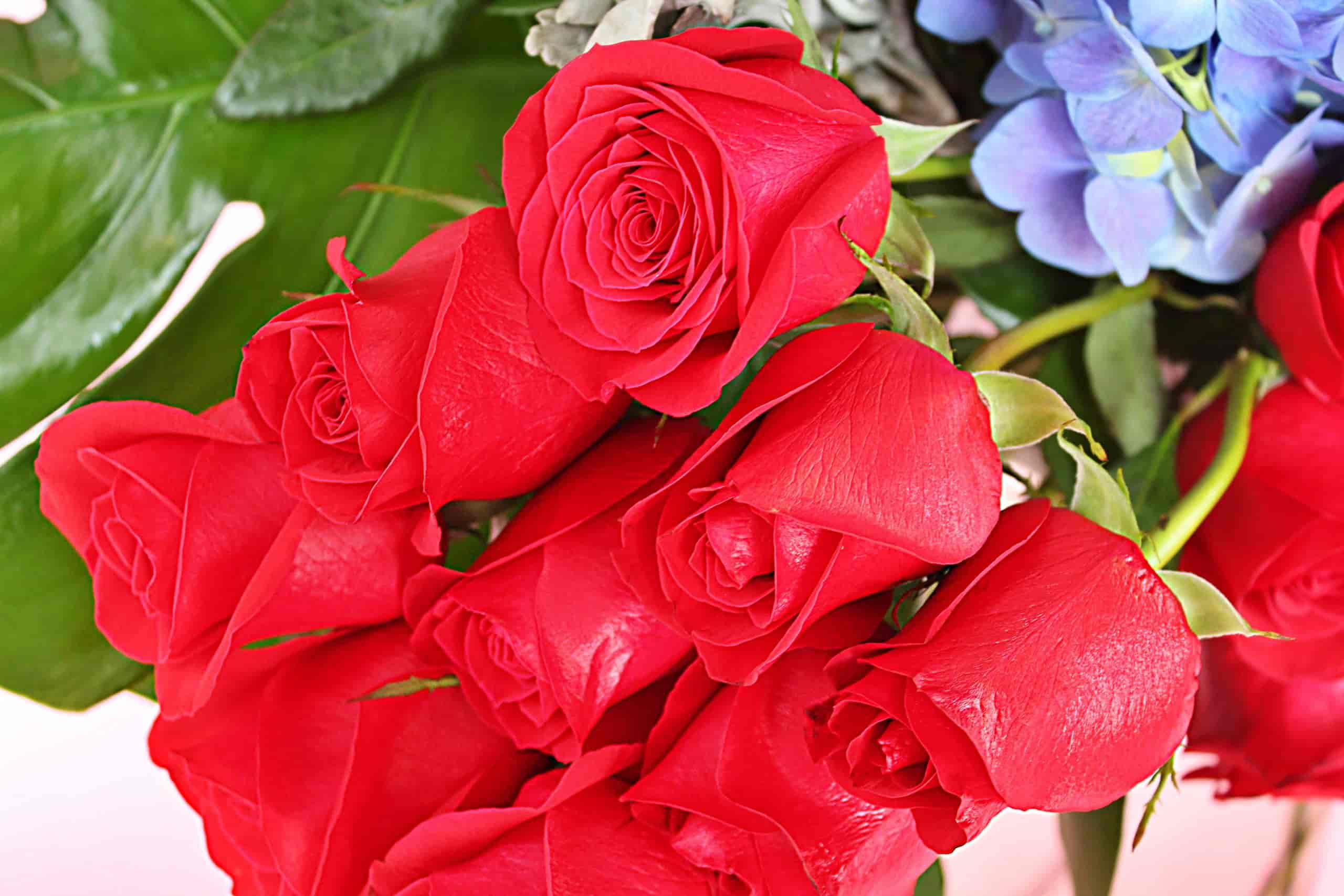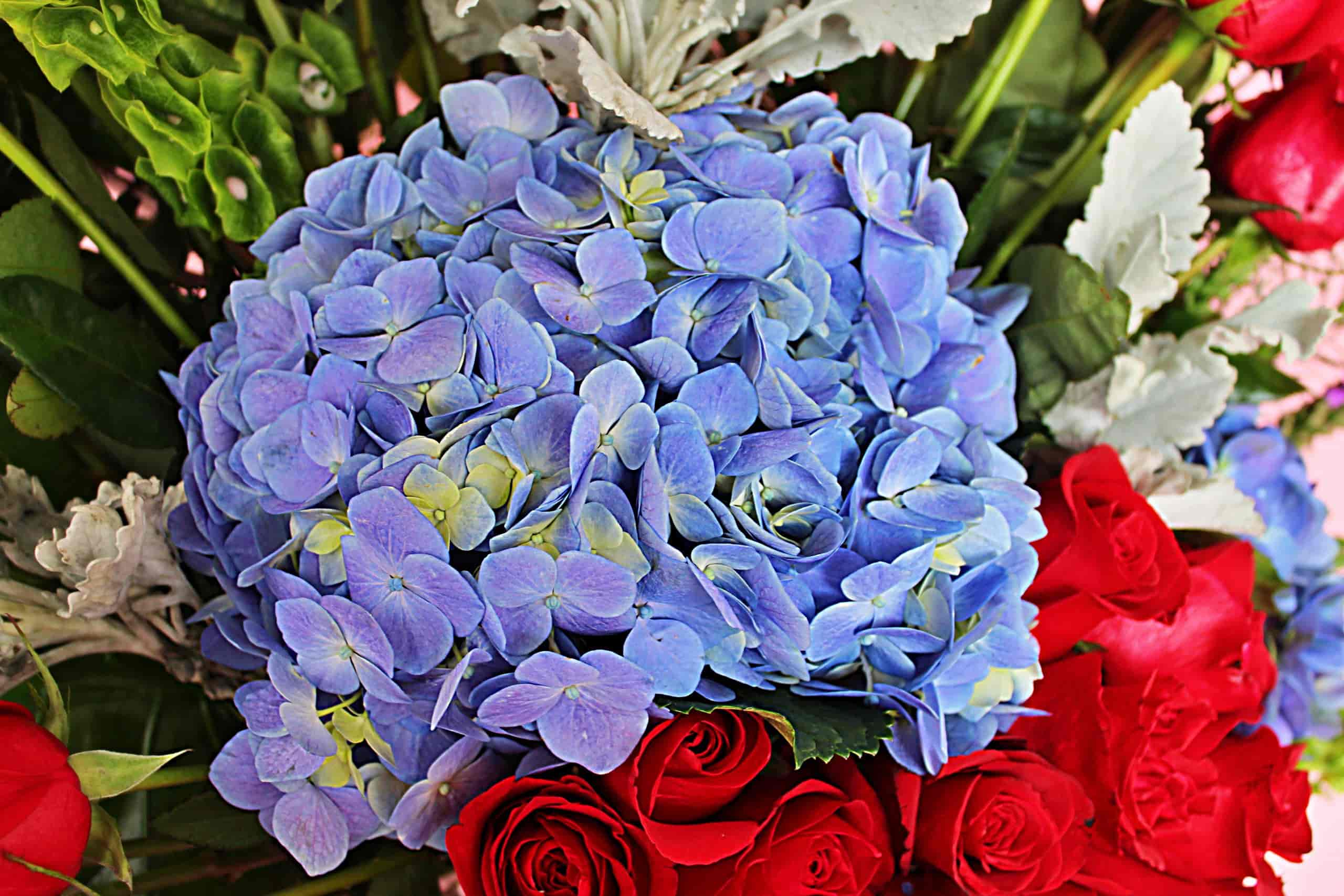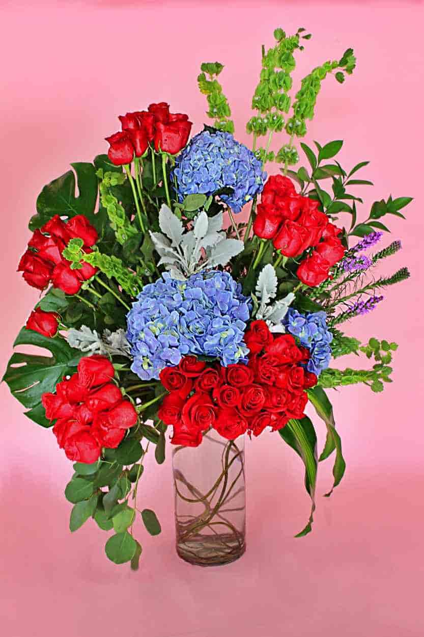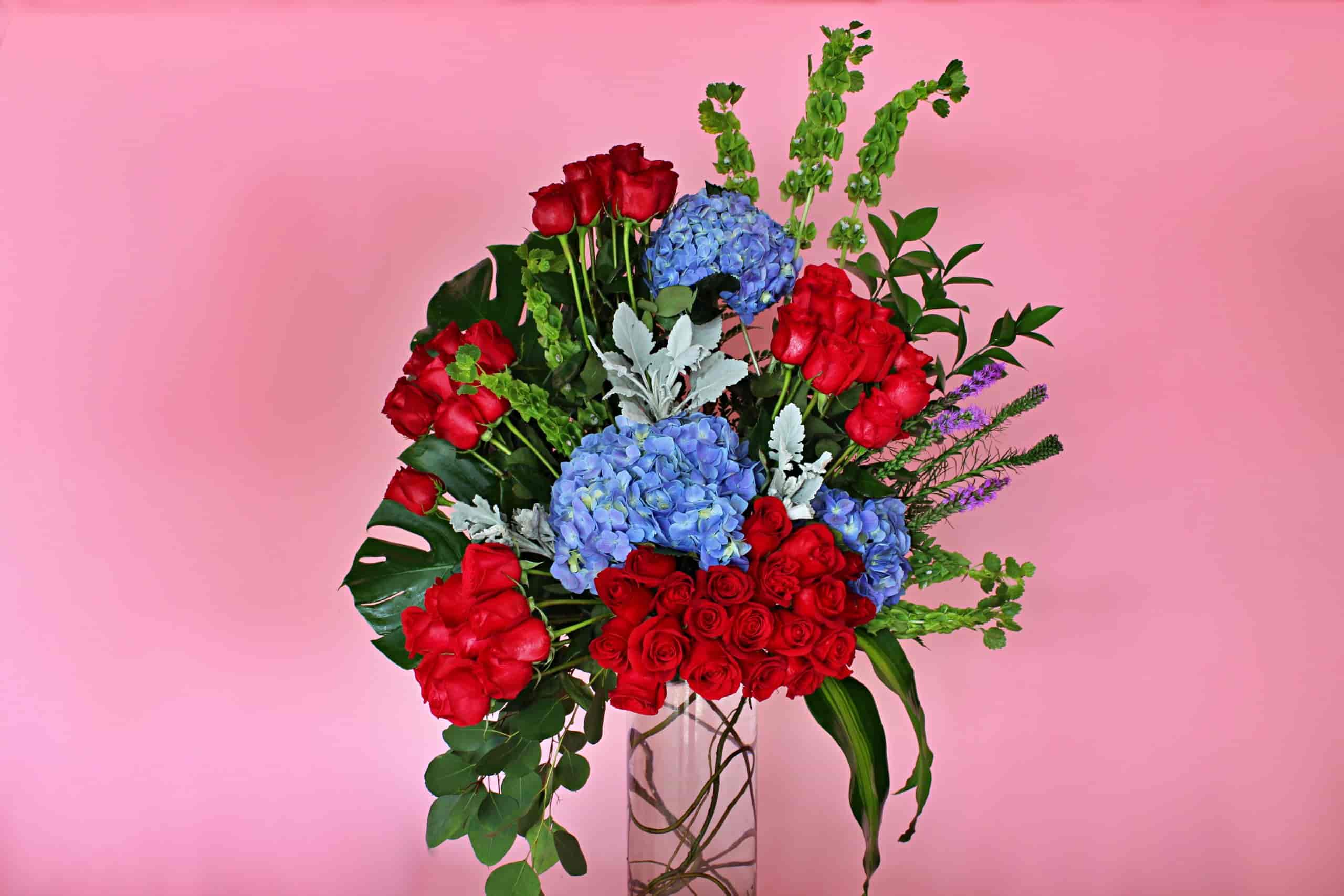 Jarrón de vidrio adornado con hortensias y rosas rojas. Ideal para cualquier ocasión.