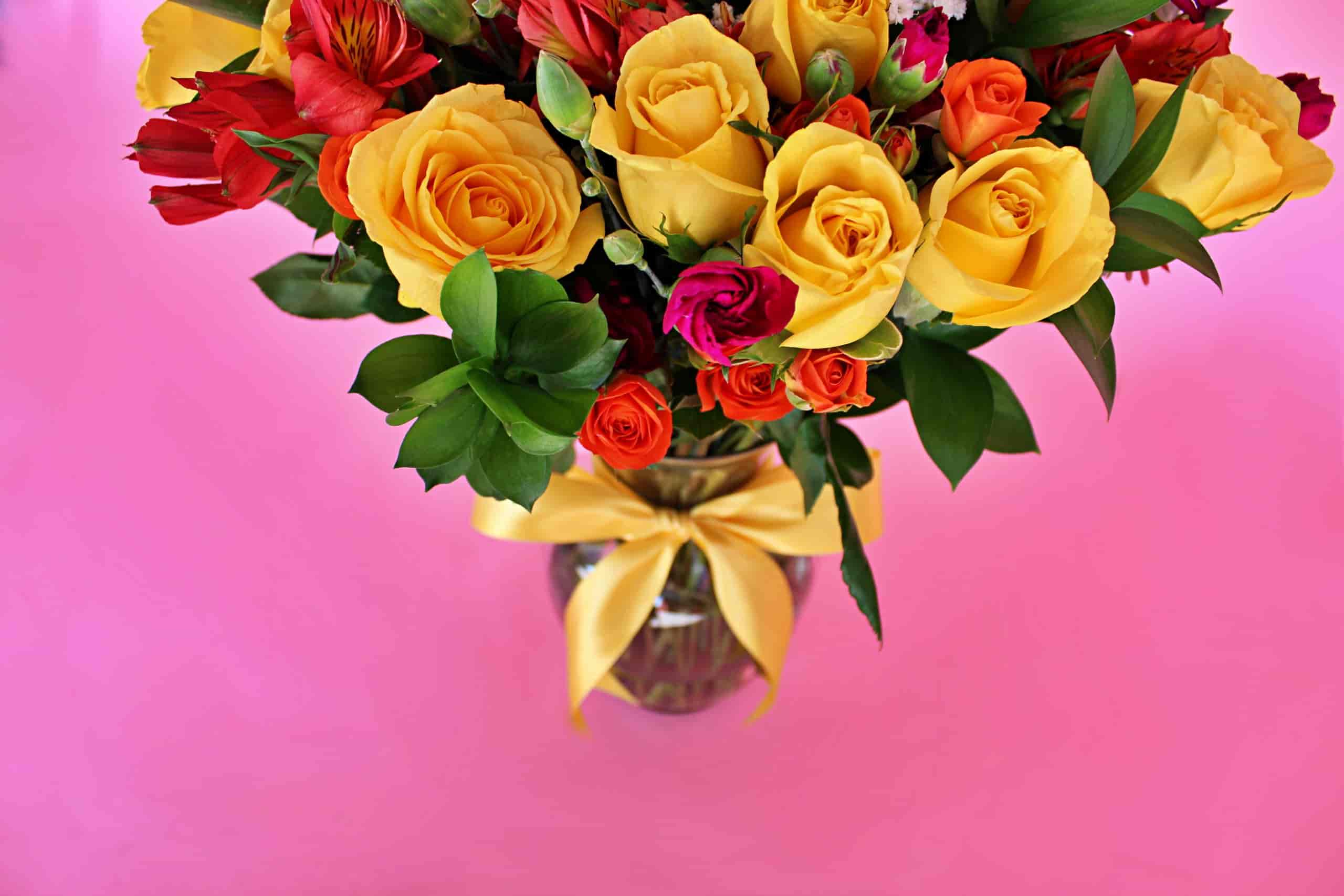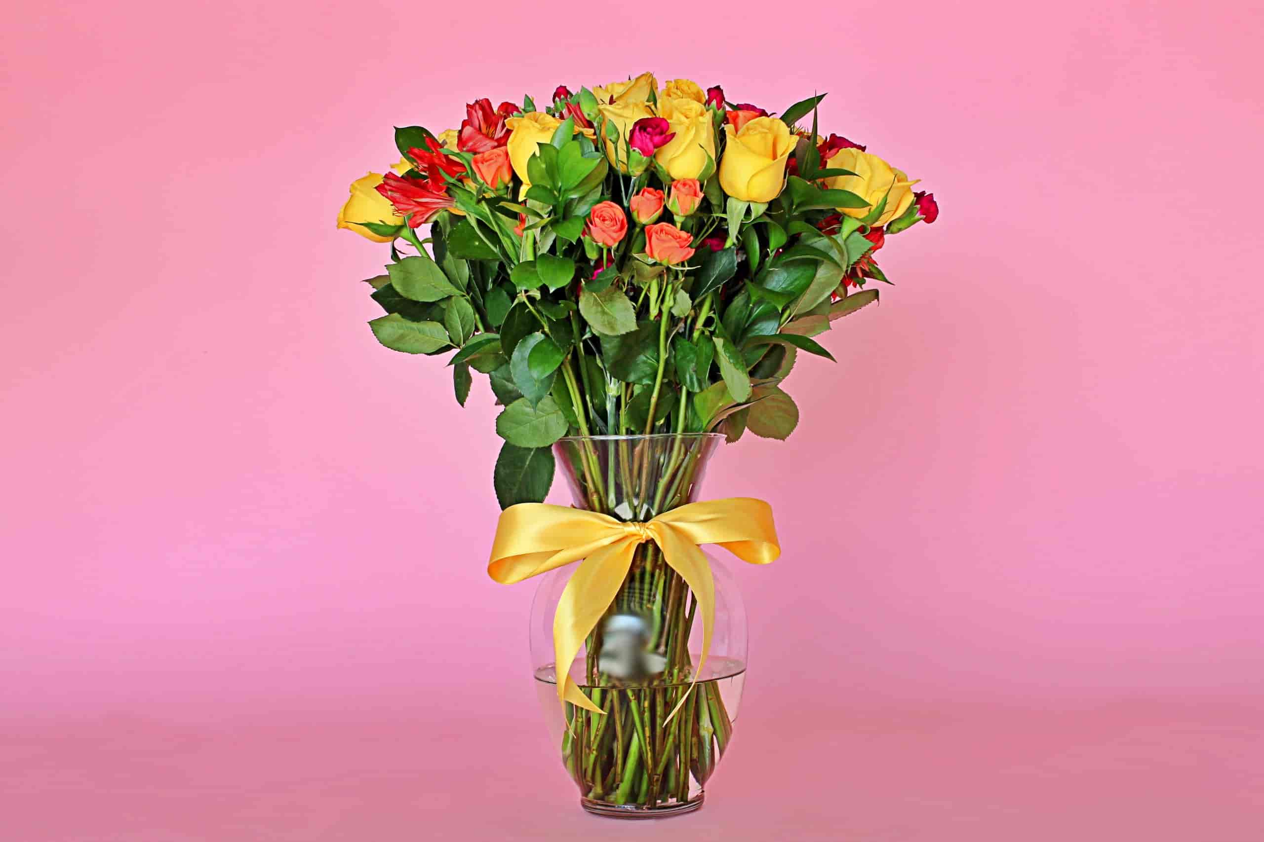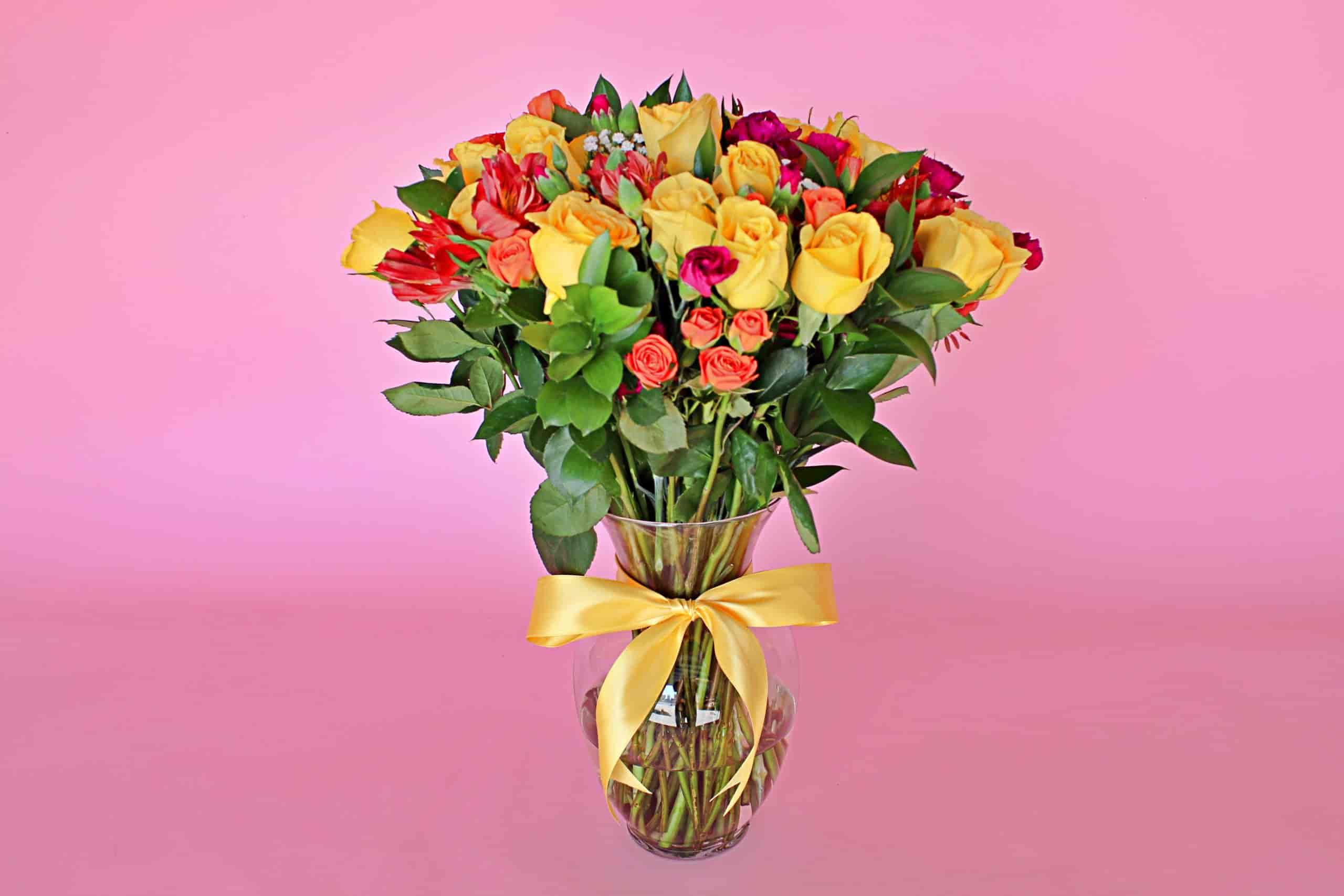 Jarrón de vidrio con 24 rosas amarillas y mini rosa. Una combinación de colores bastante agradable para la ocasión.