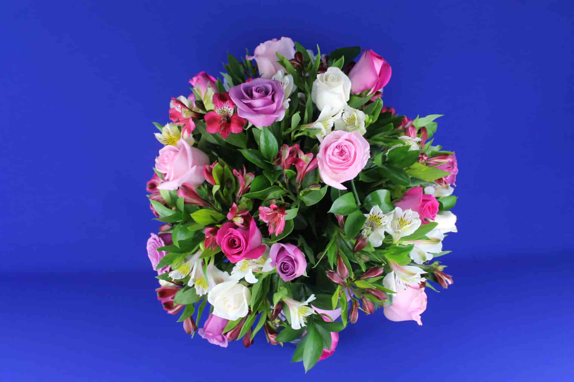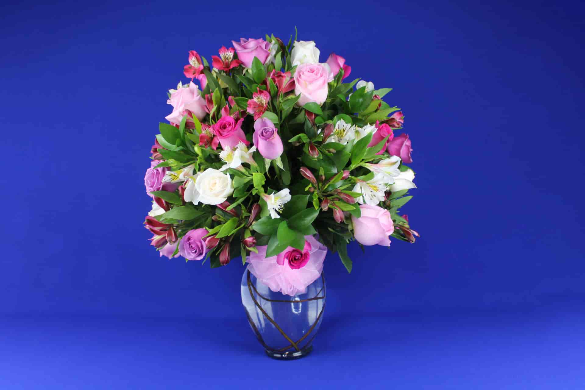 Hermoso jarrón con una bola de oasis en la boca para darle vida a 24 hermosas rosas, sus alstromerias acompañantes y el follaje ruscus.