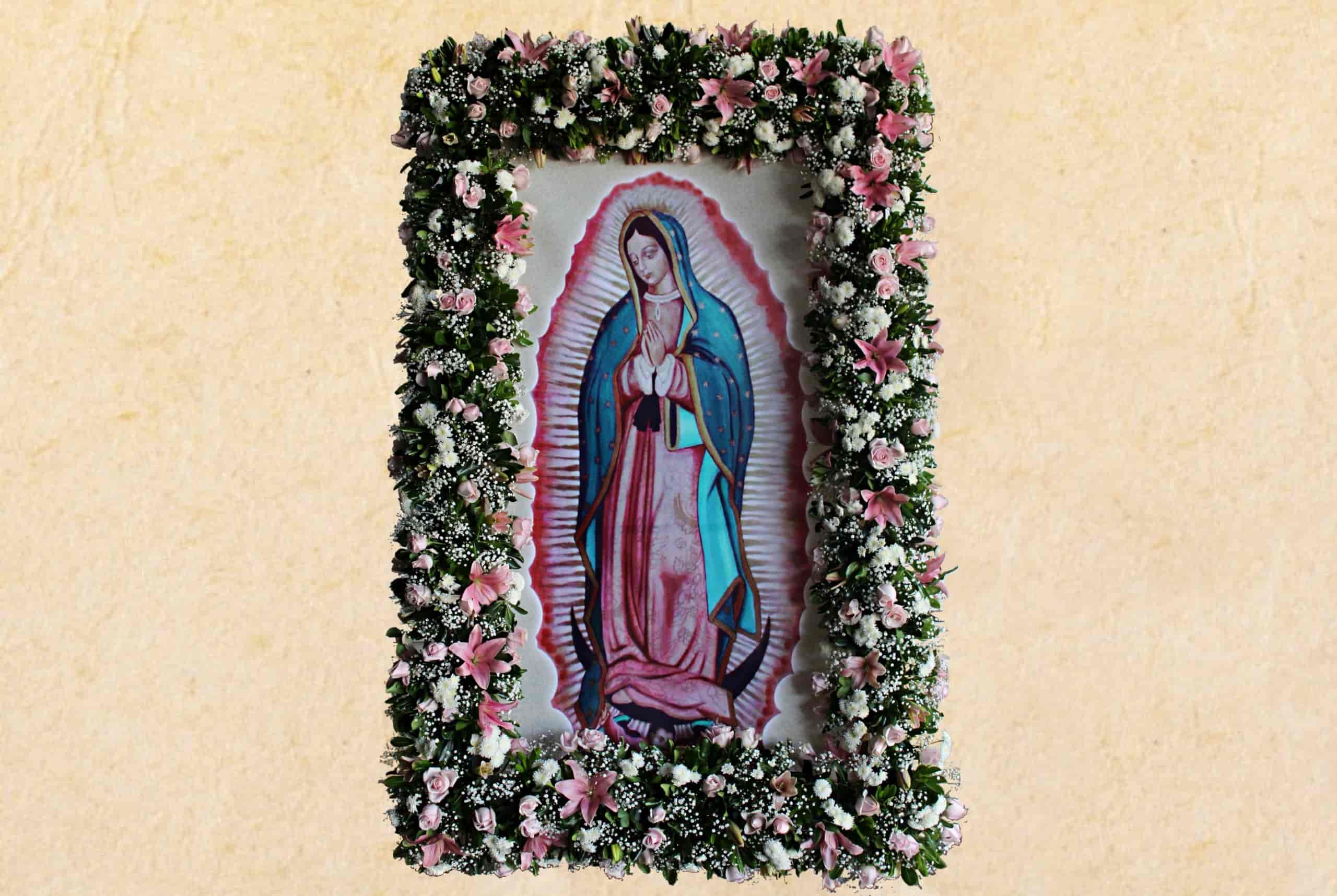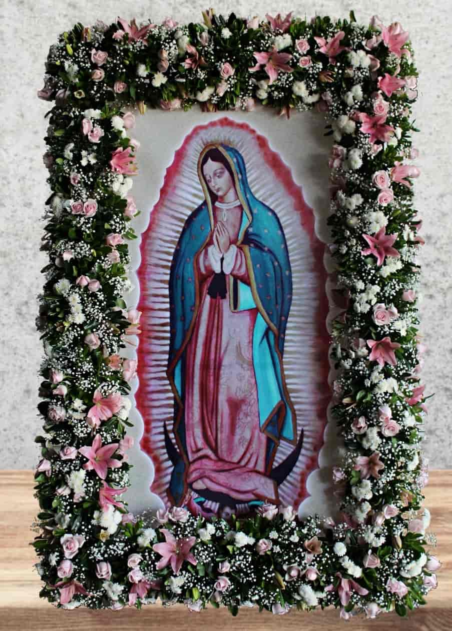 Marco funerario elaborado por nuestros floristas, con un diseño de pureza con flores rosa claro, lilys y argentina de la mejor belleza. Opción a personalizar con una imagen religiosa al centro.