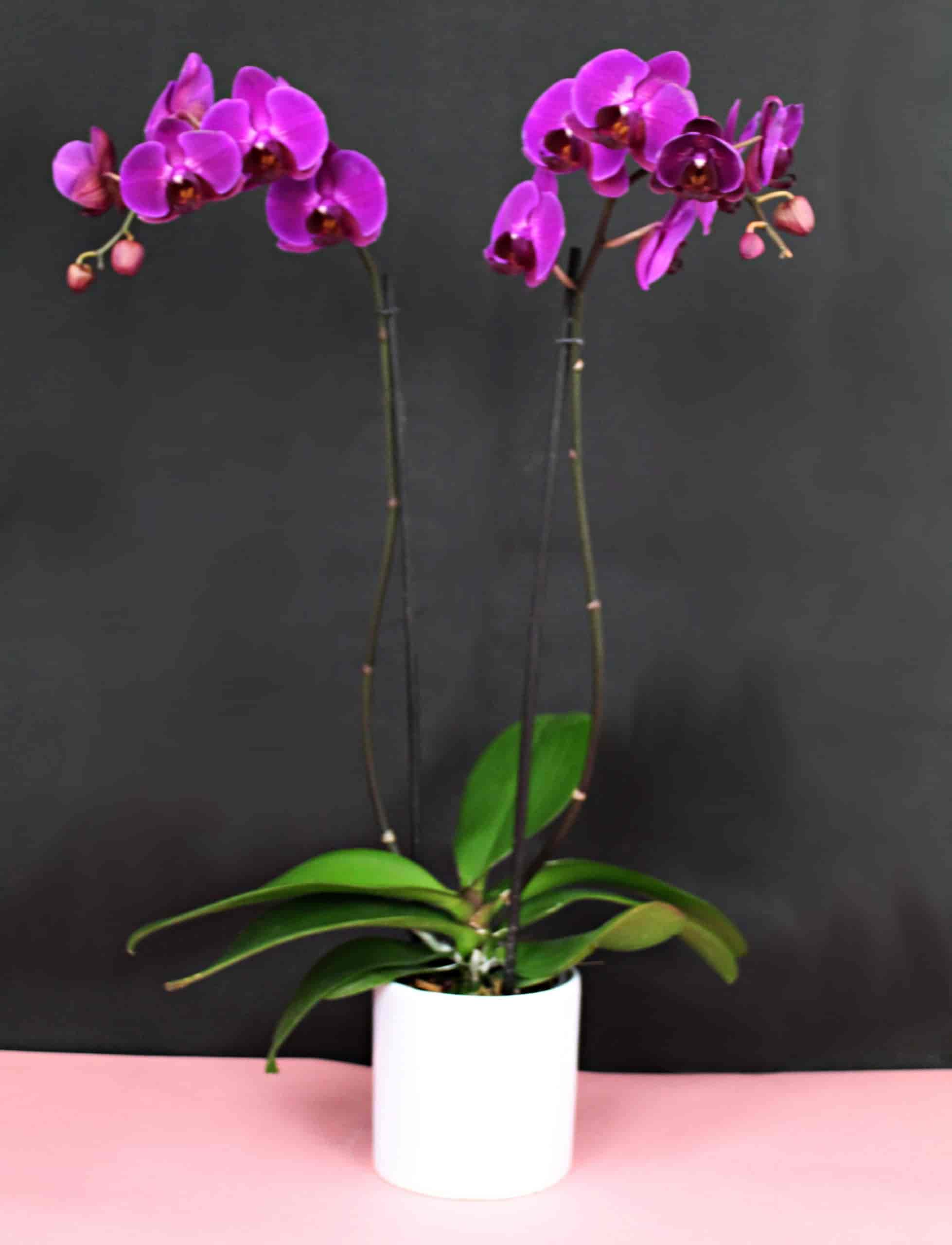 Hermosa orquídea en color morado intenso, en una base blanca de cerámica ideal para regalar, centro de mesa y muchas ocasiones más. Con esencia de larga duración su hermosura durará por meses.