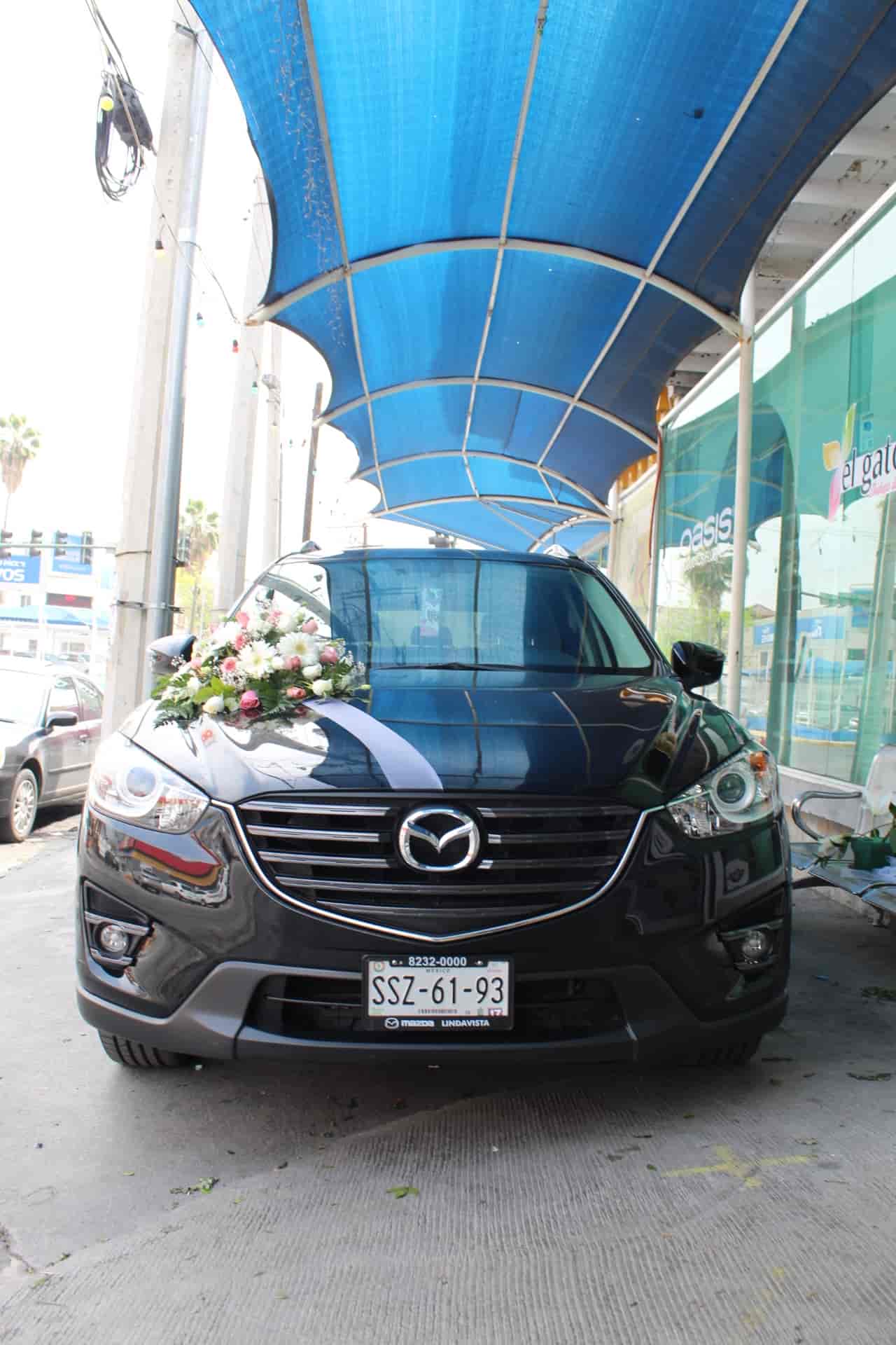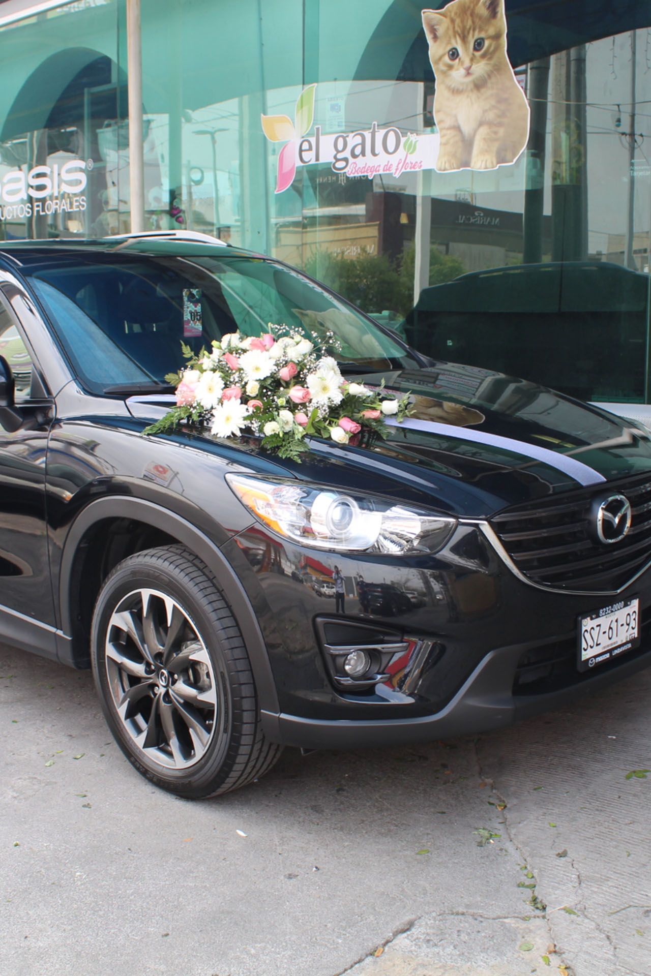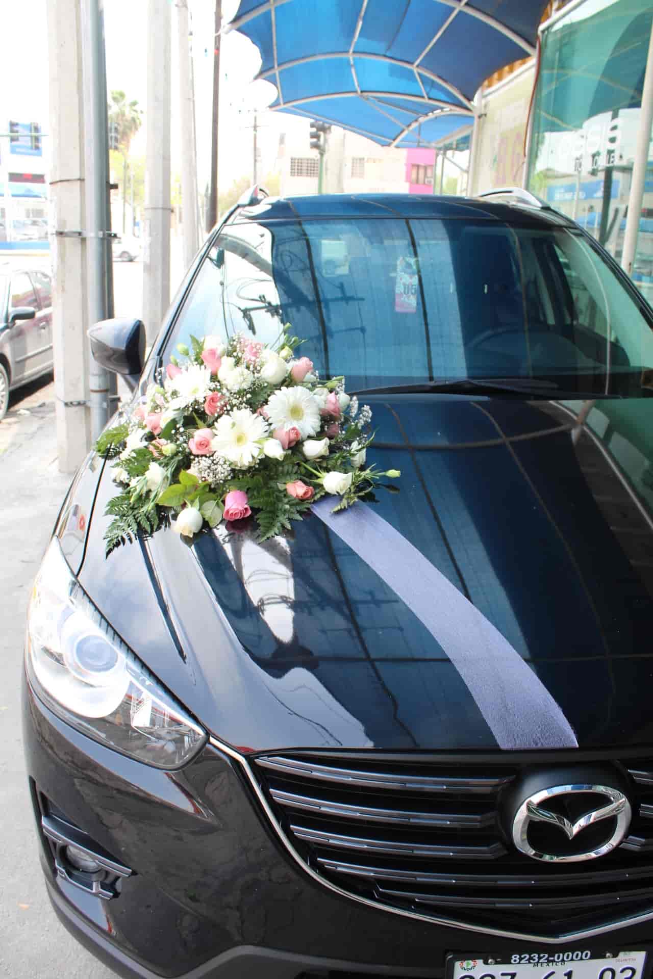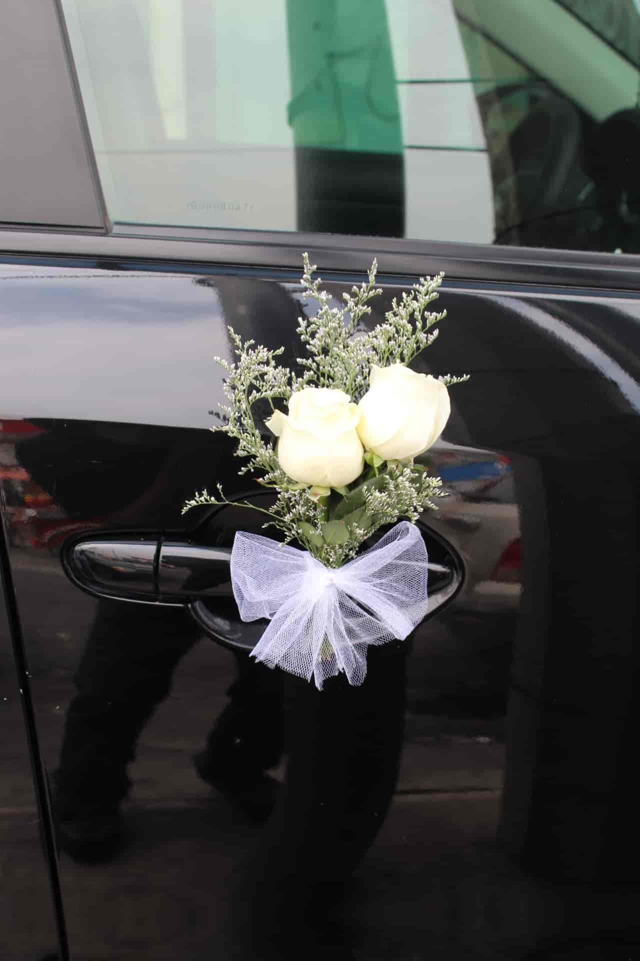 Paquete de arreglo para auto con gerbera blanca, rosa hermosa, leather, gypsohila.