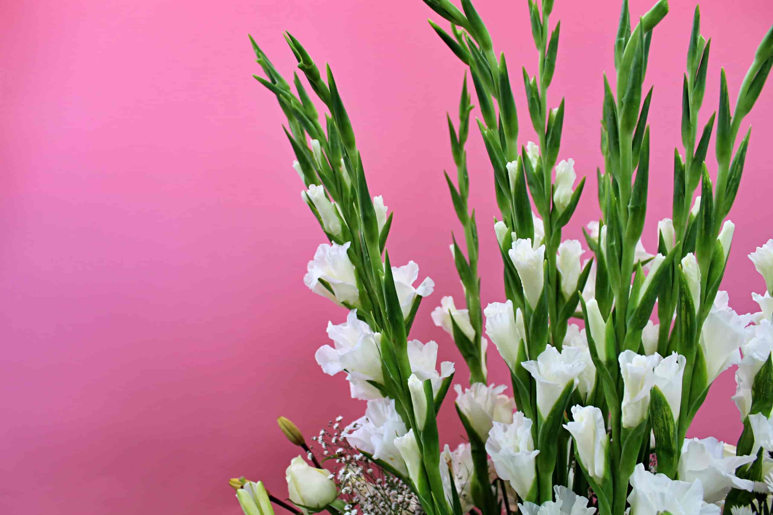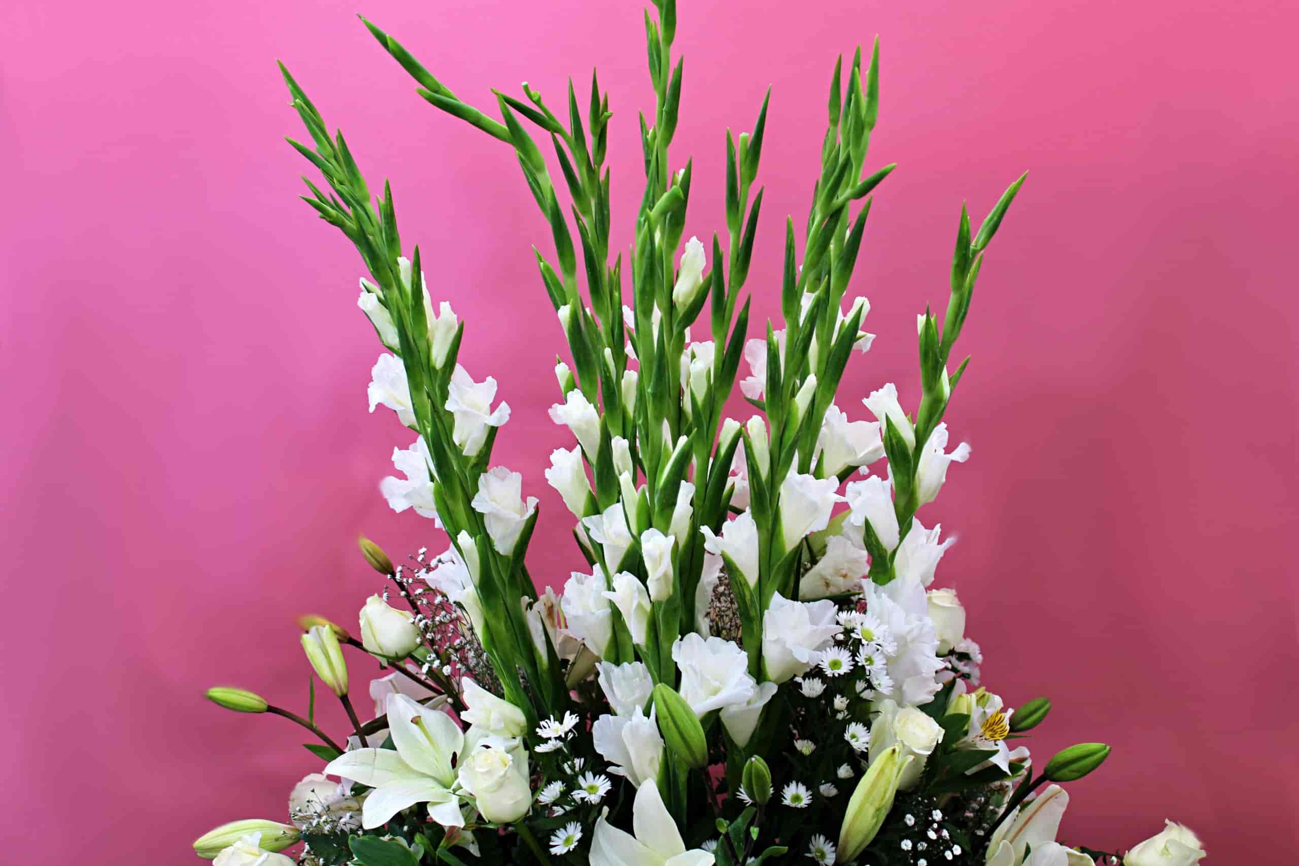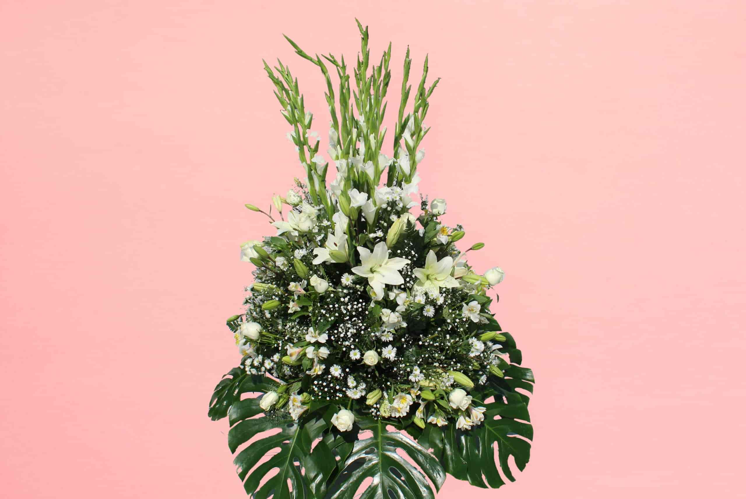 Elegante regalo floral en forma piramidal, elaborado con alstroemeria y rosas blancas. Incluye flores aromáticas de la línea lilium que durante su antesis te darán la mejor experiencia.