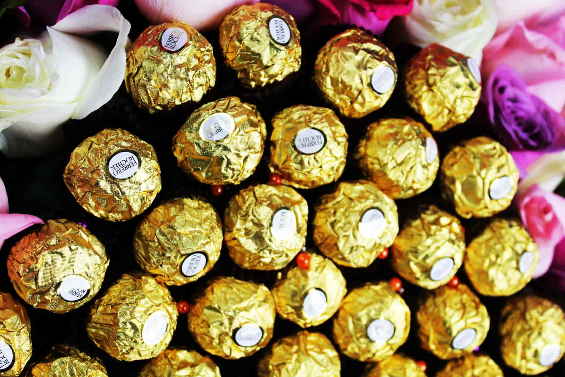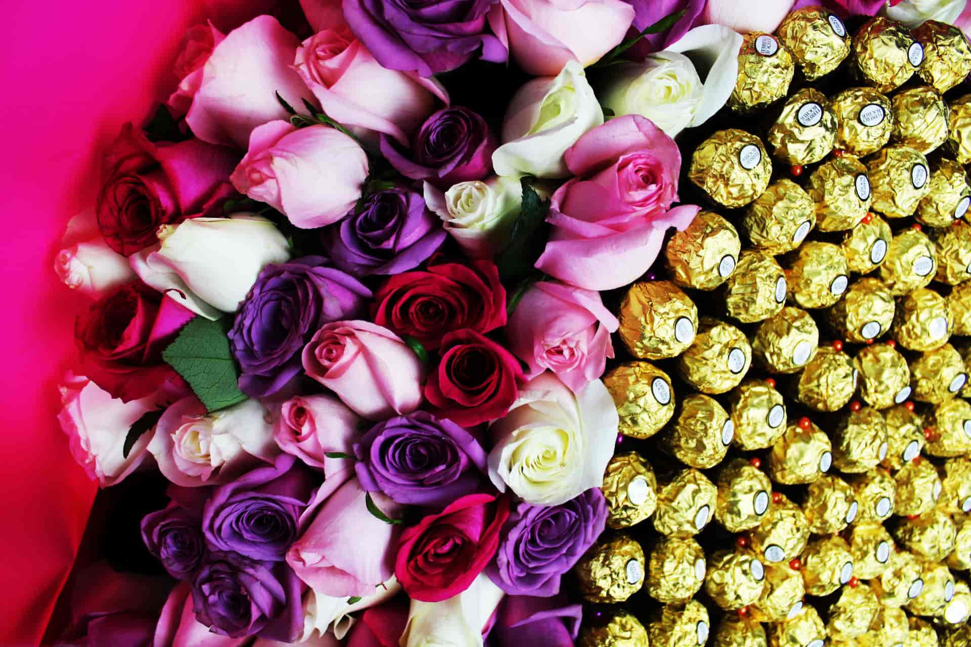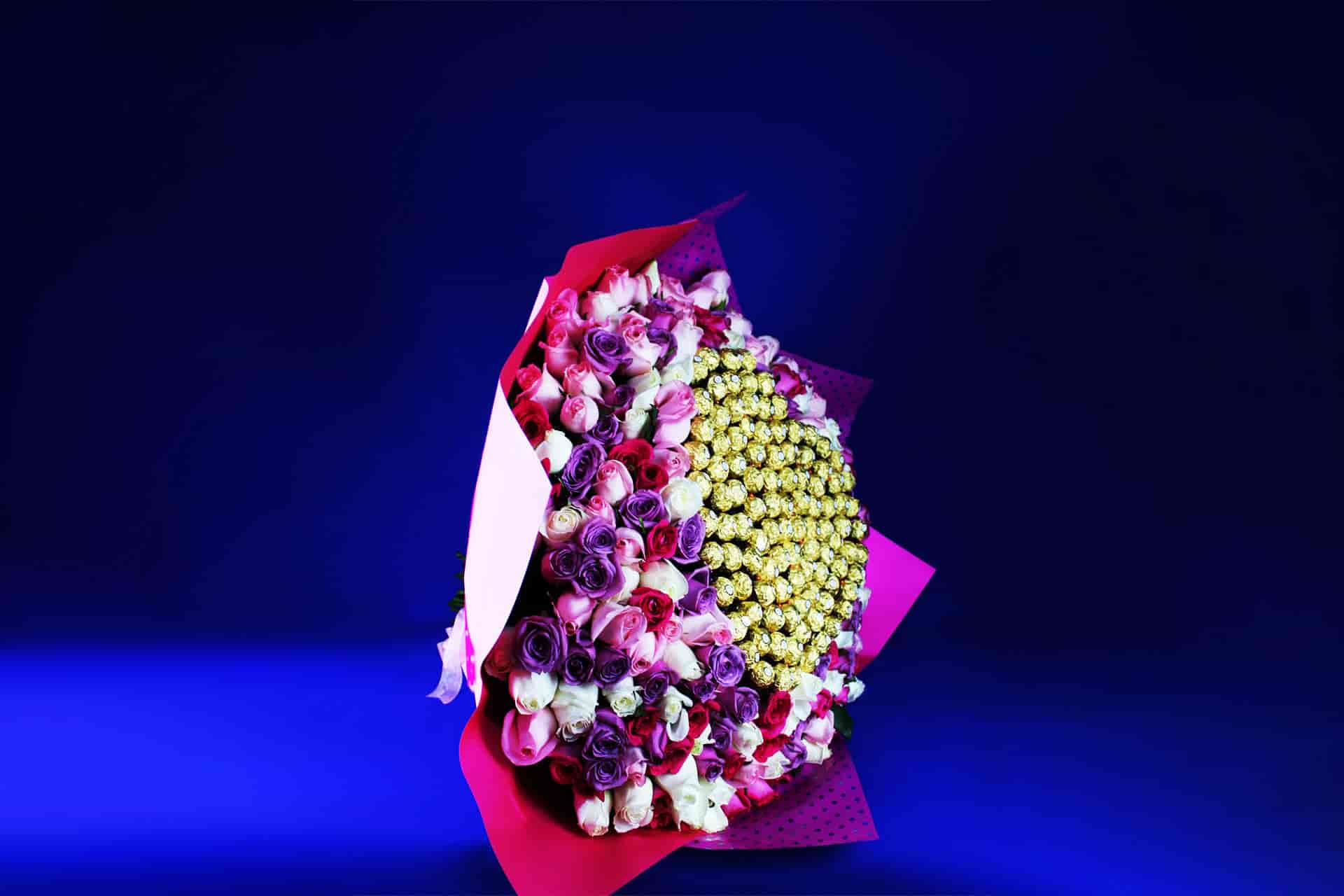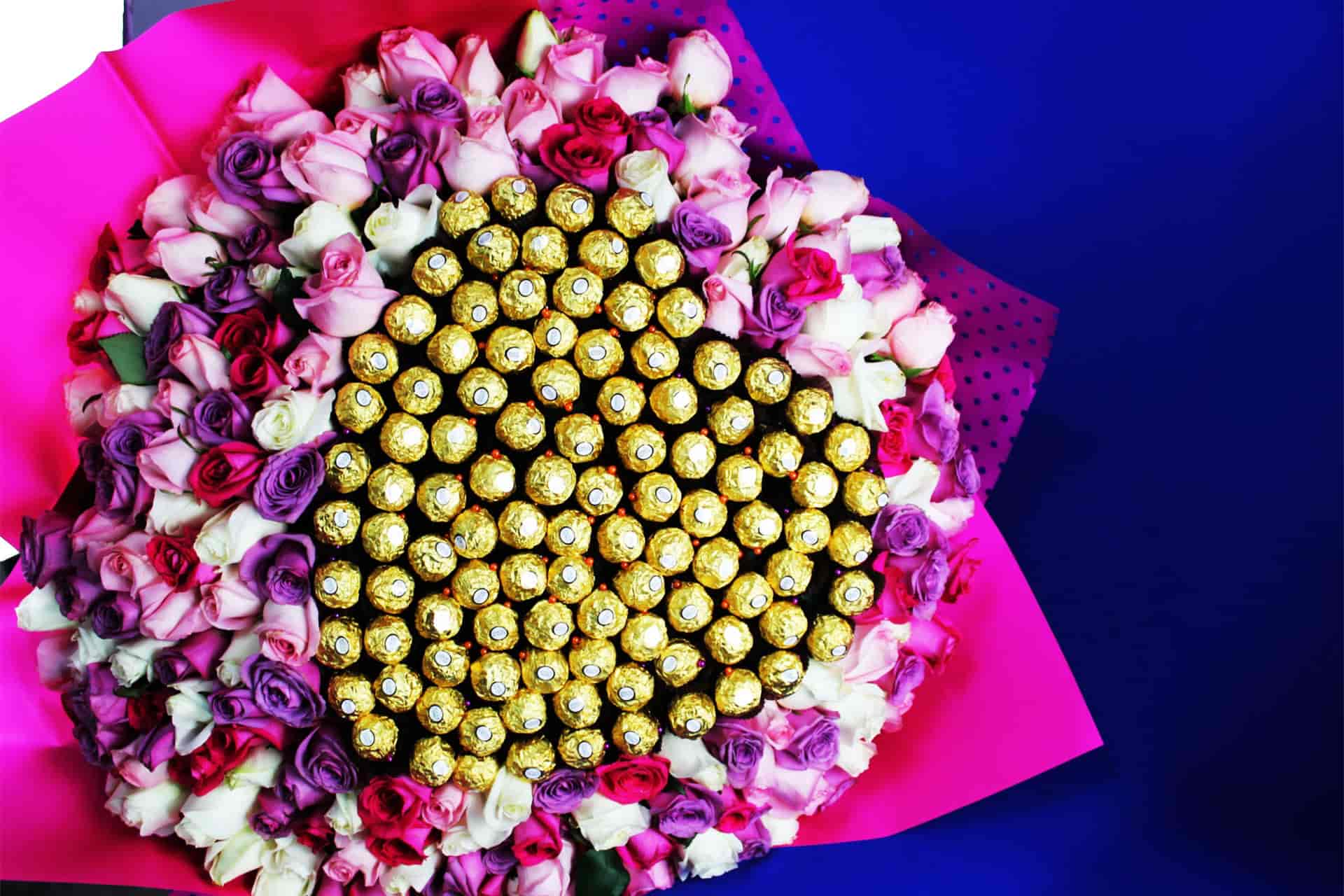 Ramos de 200 rosas en tonos pastel con 100 chocolates Ferrero en forma de corazón.