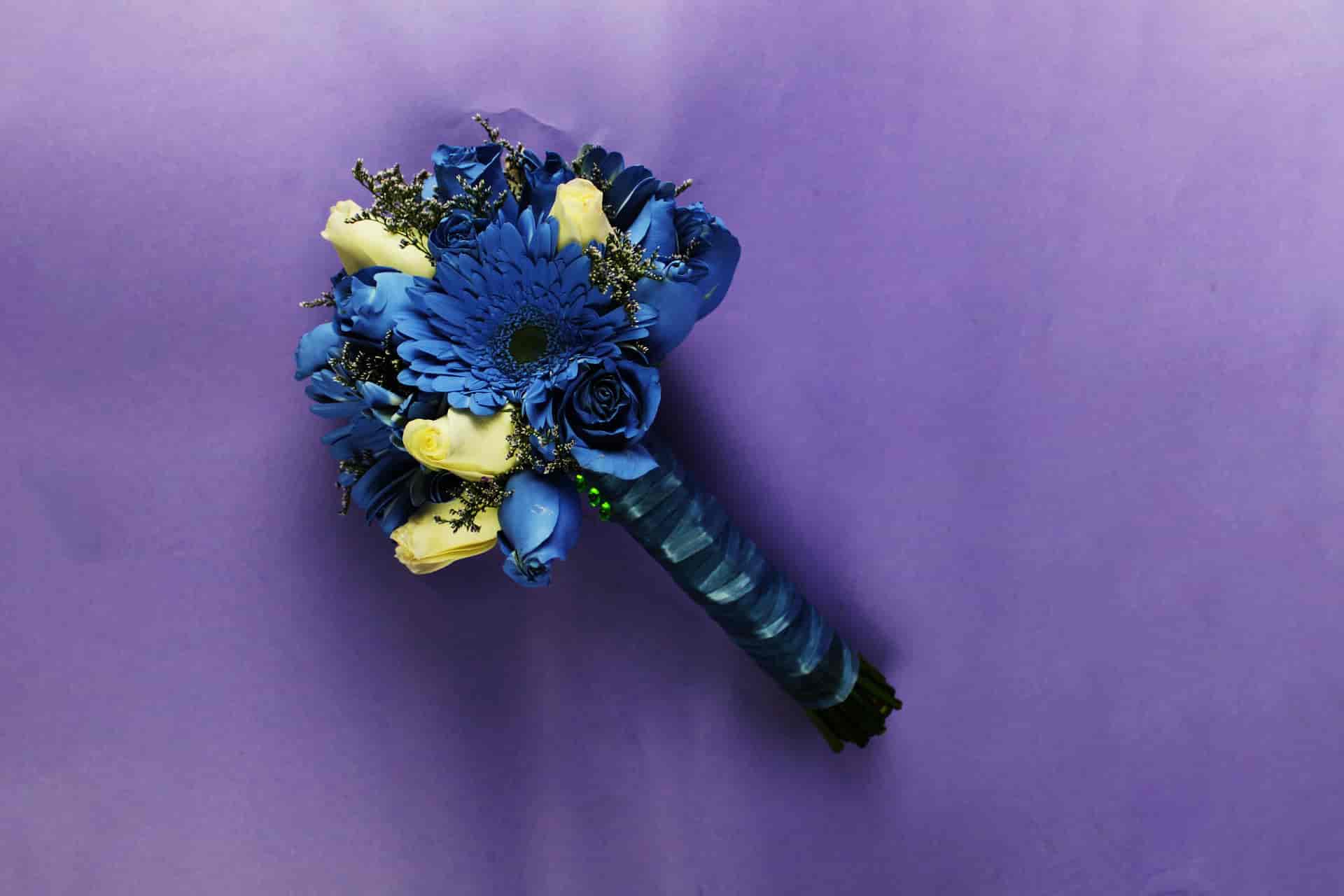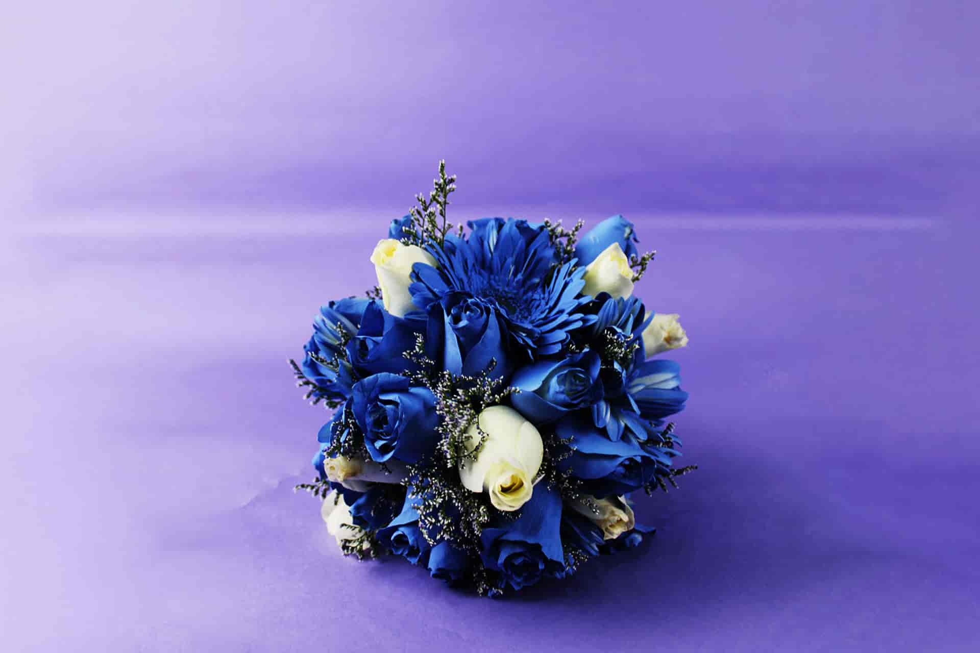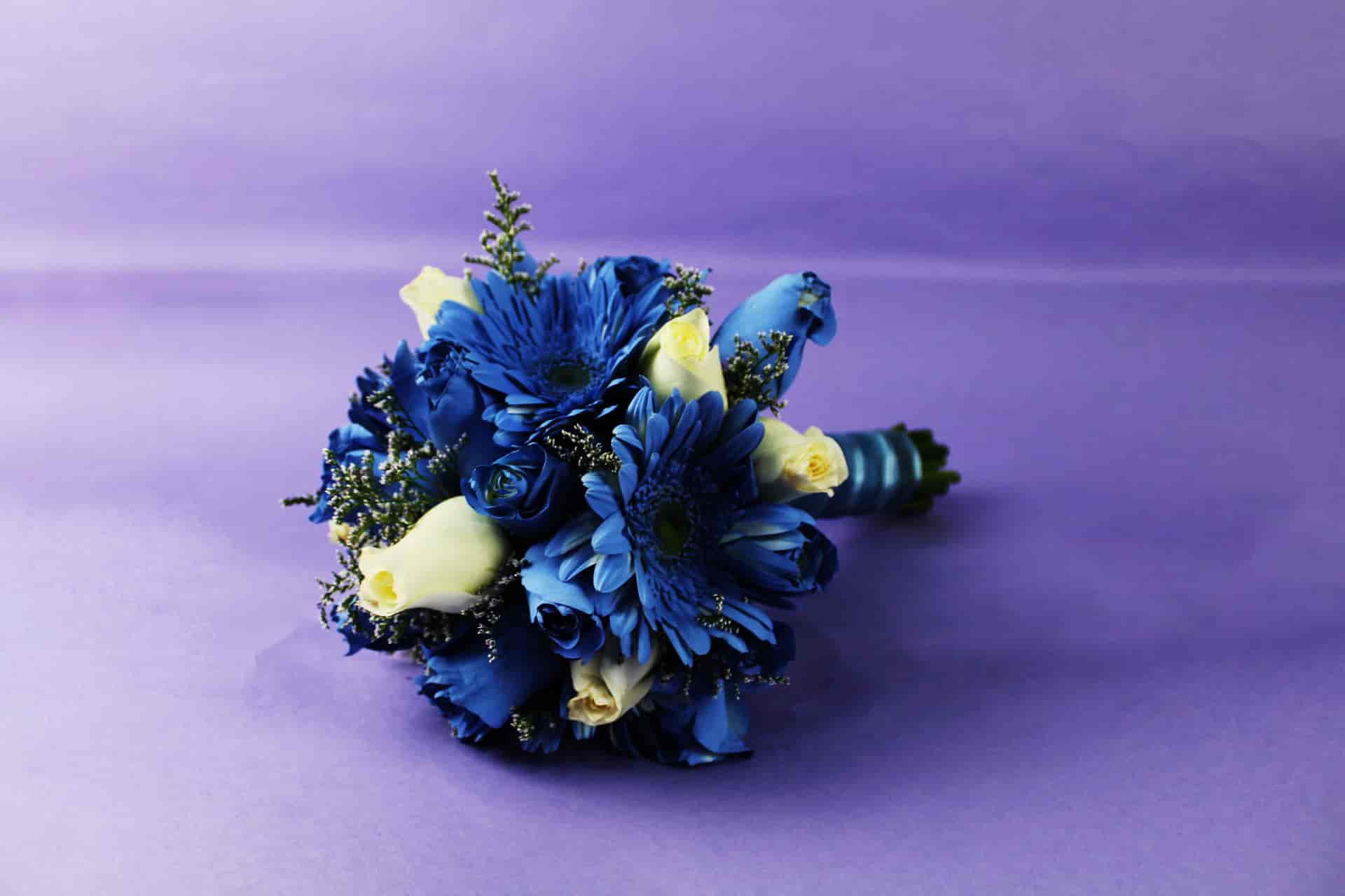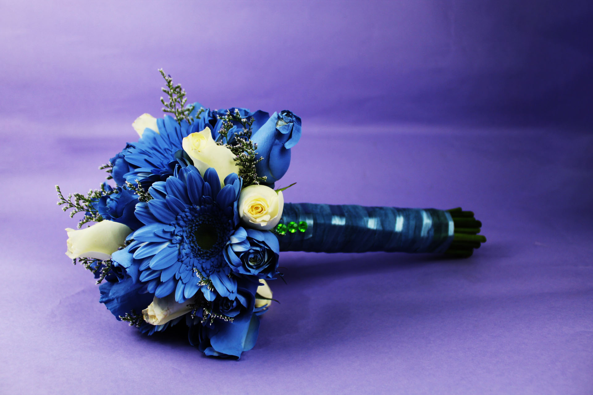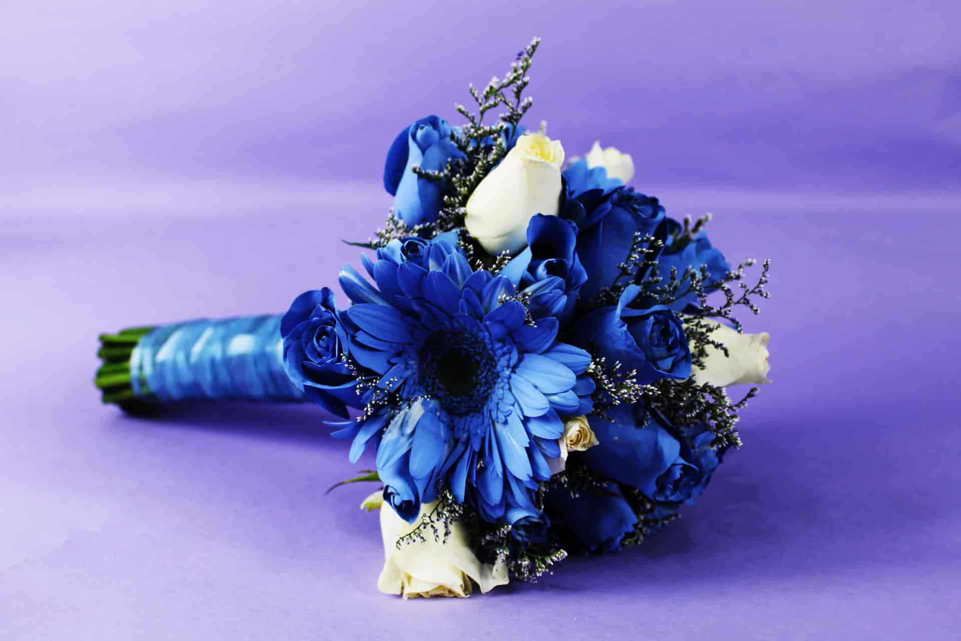 Exquisito ramo con gerberas y y rosas blancas pintadas de azúl, adornado con notas de limonium.