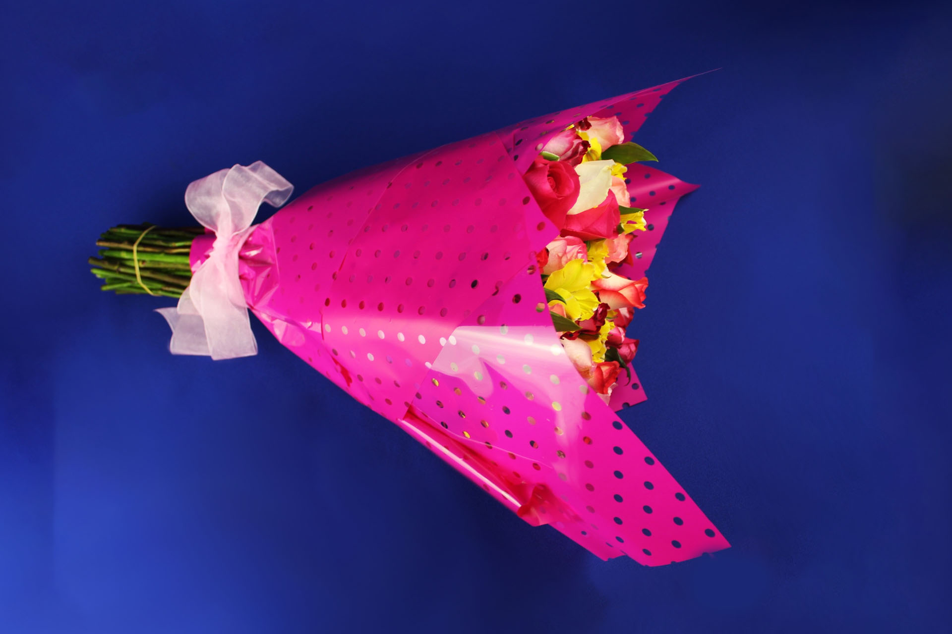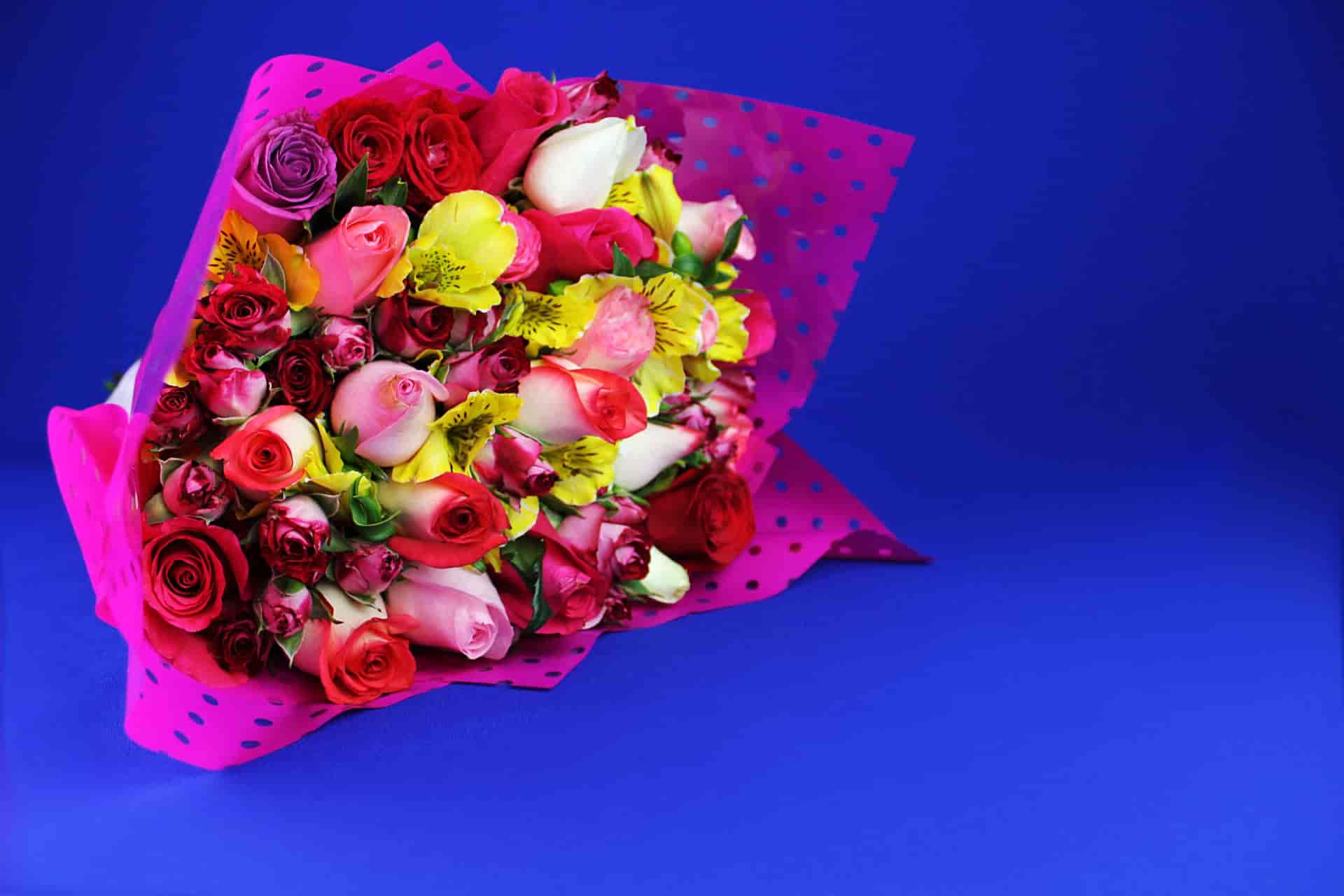 Bouquet de 24 rosas color rosa, roja, fucsia y lila con alstroemeria teñida mas follaje.