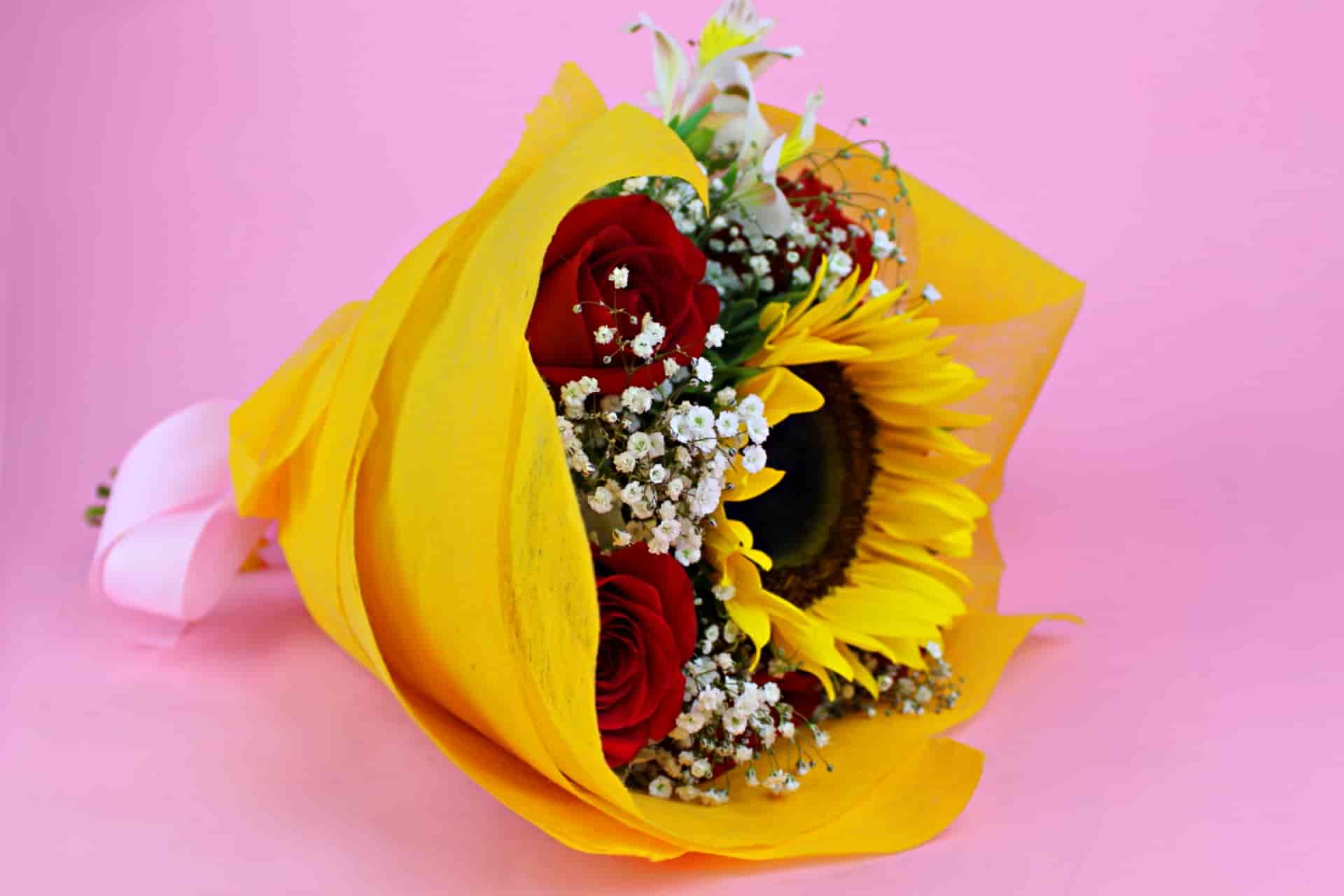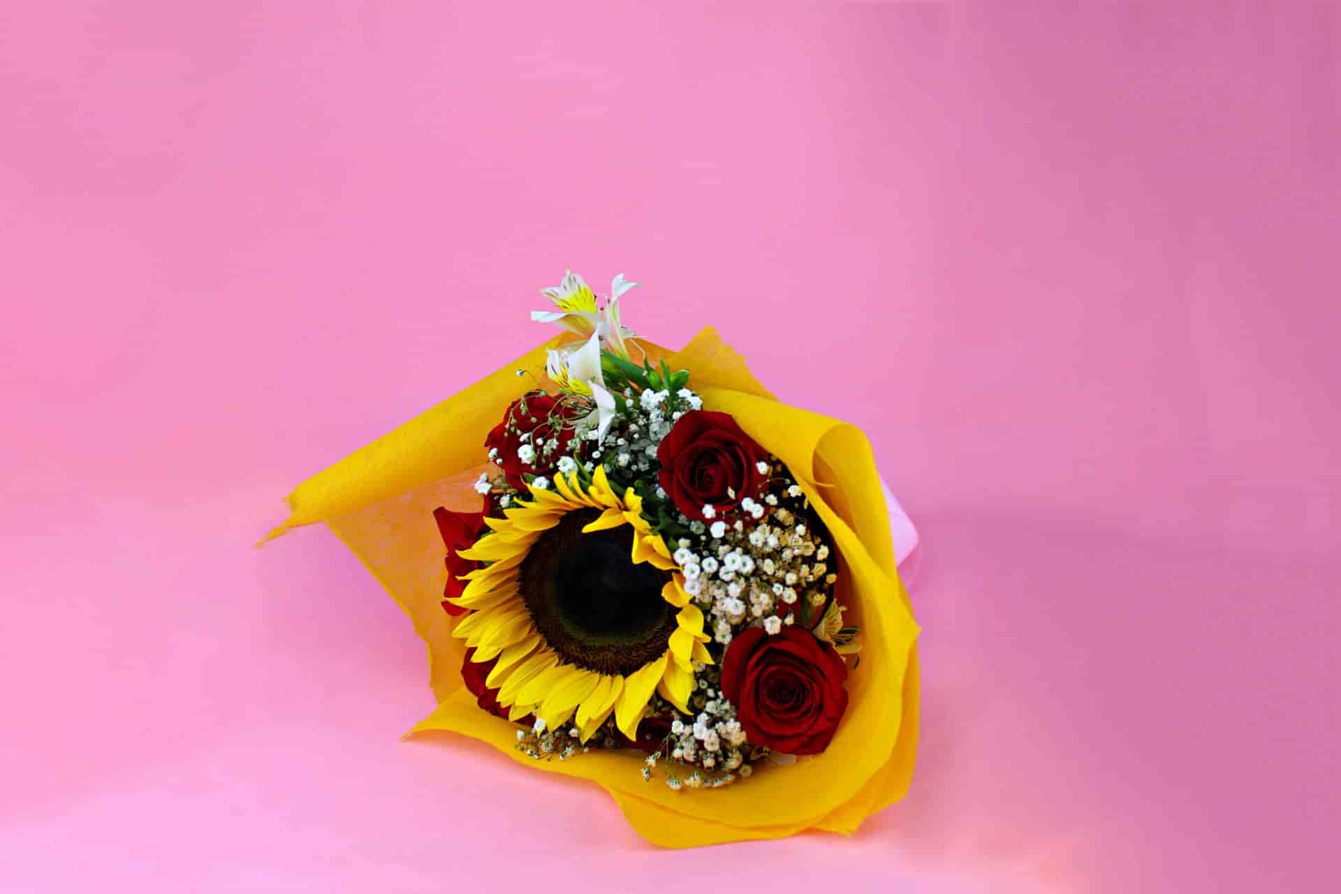 Lo más sencillo es lo mas elegante, por eso regala este hermoso ramo con 6 rosas rojas, un girasol gigante, alstroemeria y baby breath.
