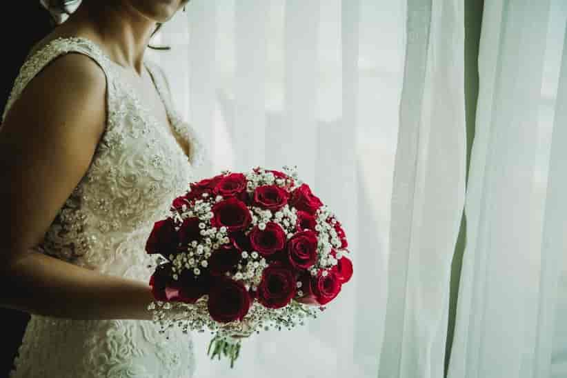 Hermoso ramo de novia, elaborado con 30 rosas rojas y gypsophilia.