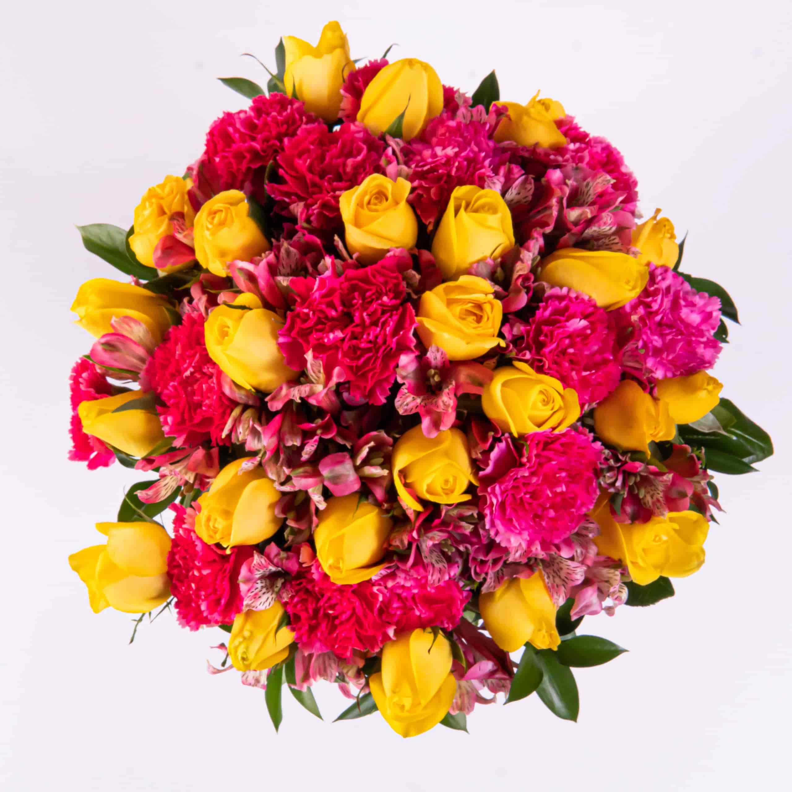Jarrón de vidrio con 24 rosas amarillas, claveles y alstroemeria en color rosa, decorados con un hermoso listón en organza o tulle.