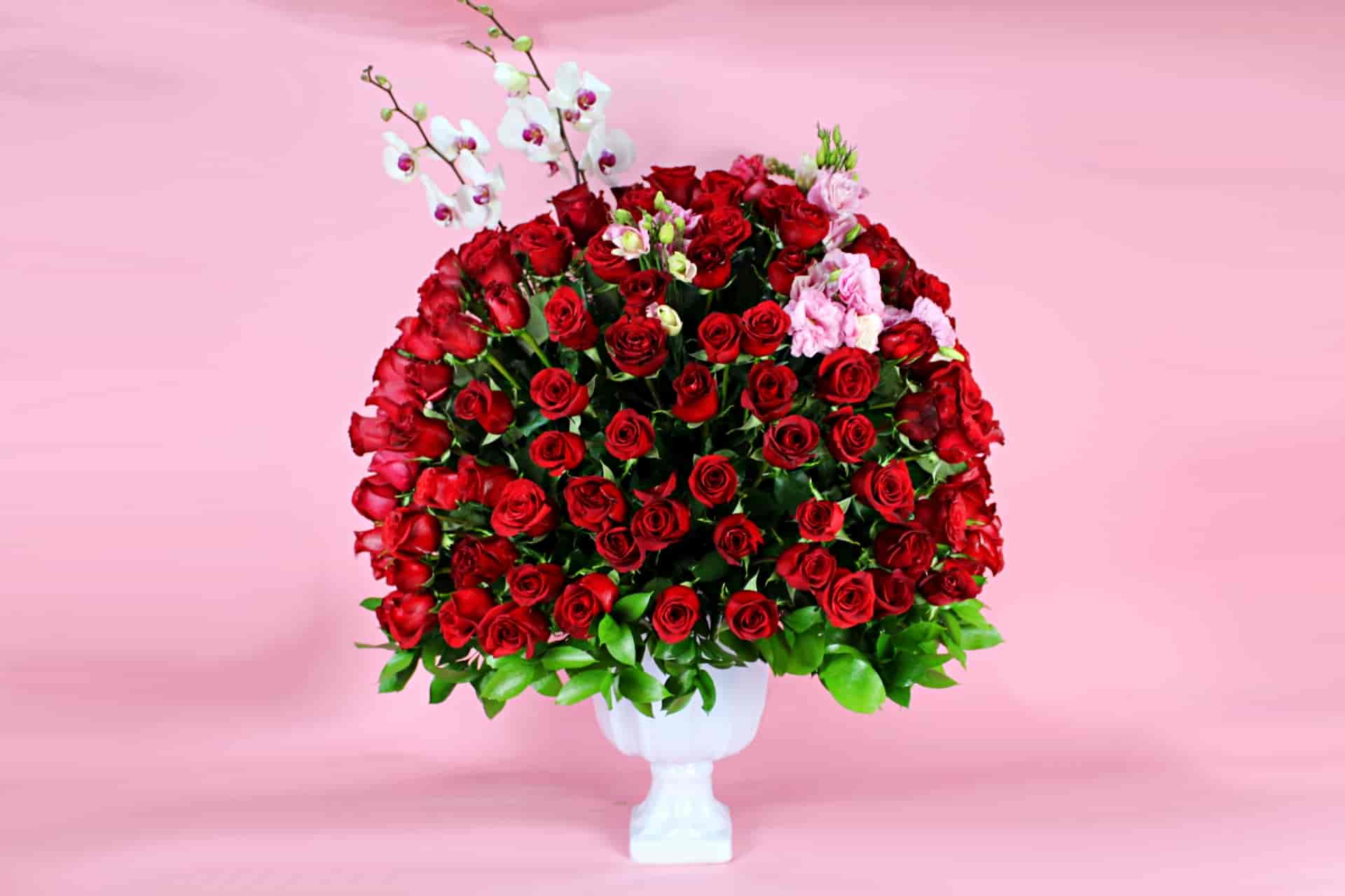 Hermosa esfera floral montada en una base de cerámica compuesta por 200 rosas rojas, 2 varas de orquídea y lisianthus.