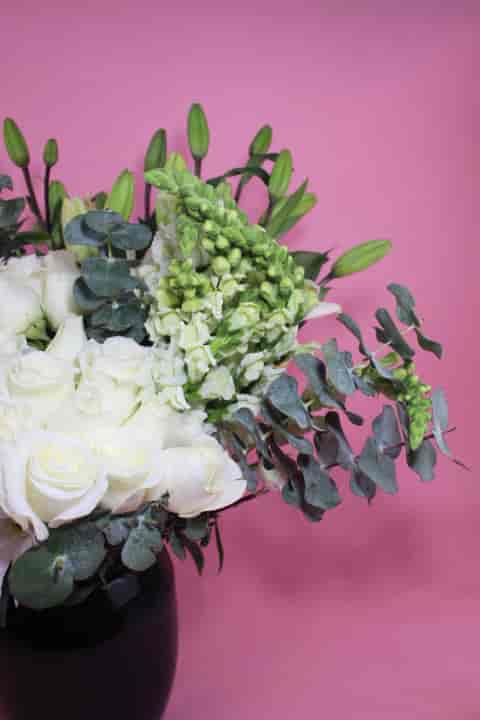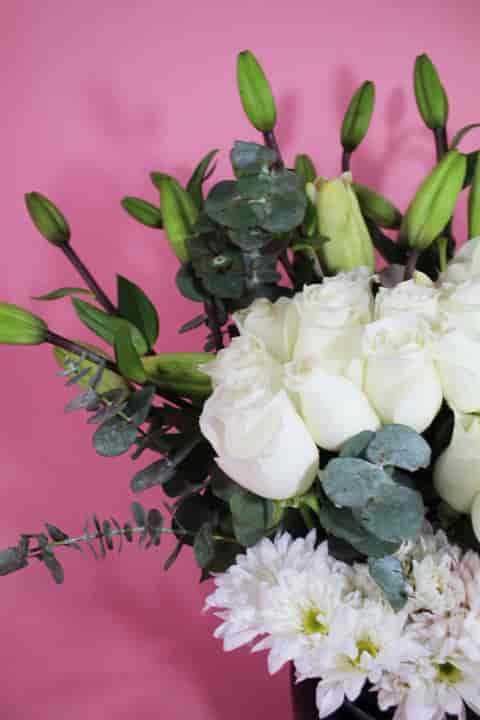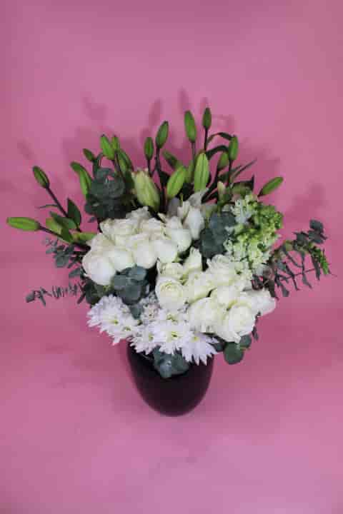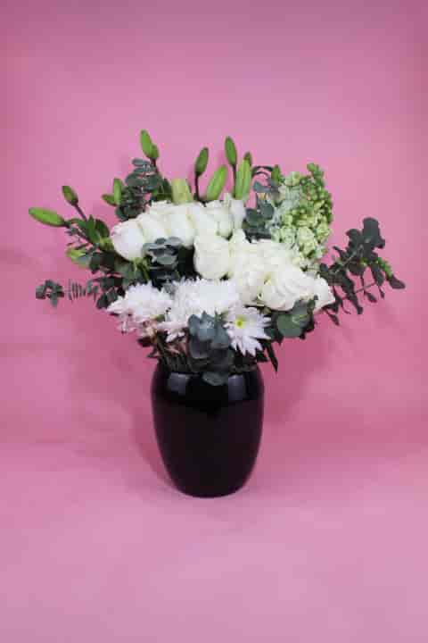 Arreglo fúnebre con base cerámica negra con 12 rosas blanca, perritos blancos, margarita blanca y dollar.