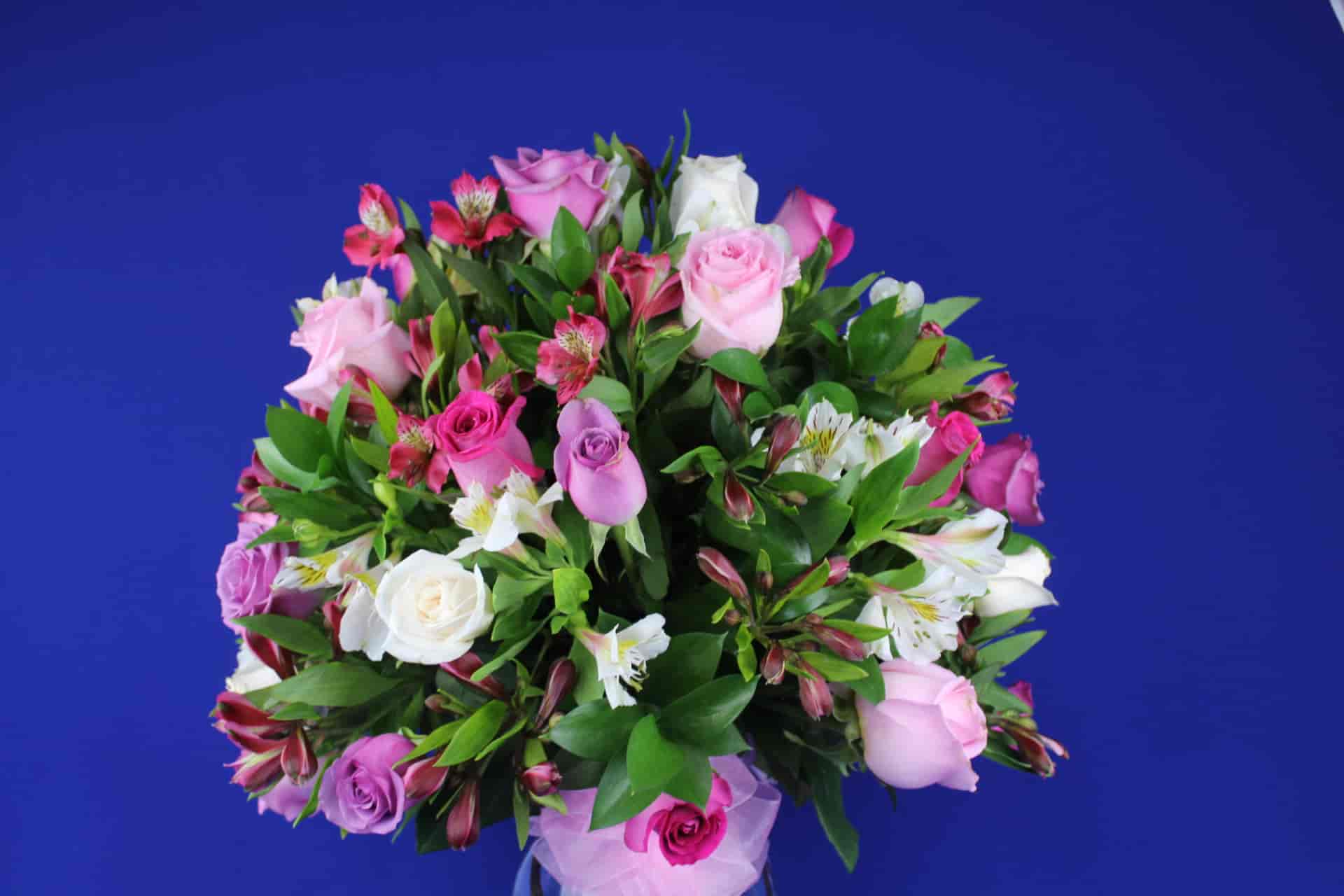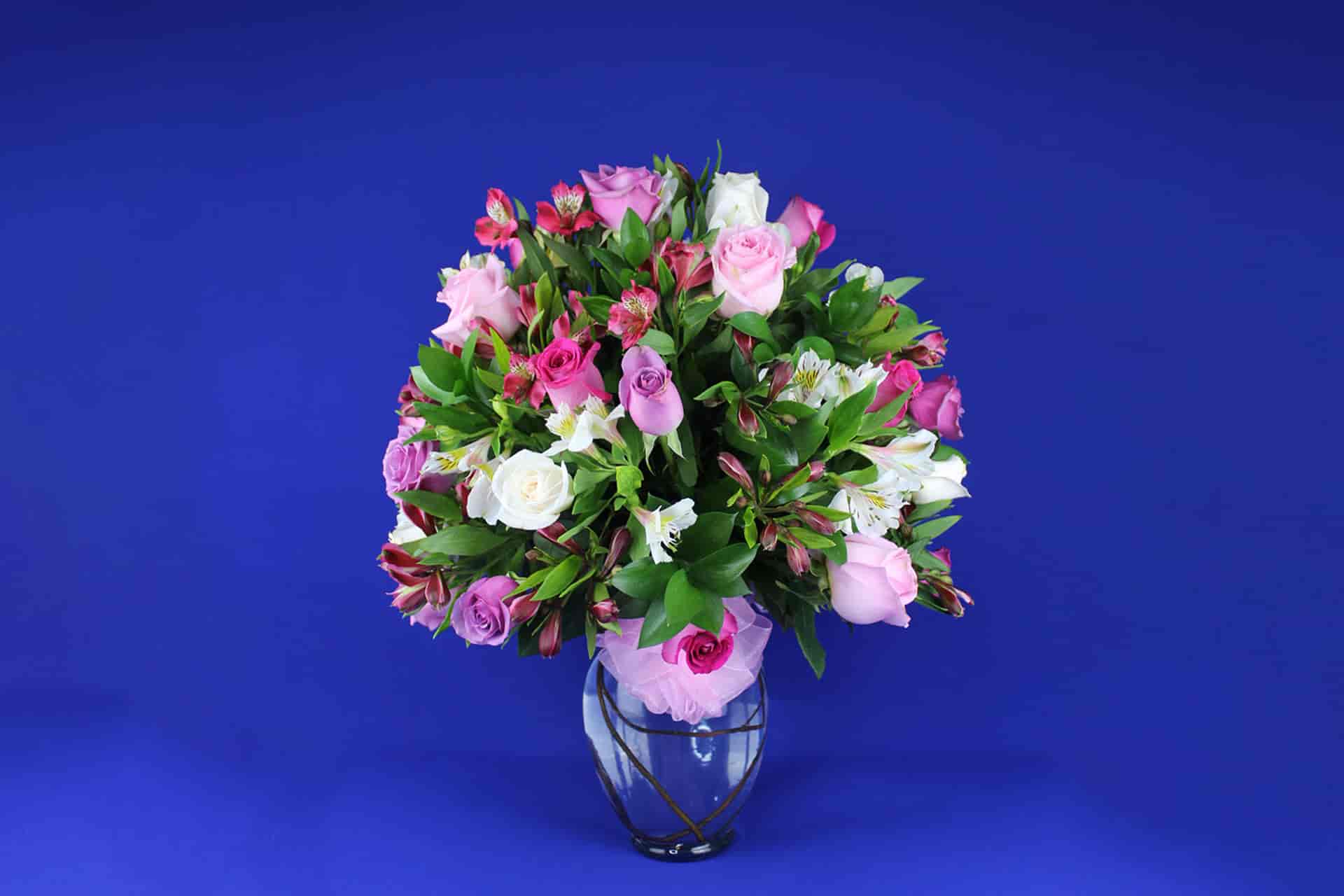 Hermoso jarrón con una bola de oasis en la boca para darle vida a 24 hermosas rosas, sus alstromerias acompañantes y el follaje ruscus.