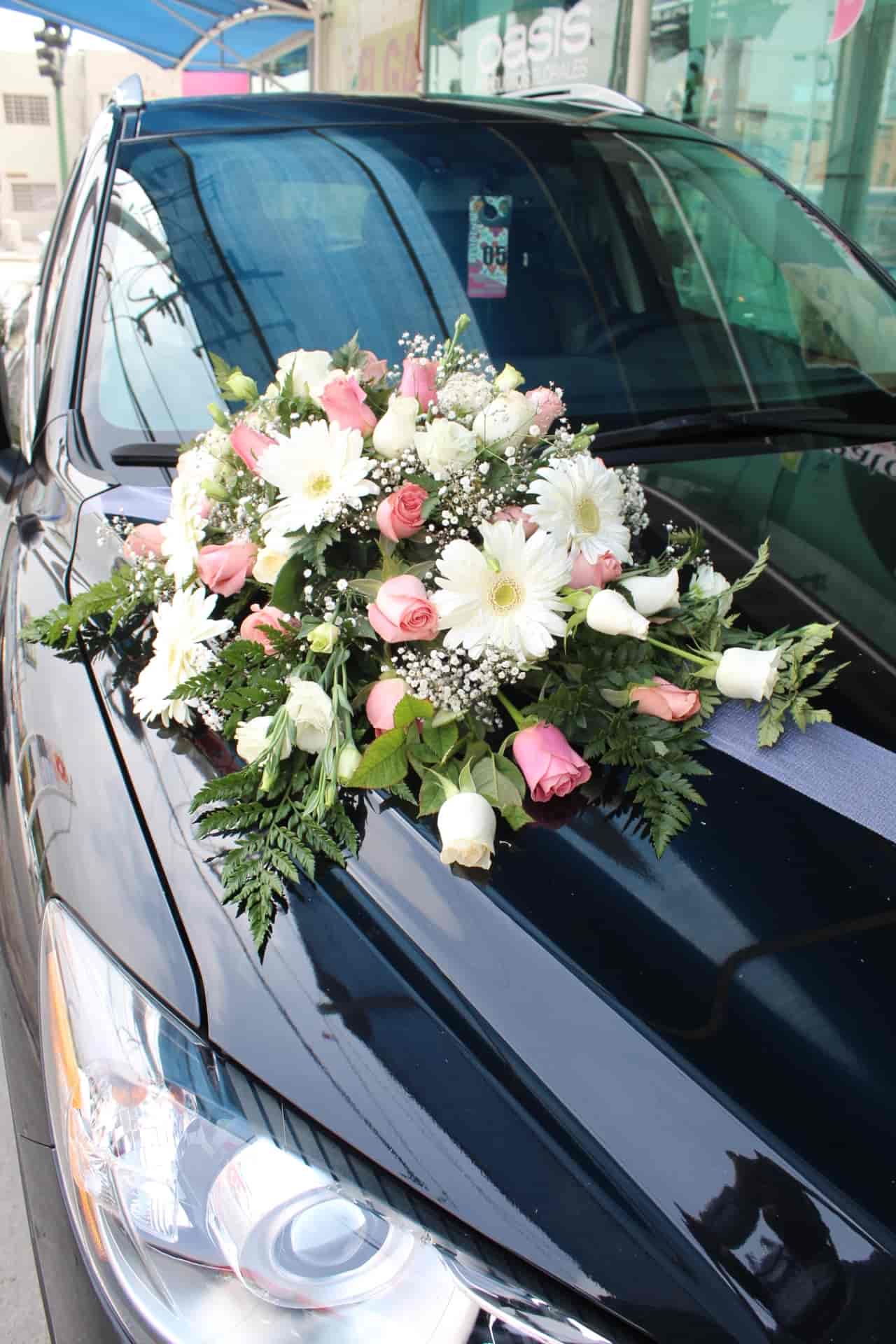 Paquete de arreglo para auto con gerbera blanca, rosa hermosa, leather, gypsohila.