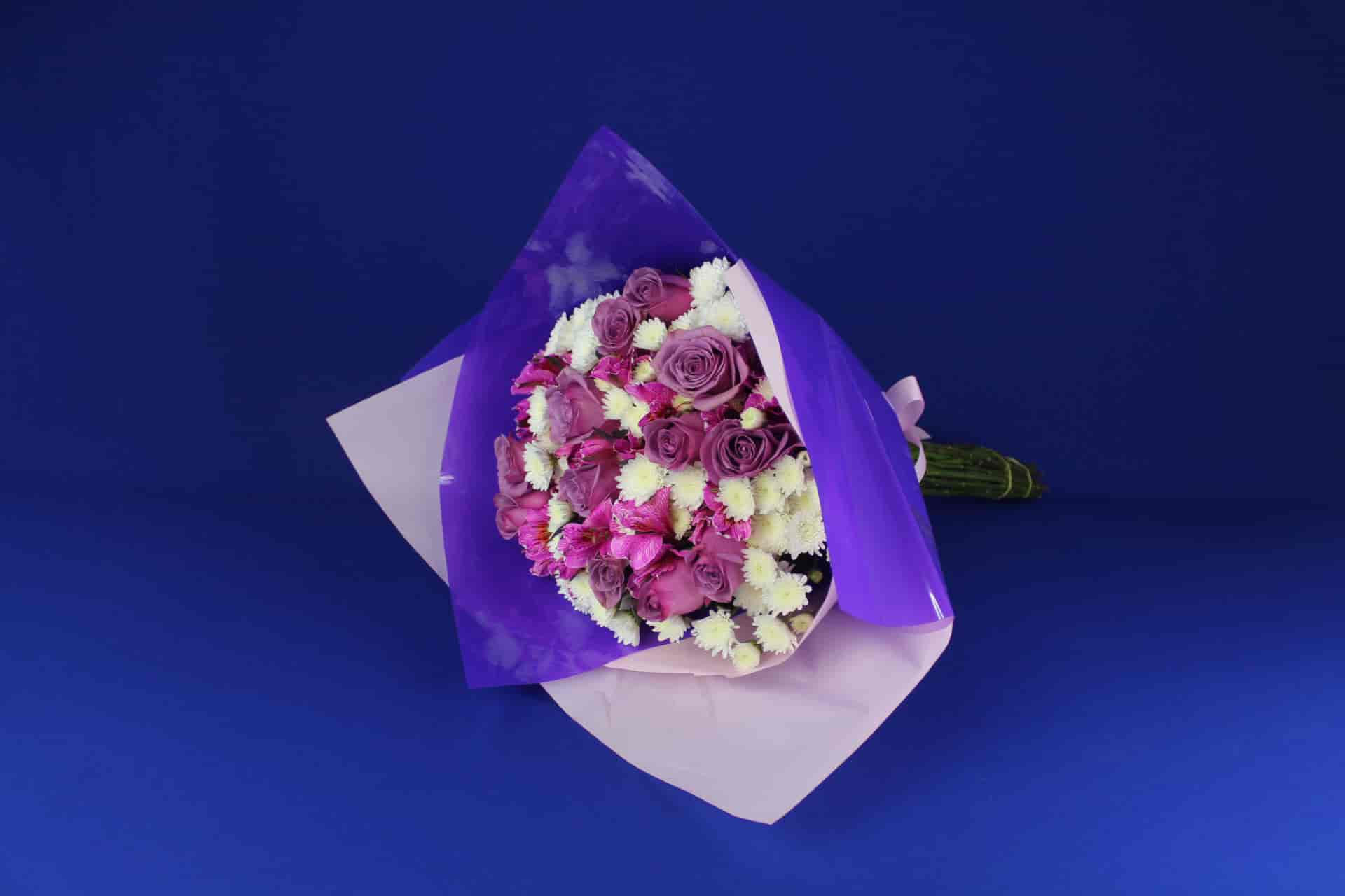 Hermoso ramo compuesto por 12 rosas, alstromerias pintadas y argentinas blancas.